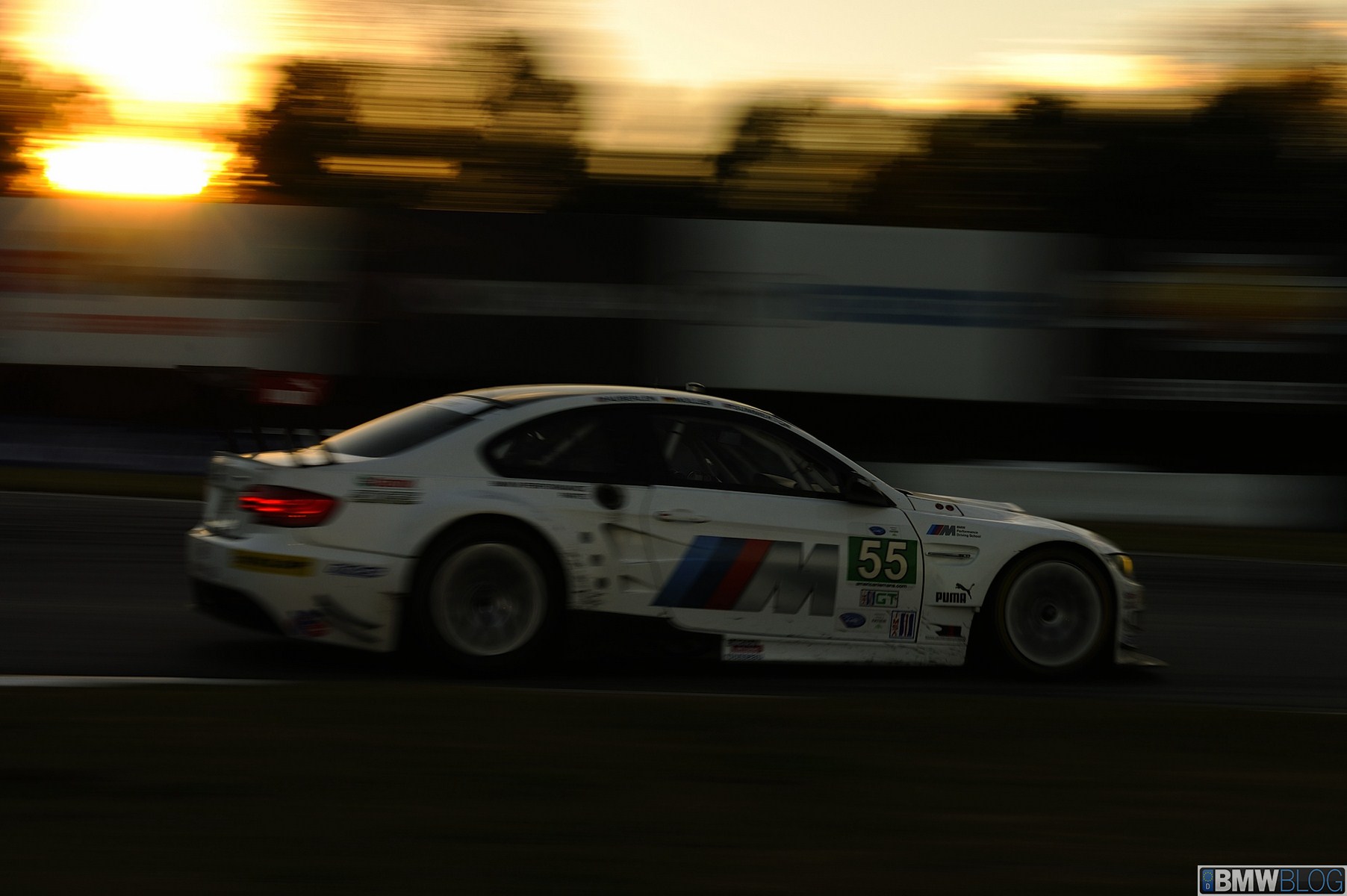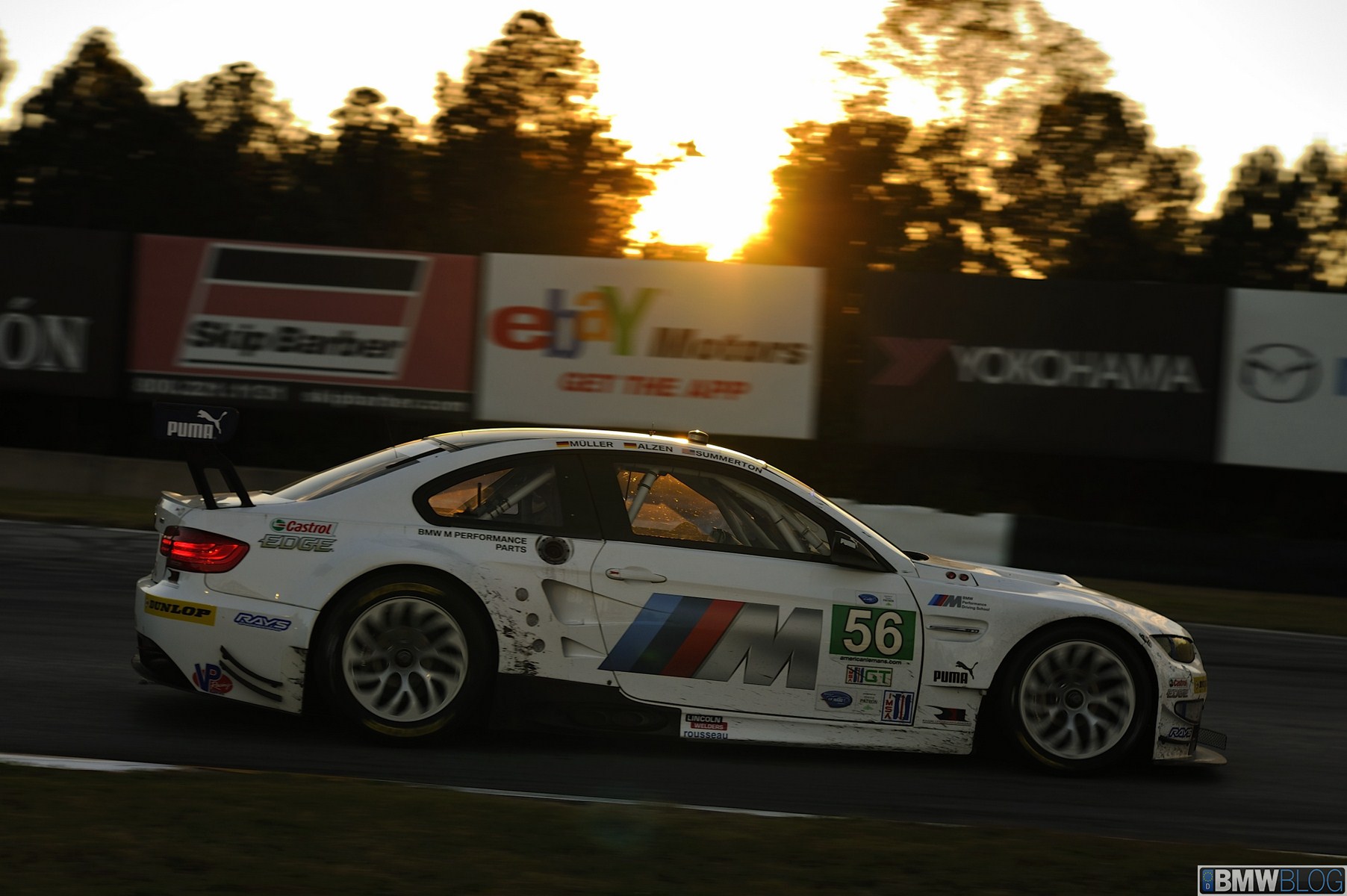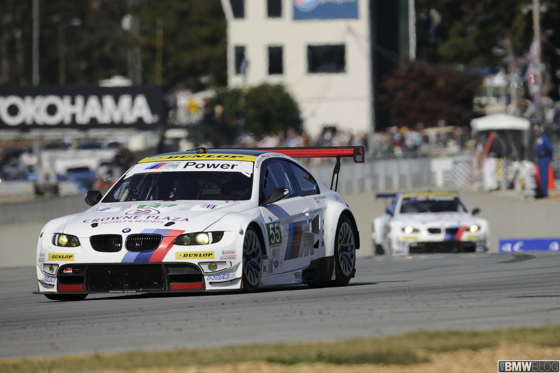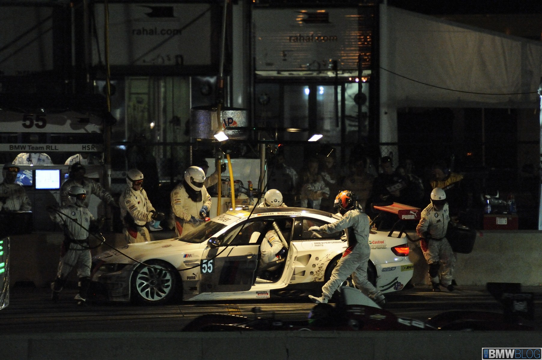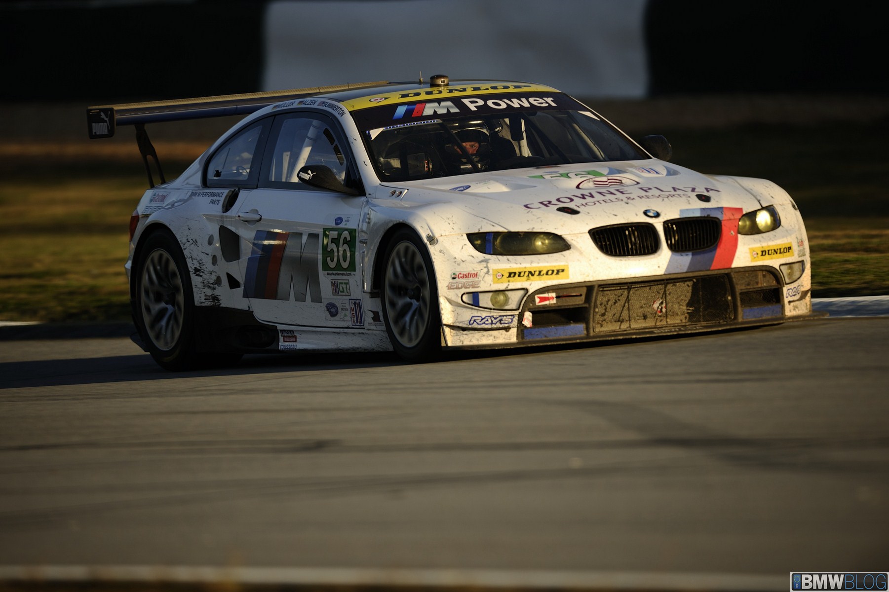 The race began with qualifying drivers Jörg Müller, in the No. 55 M3 GT, and Dirk Müller, in the No. 56 M3 GT, starting from the second and seventh positions respectively. The day quickly went sideways – literally – for the No. 56 car when it was hit by a prototype car on lap 12 and, after sliding through the gravel trap in turn 10, was forced to the pits to change a broken right front brake caliper. The repair took three laps and the No. 56 car crew, led by Bobby Rahal, began the long fight back from the rear of the field.