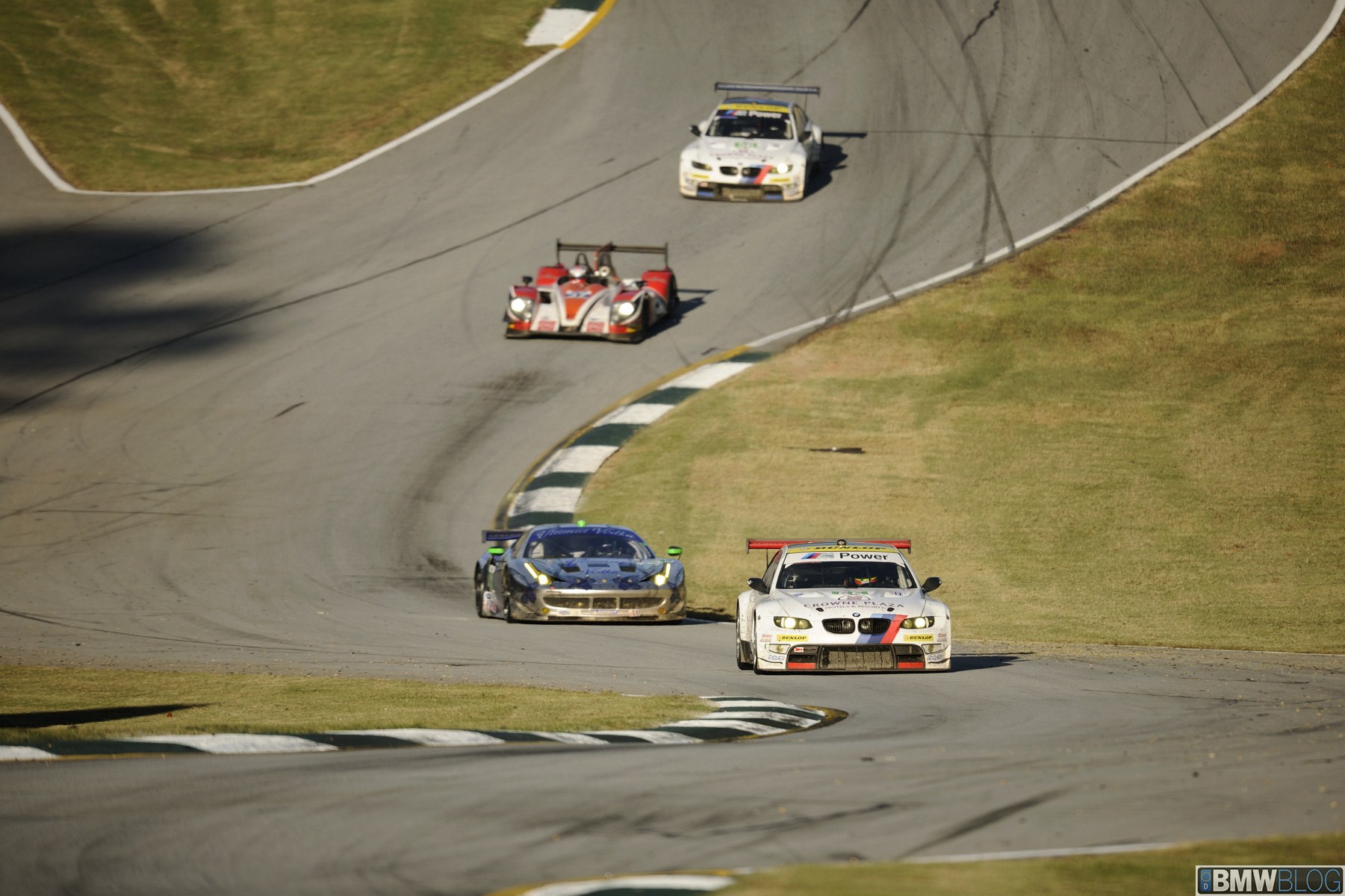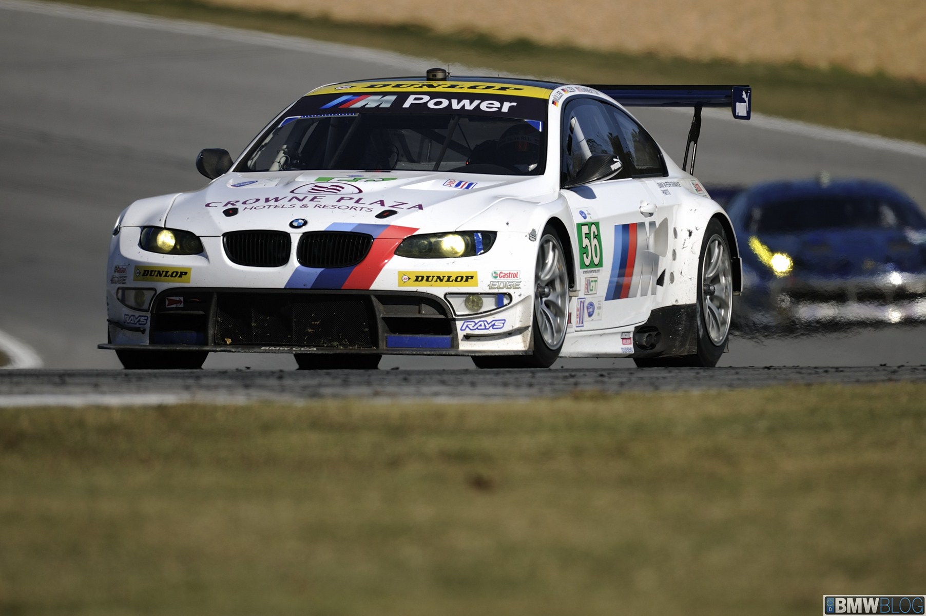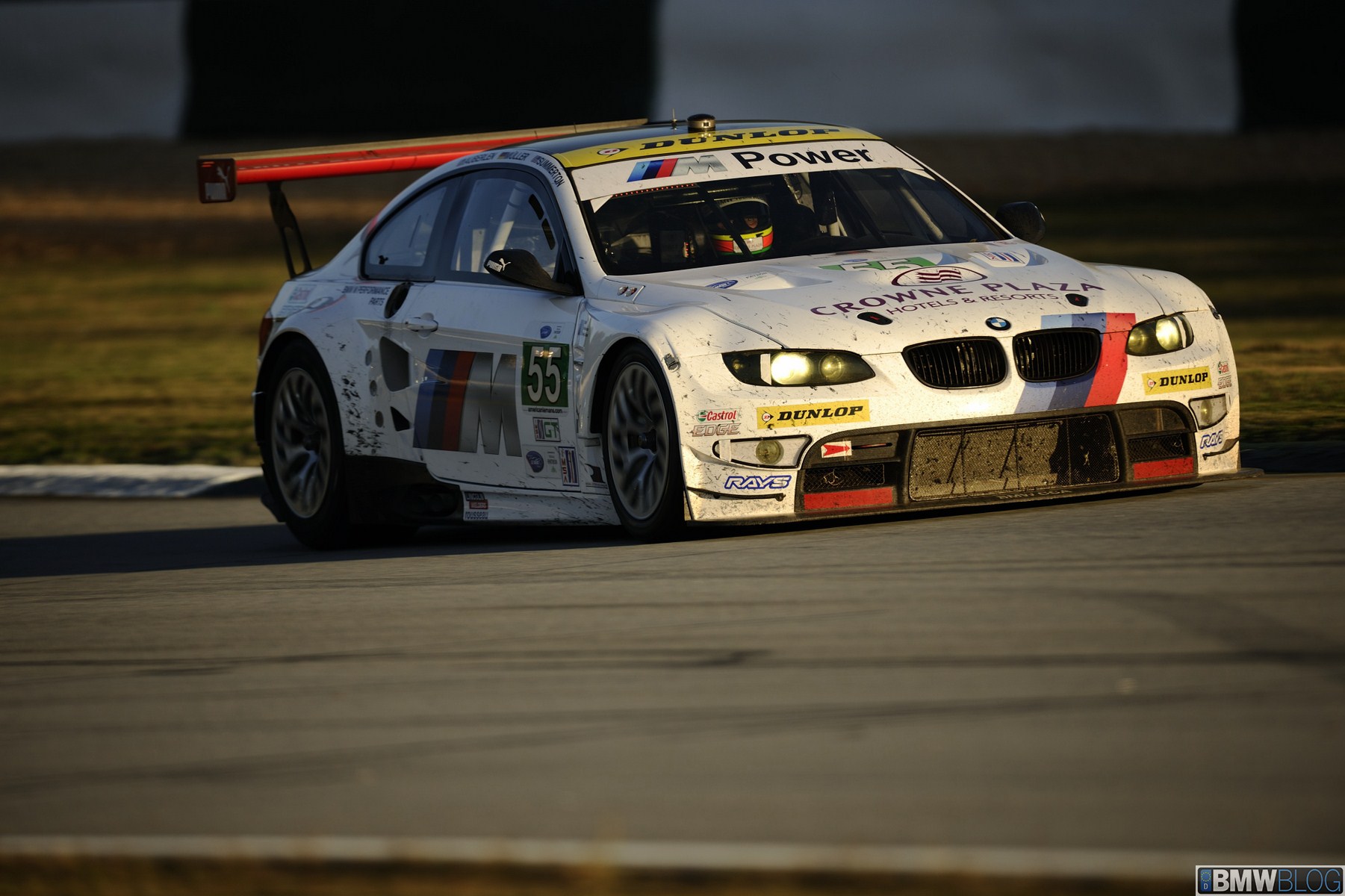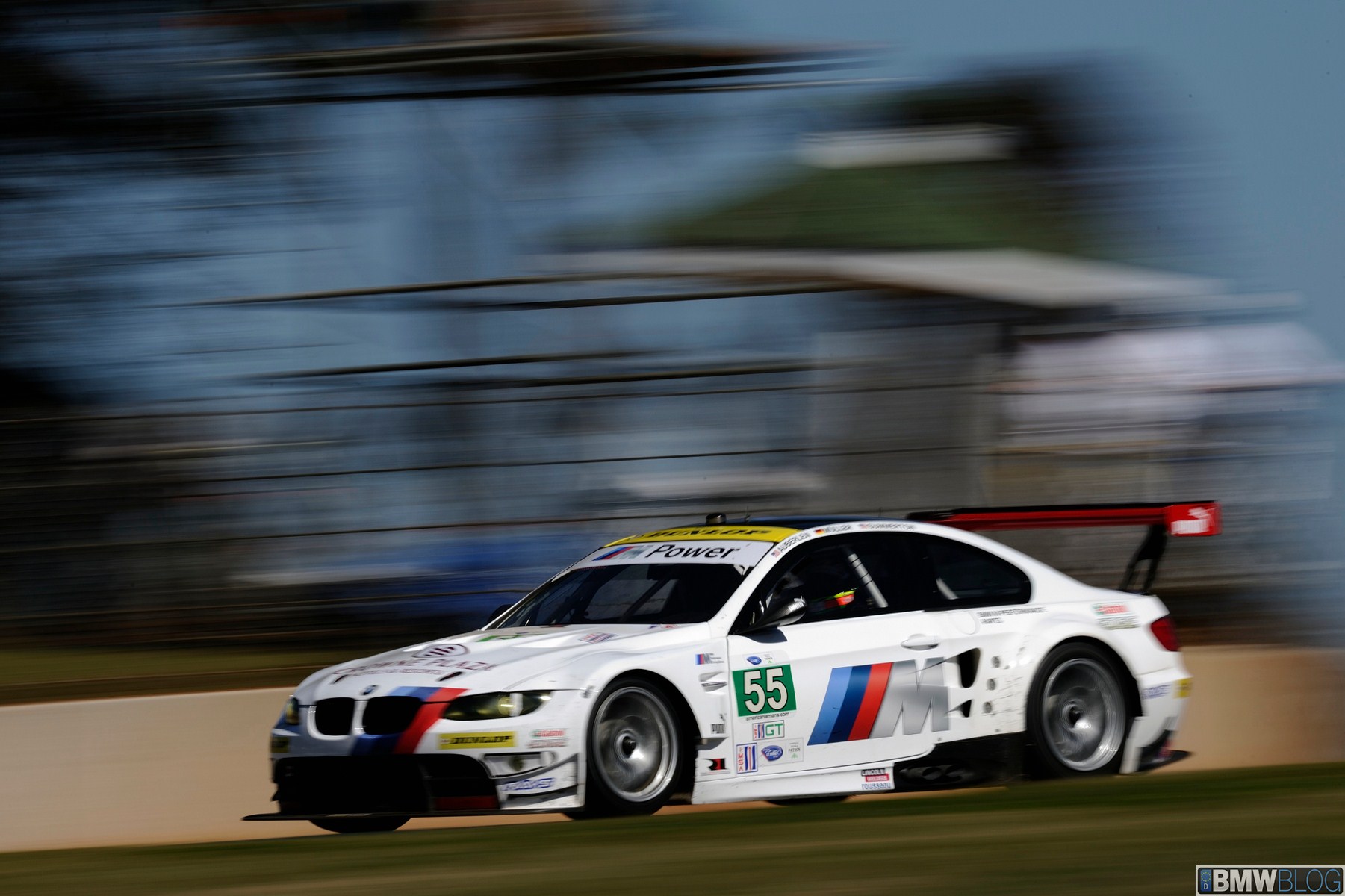 The race began with qualifying drivers Jörg Müller, in the No. 55 M3 GT, and Dirk Müller, in the No. 56 M3 GT, starting from the second and seventh positions respectively. The day quickly went sideways – literally – for the No. 56 car when it was hit by a prototype car on lap 12 and, after sliding through the gravel trap in turn 10, was forced to the pits to change a broken right front brake caliper. The repair took three laps and the No. 56 car crew, led by Bobby Rahal, began the long fight back from the rear of the field.