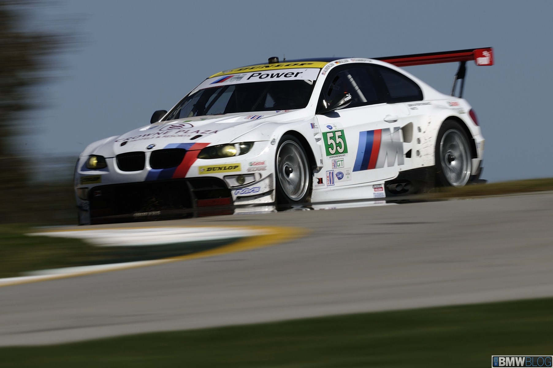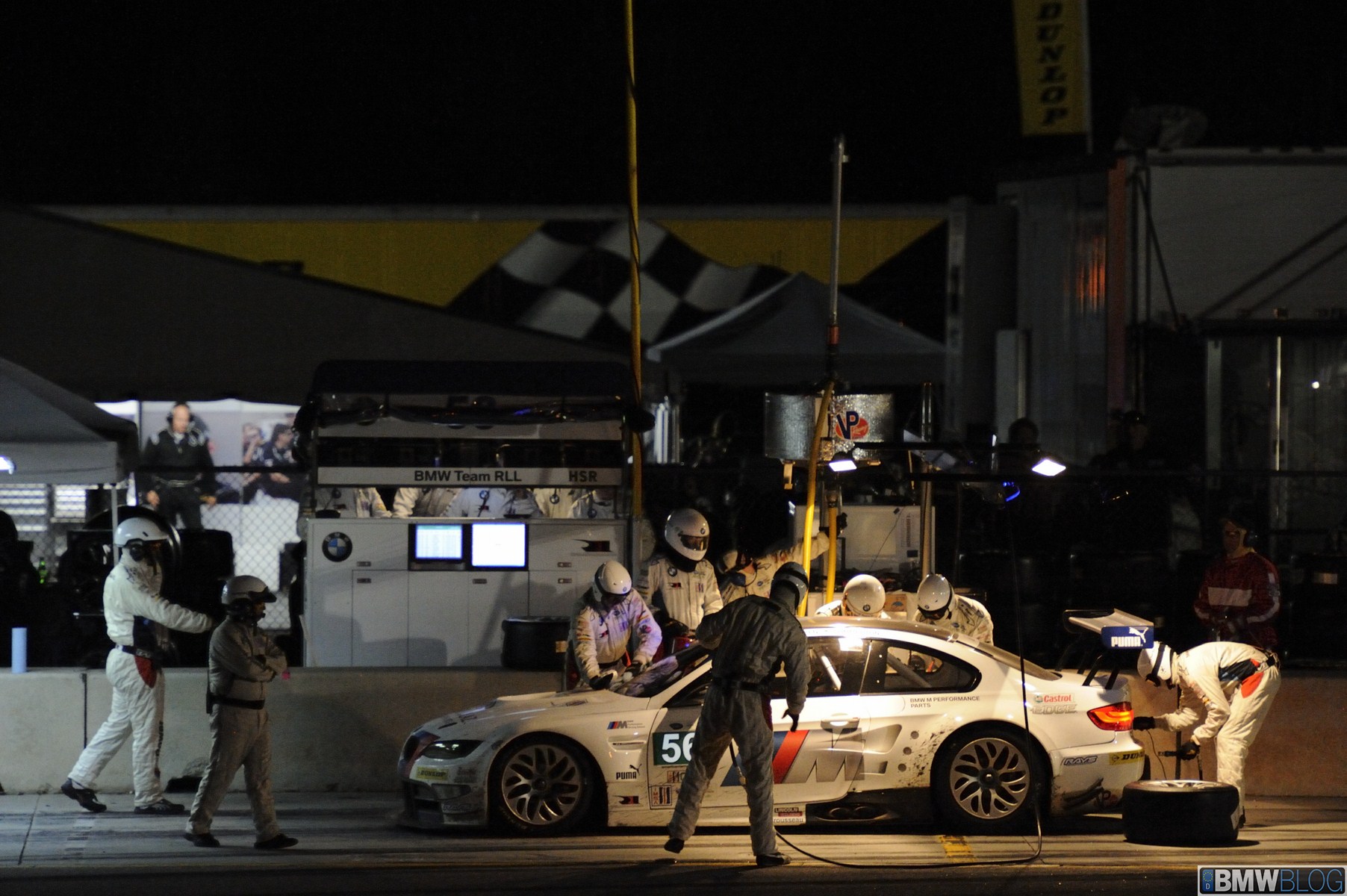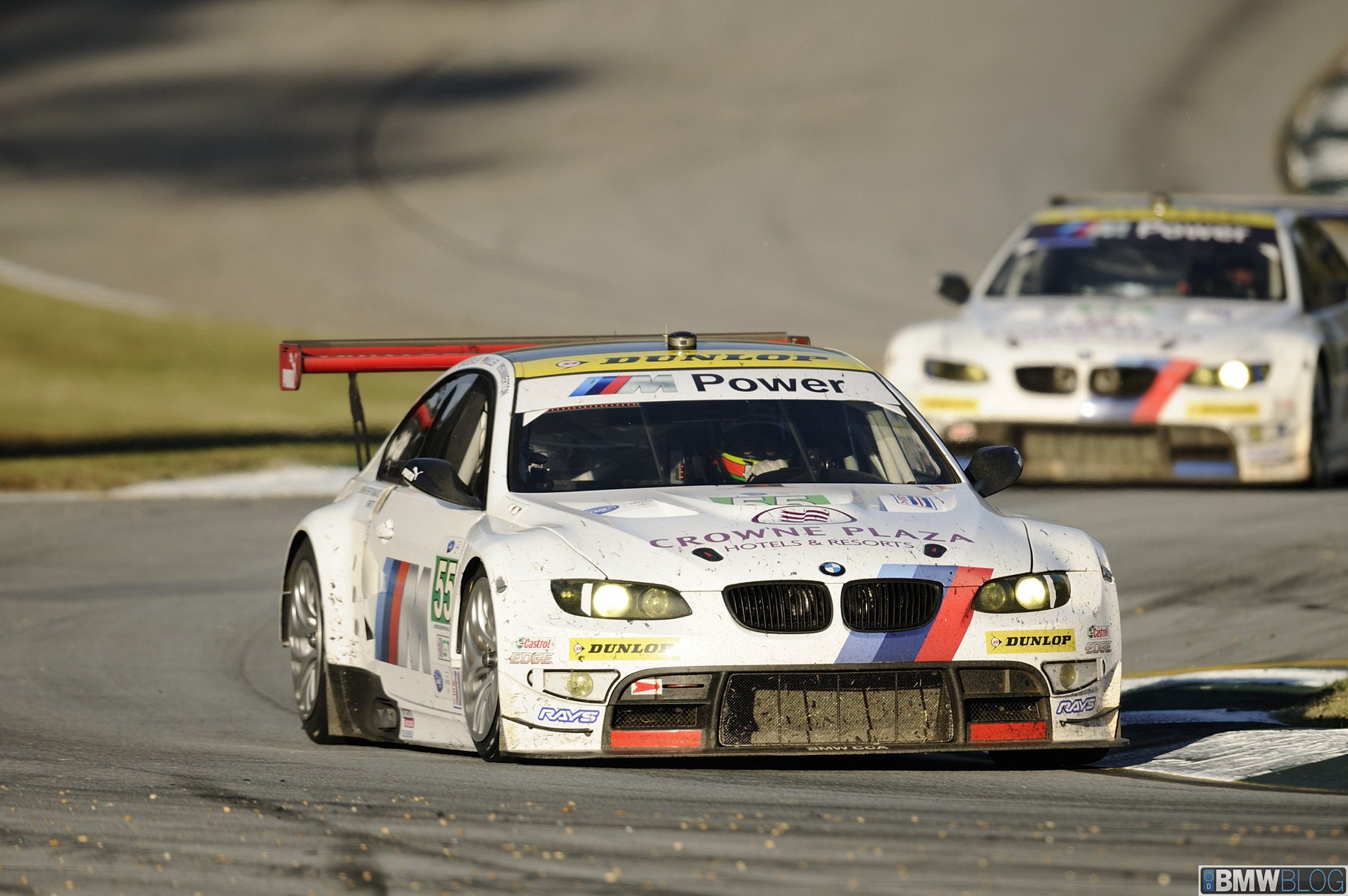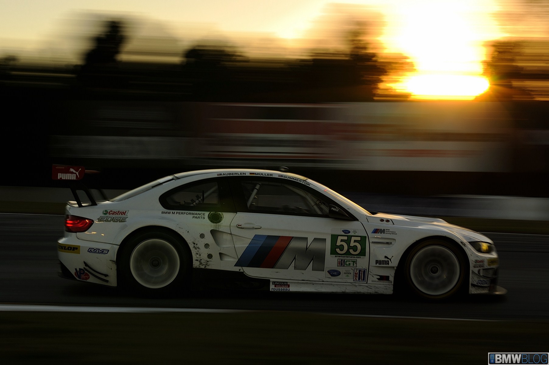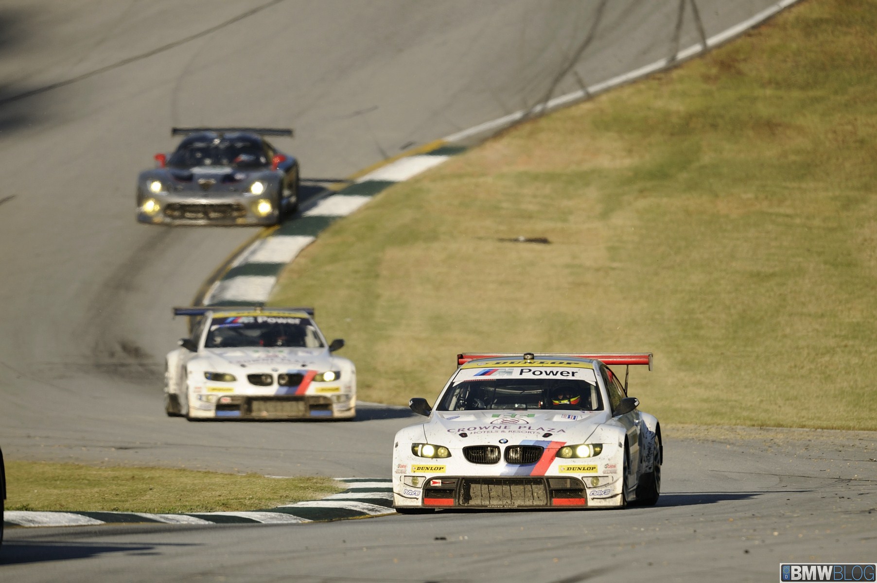 The race began with qualifying drivers Jörg Müller, in the No. 55 M3 GT, and Dirk Müller, in the No. 56 M3 GT, starting from the second and seventh positions respectively. The day quickly went sideways – literally – for the No. 56 car when it was hit by a prototype car on lap 12 and, after sliding through the gravel trap in turn 10, was forced to the pits to change a broken right front brake caliper. The repair took three laps and the No. 56 car crew, led by Bobby Rahal, began the long fight back from the rear of the field.