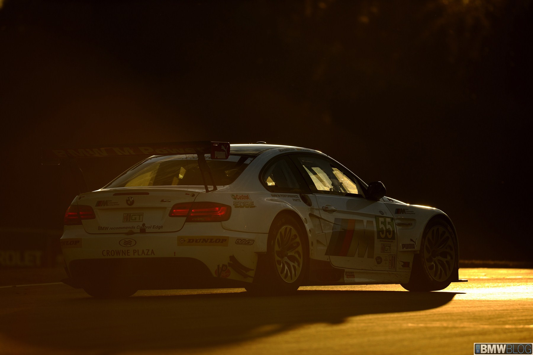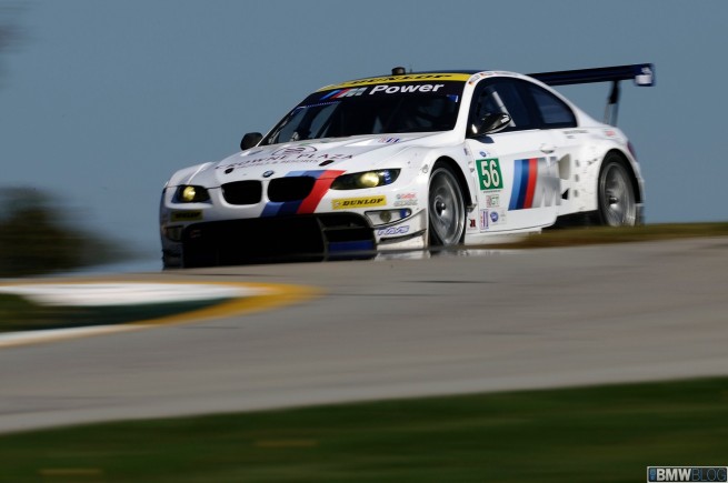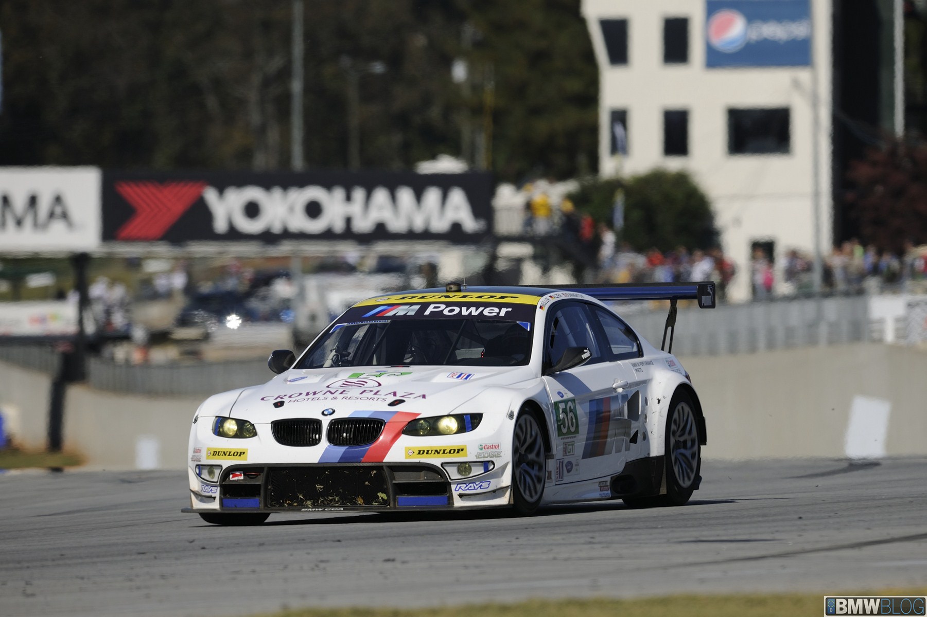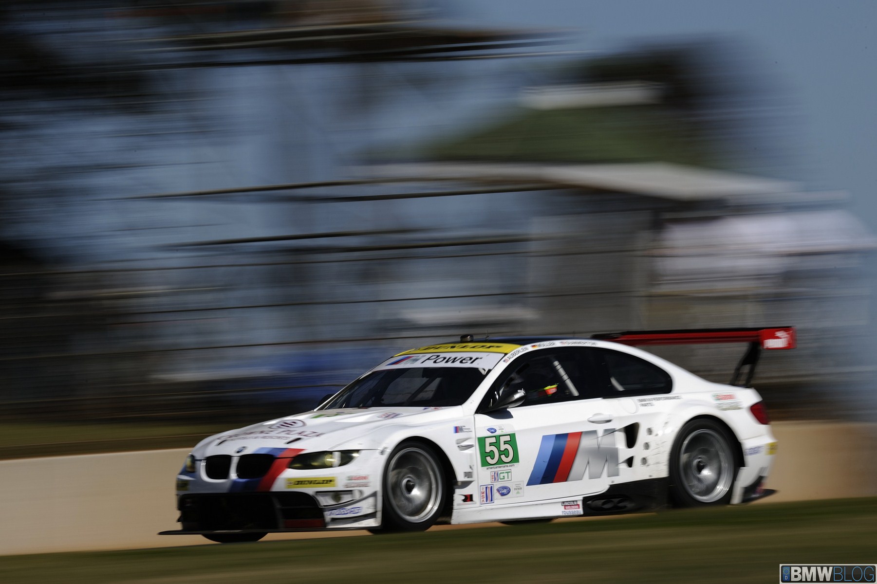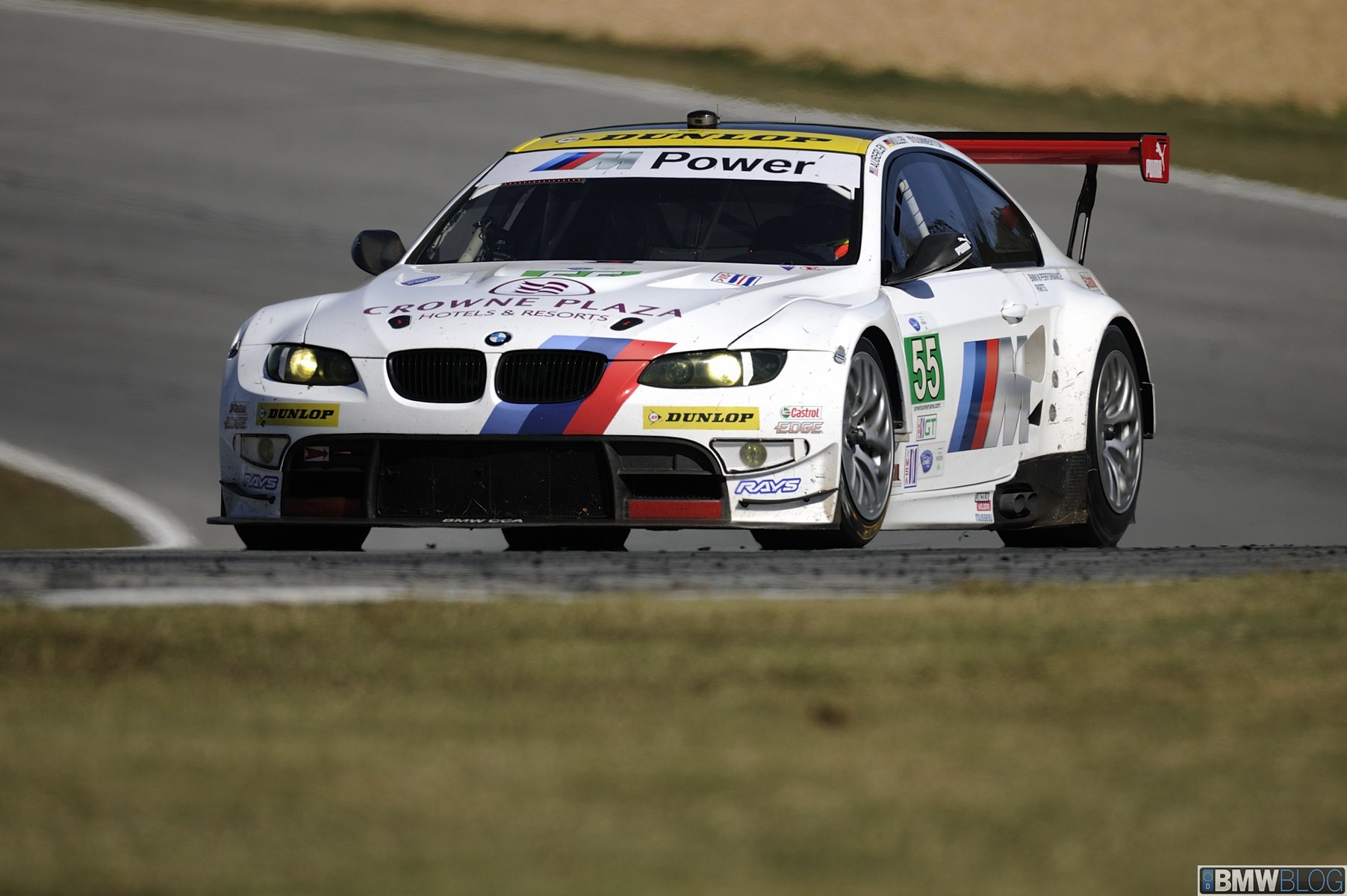 The race began with qualifying drivers Jörg Müller, in the No. 55 M3 GT, and Dirk Müller, in the No. 56 M3 GT, starting from the second and seventh positions respectively. The day quickly went sideways – literally – for the No. 56 car when it was hit by a prototype car on lap 12 and, after sliding through the gravel trap in turn 10, was forced to the pits to change a broken right front brake caliper. The repair took three laps and the No. 56 car crew, led by Bobby Rahal, began the long fight back from the rear of the field.