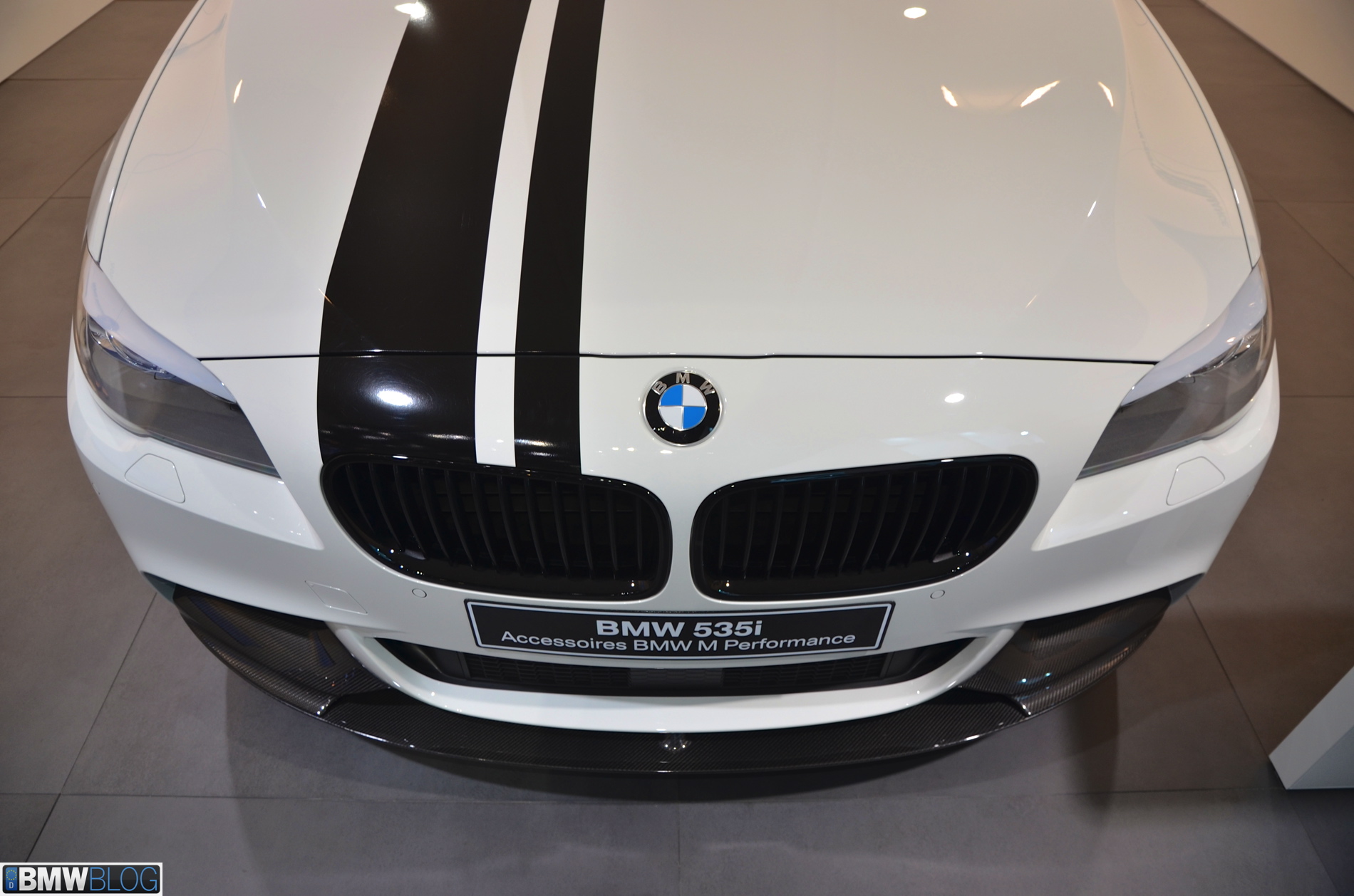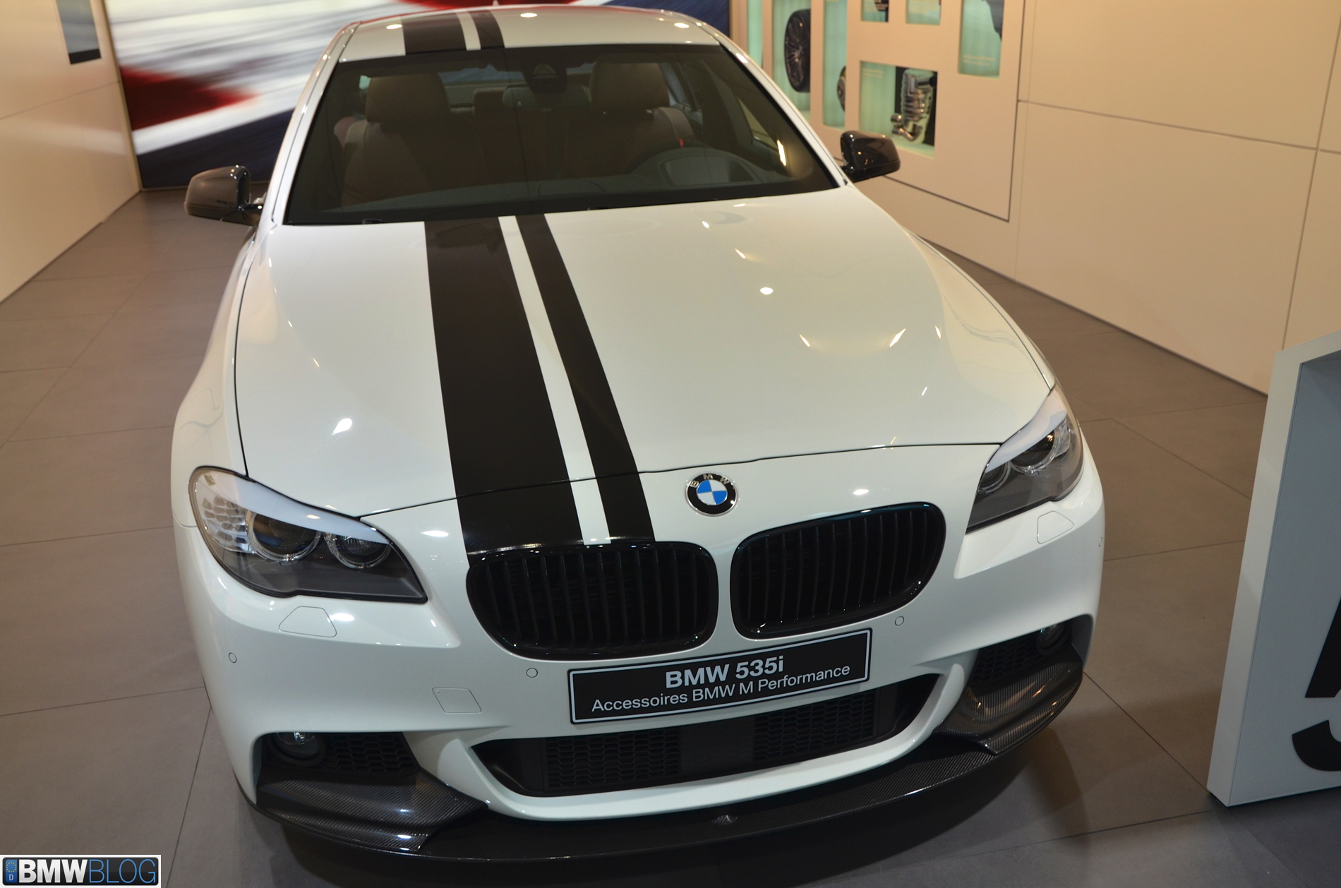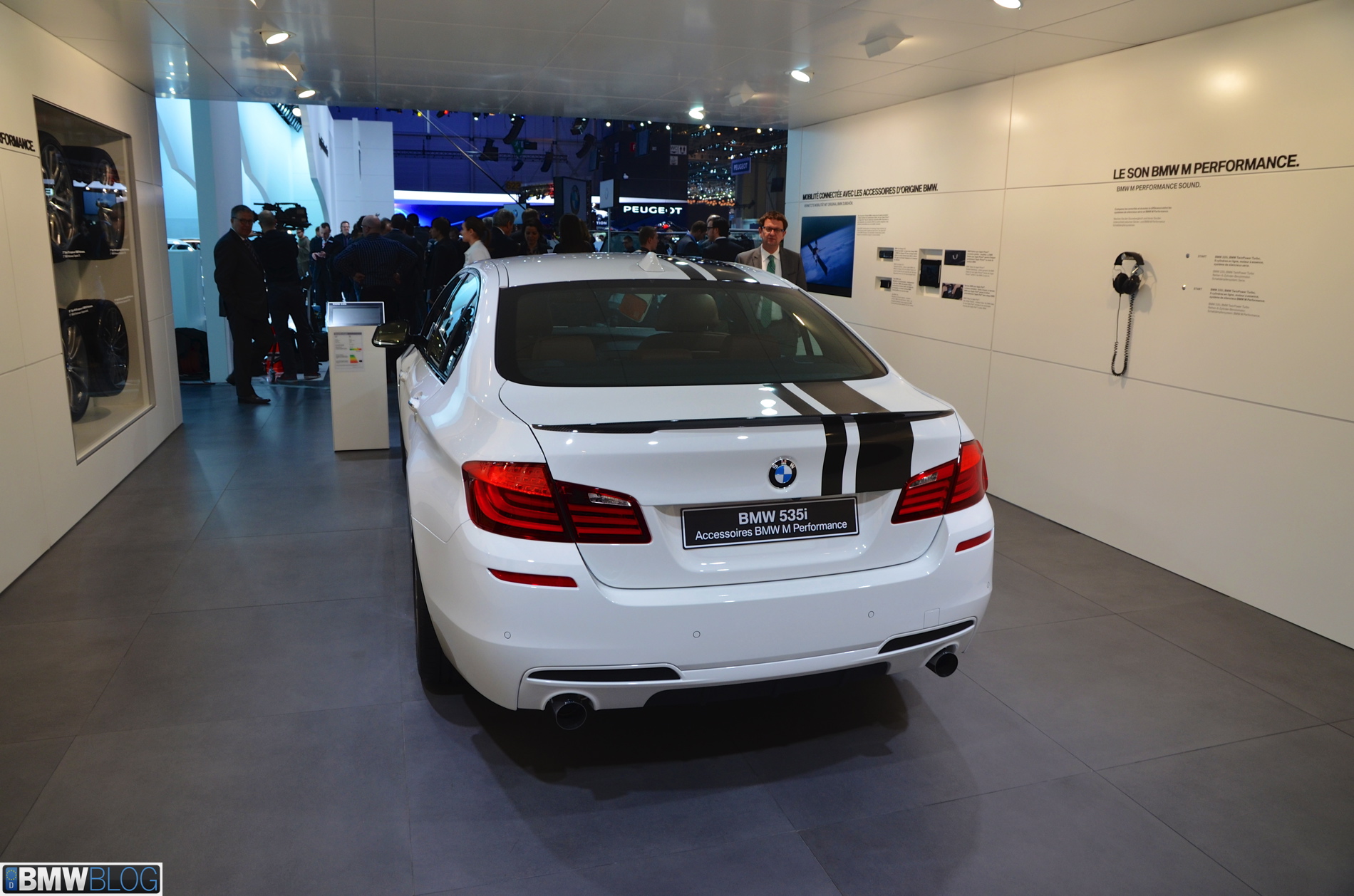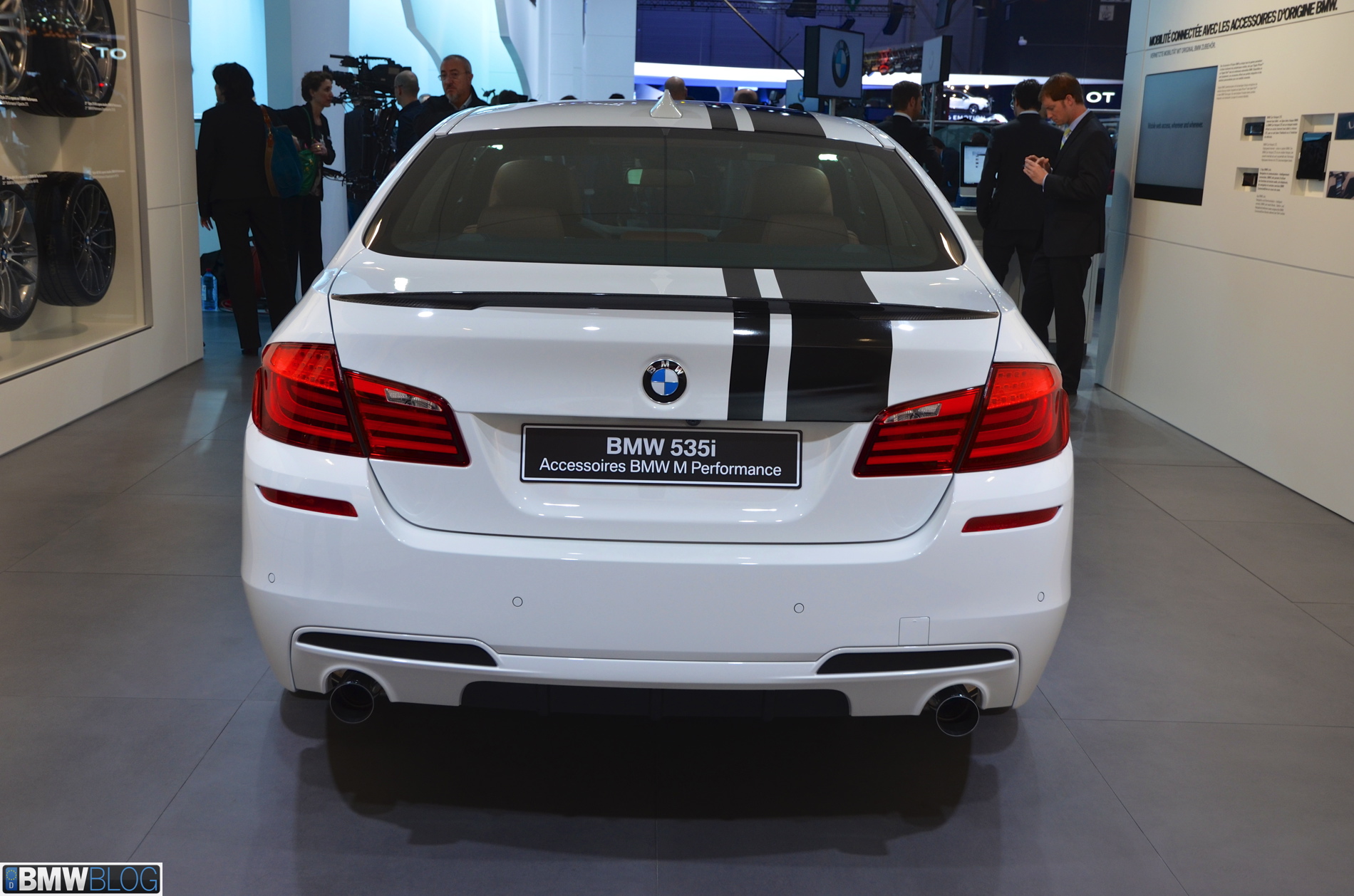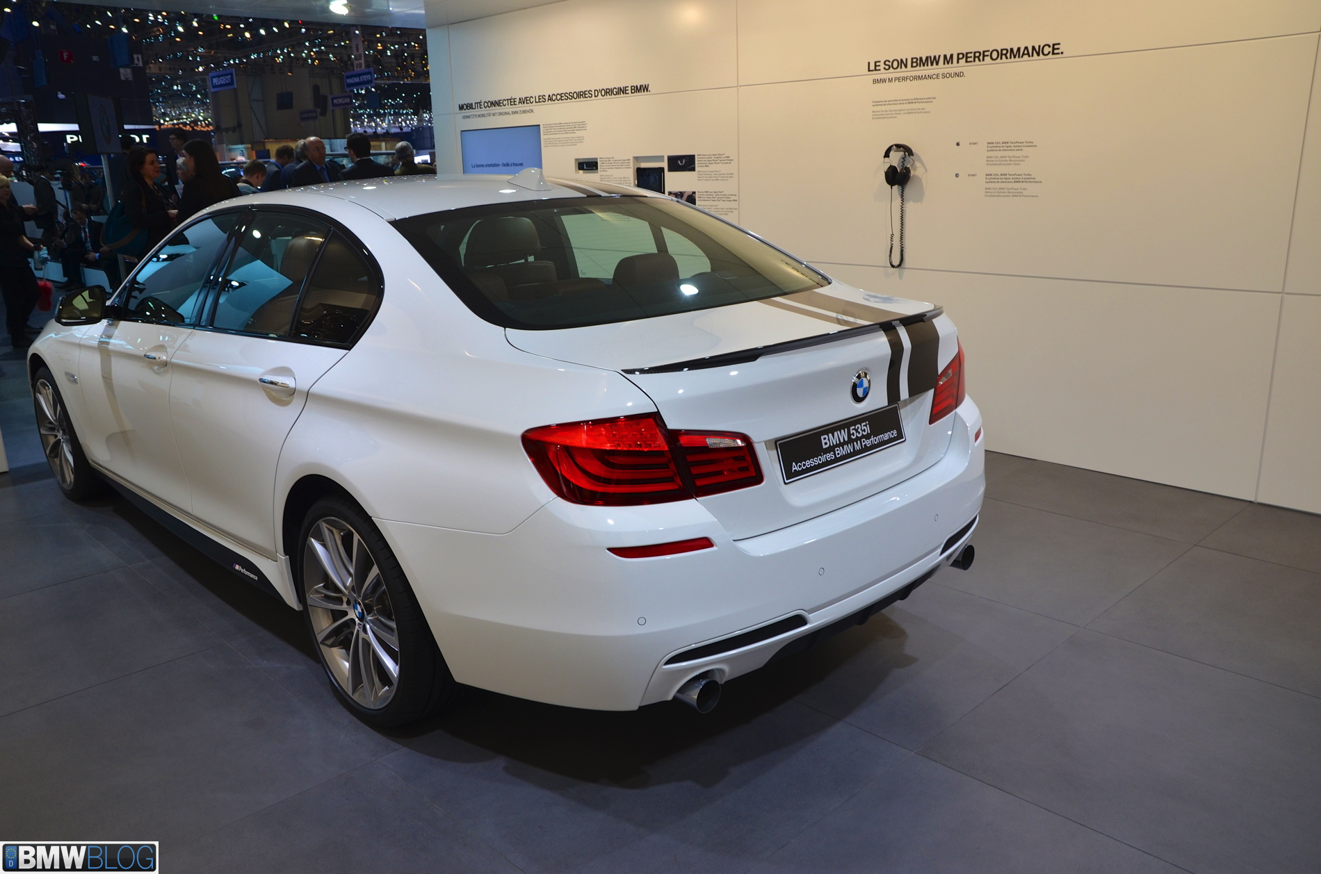 Somewhat hiden at the BMW stand in Geneva is a 535i M Performance model. The Alpine White 5 Series stands out with its black stripes and extensive use of carbon fiber. The BMW M Performance Parts have been developed in close collaboration with M division and each component goes through an intensive development and manufacturing process. Exclusive chassis, aerodynamic, cockpit and powertrain components are made available for the 3 Series and 5 Series.