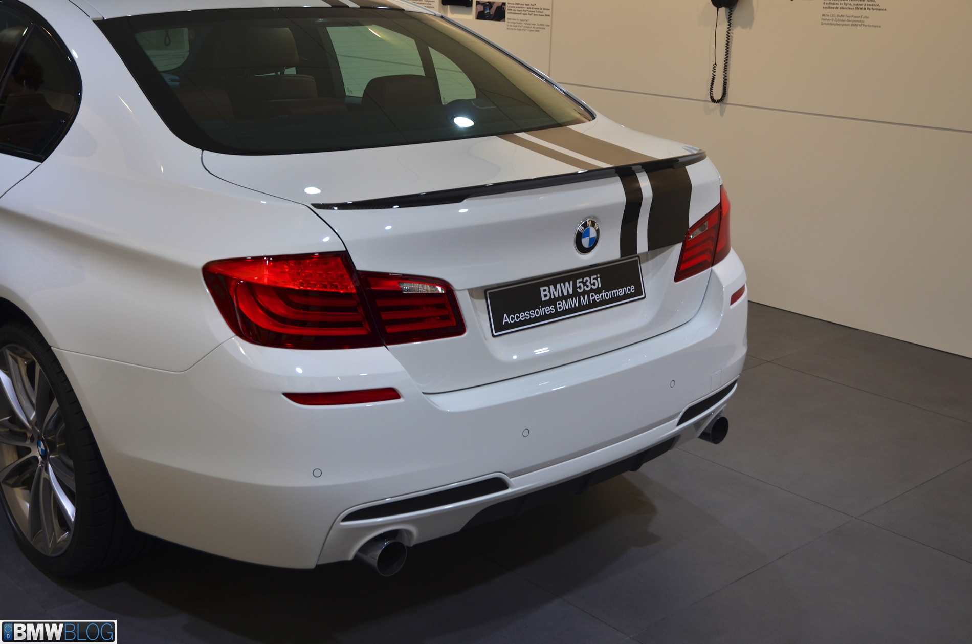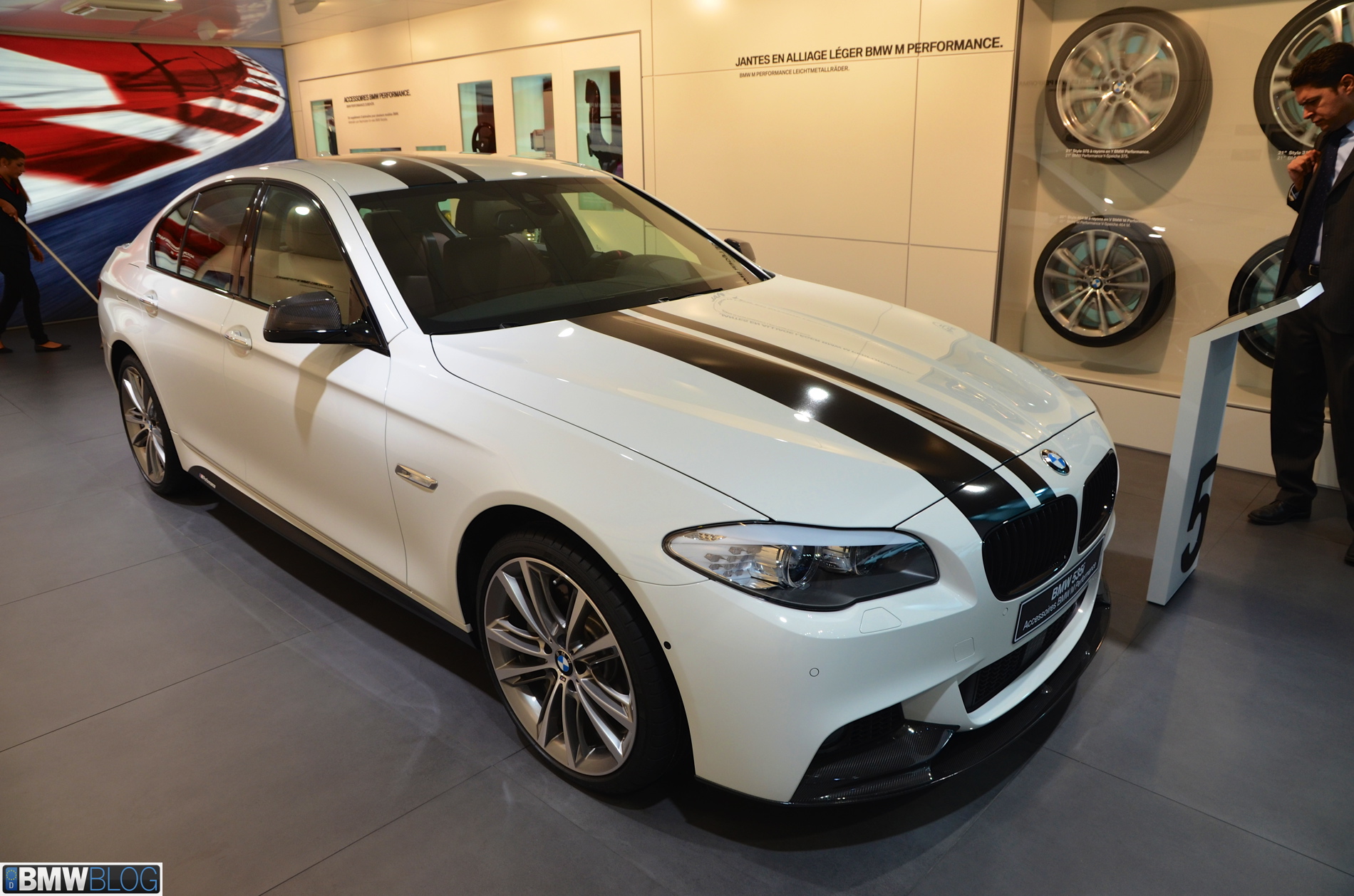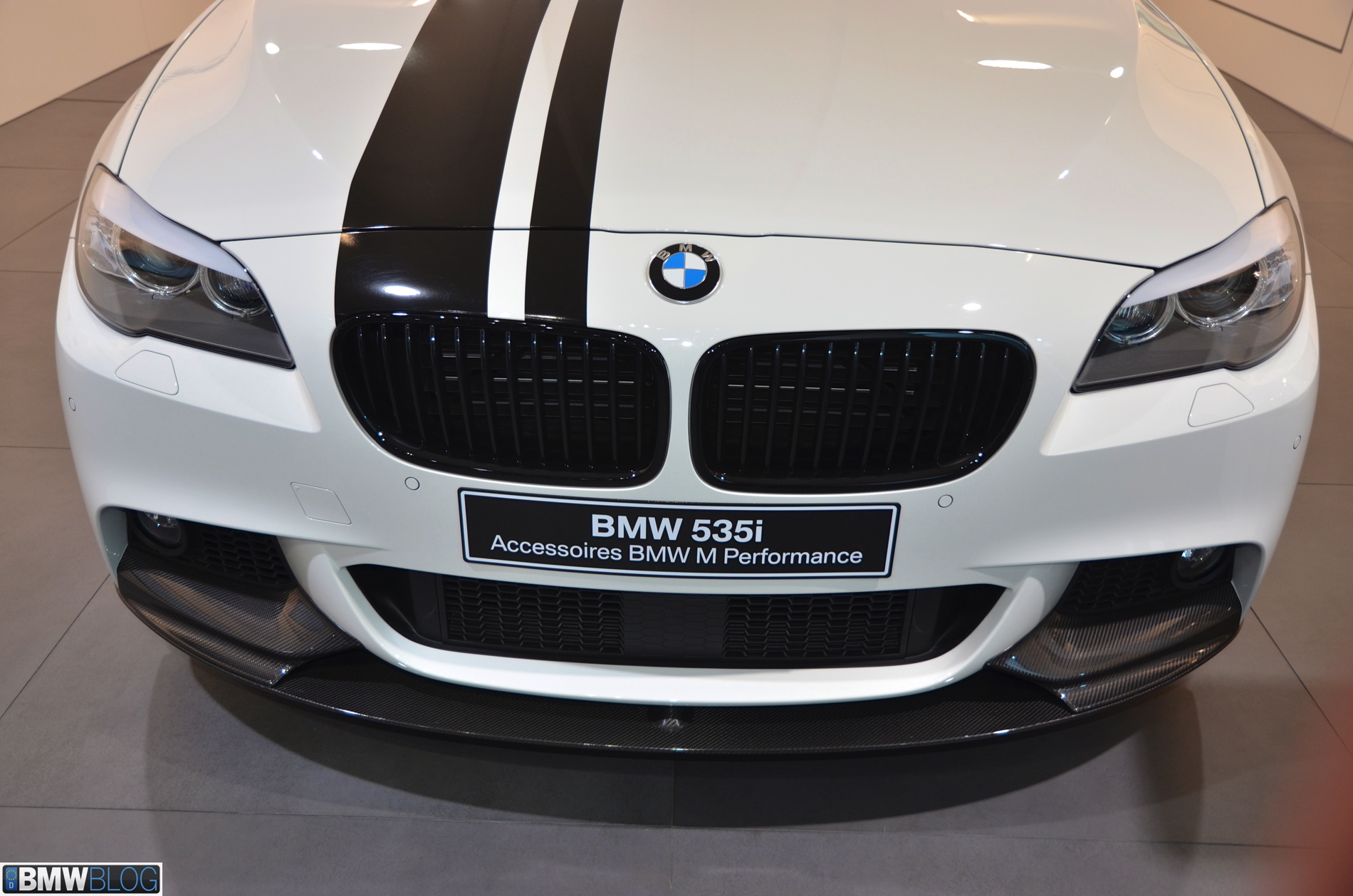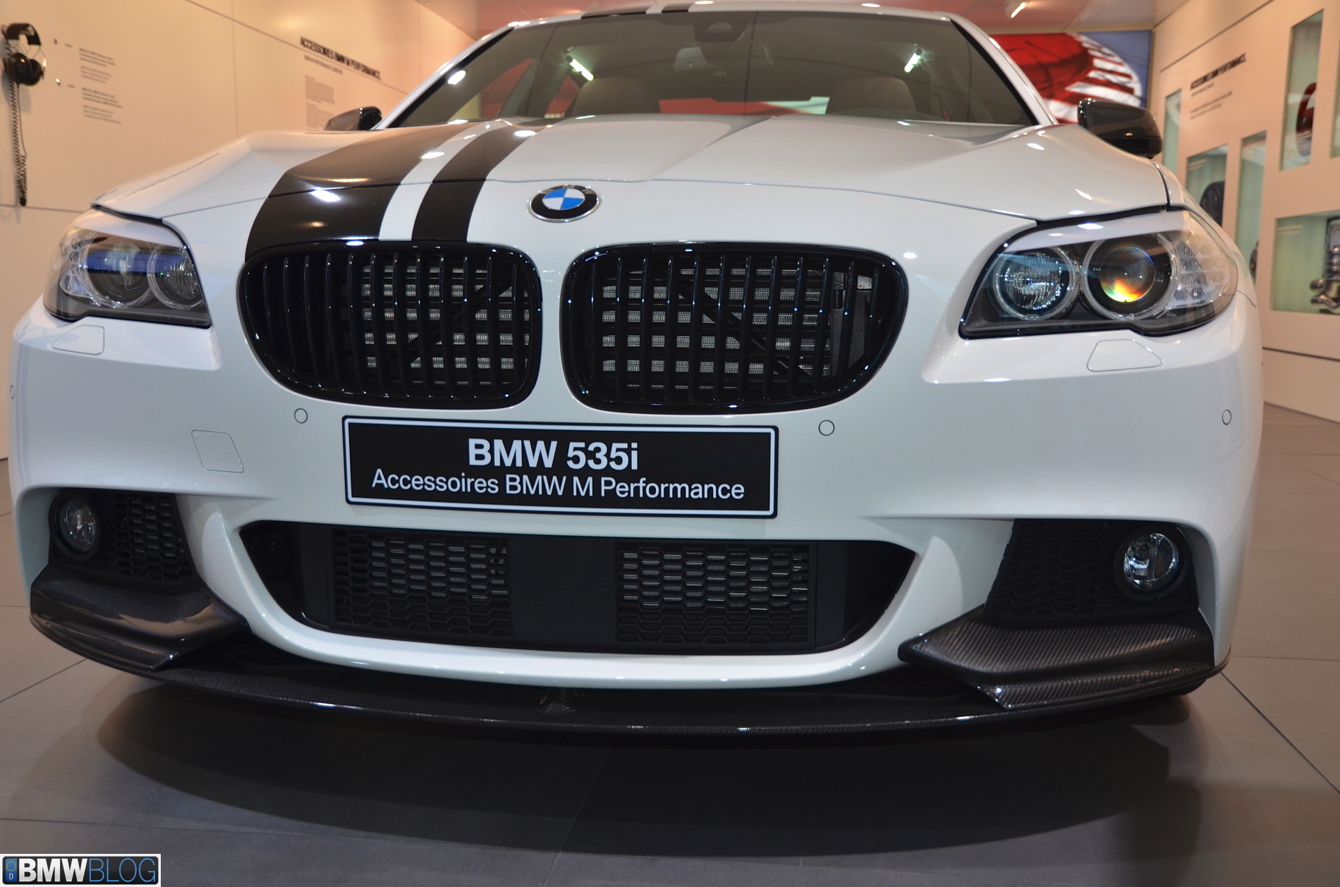 Somewhat hiden at the BMW stand in Geneva is a 535i M Performance model. The Alpine White 5 Series stands out with its black stripes and extensive use of carbon fiber. The BMW M Performance Parts have been developed in close collaboration with M division and each component goes through an intensive development and manufacturing process. Exclusive chassis, aerodynamic, cockpit and powertrain components are made available for the 3 Series and 5 Series.
