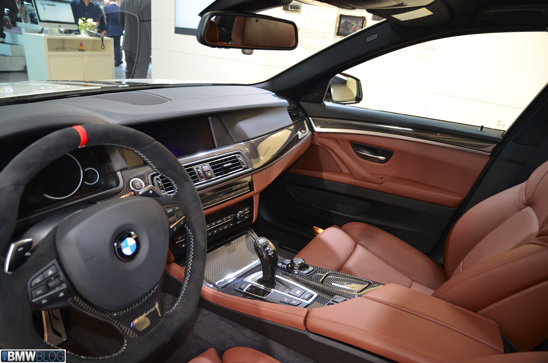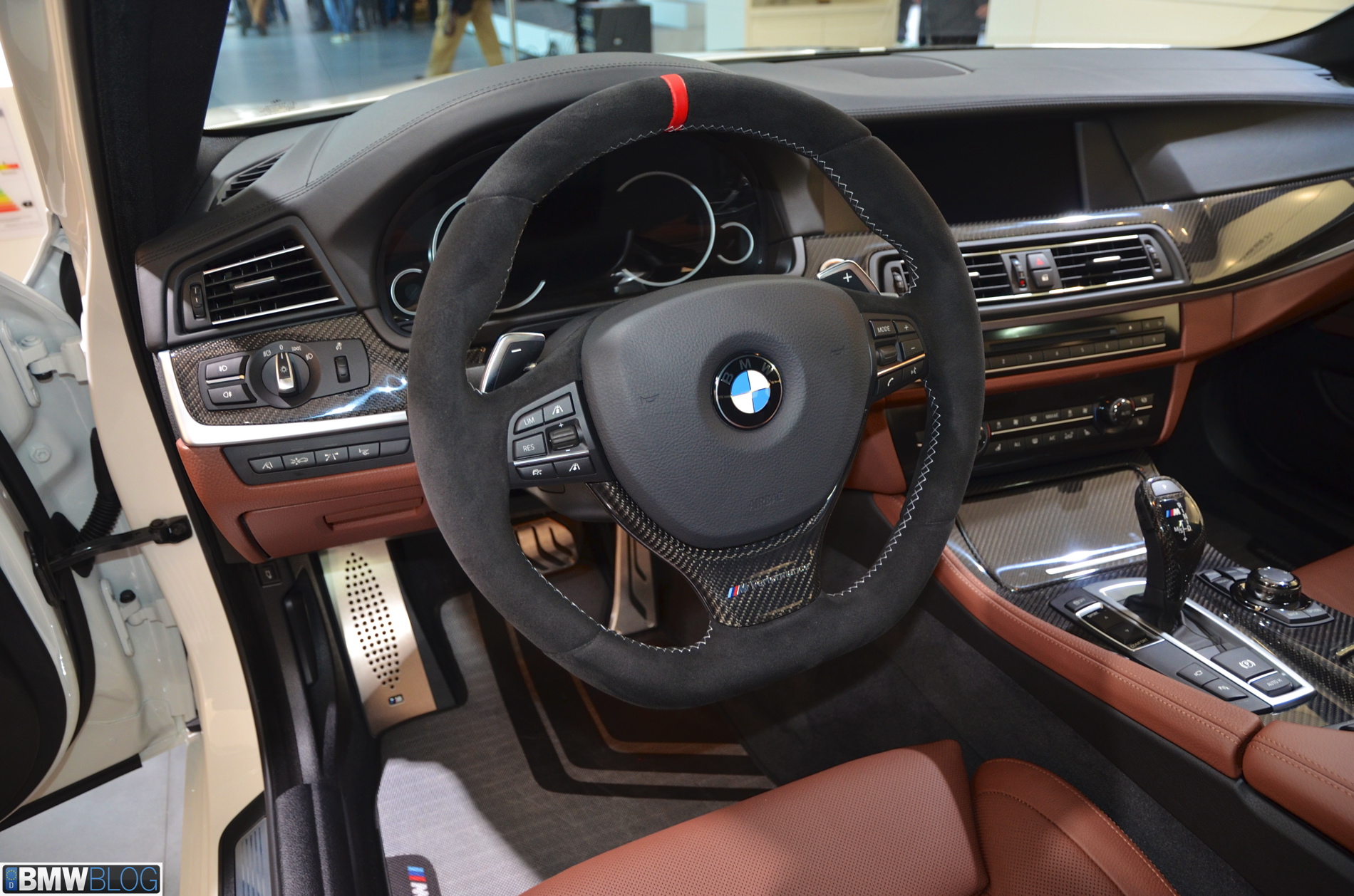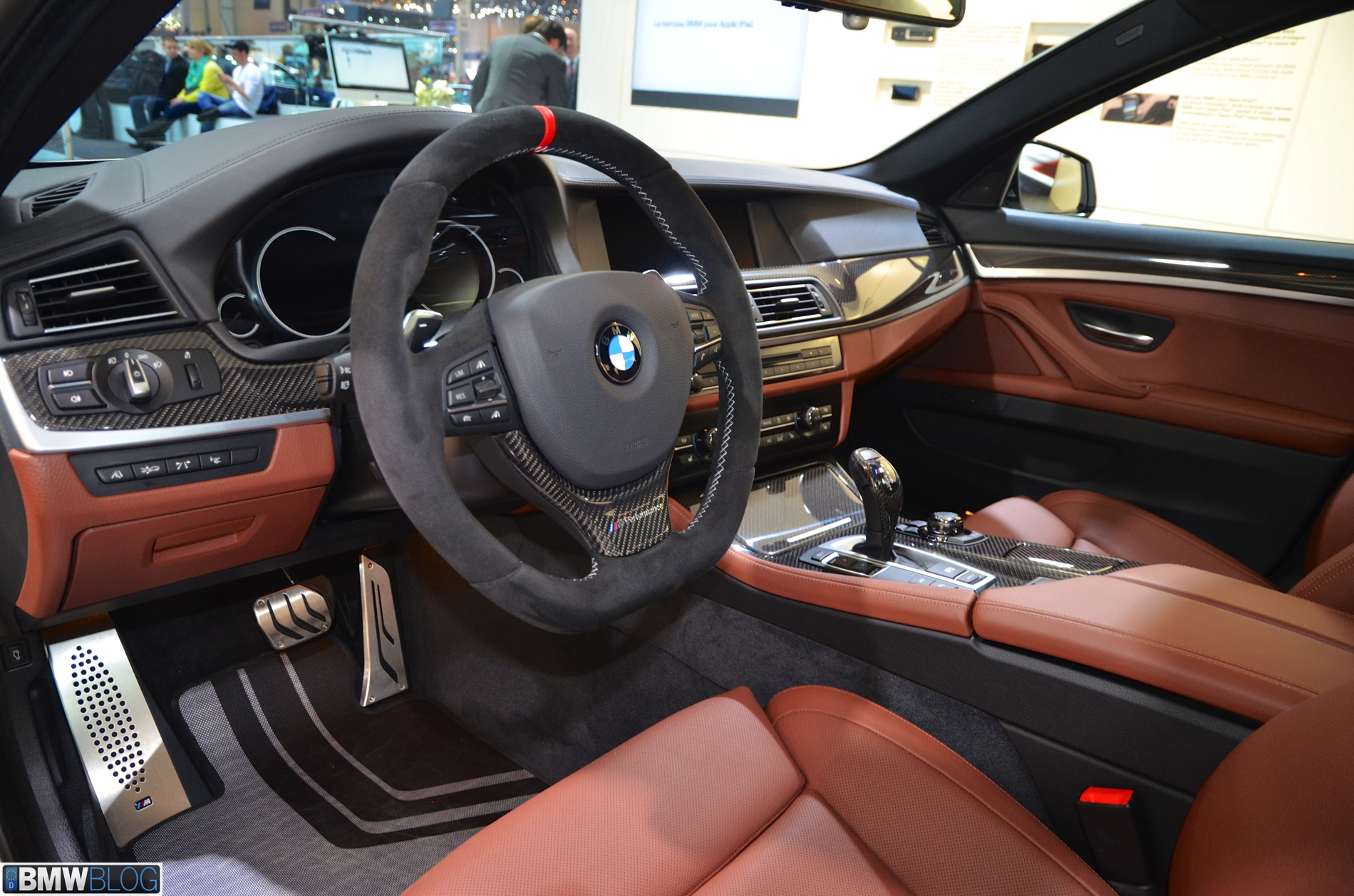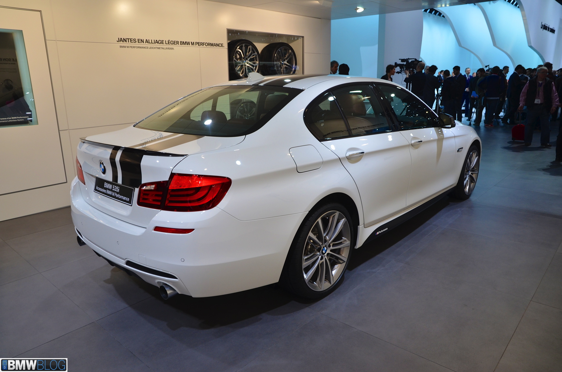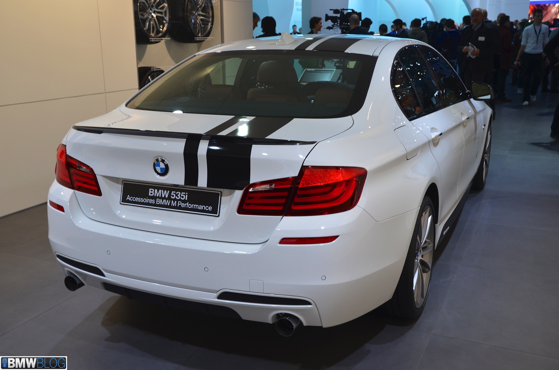 Somewhat hiden at the BMW stand in Geneva is a 535i M Performance model. The Alpine White 5 Series stands out with its black stripes and extensive use of carbon fiber. The BMW M Performance Parts have been developed in close collaboration with M division and each component goes through an intensive development and manufacturing process. Exclusive chassis, aerodynamic, cockpit and powertrain components are made available for the 3 Series and 5 Series.