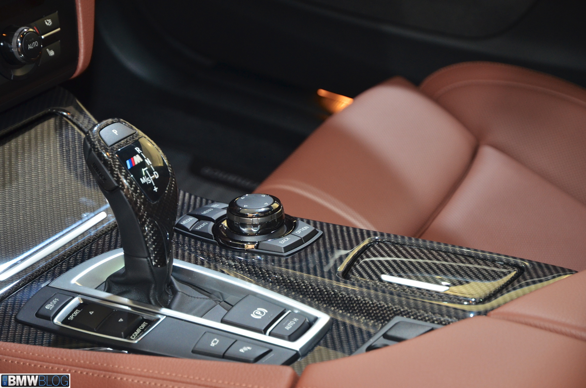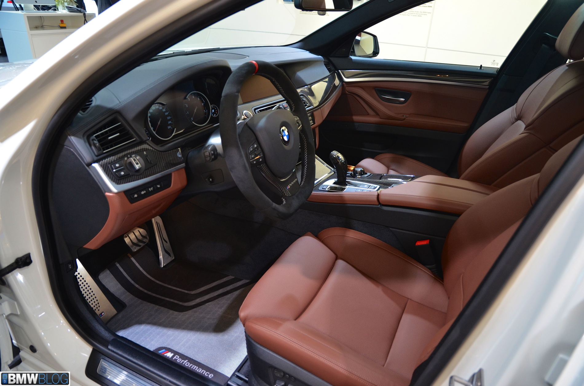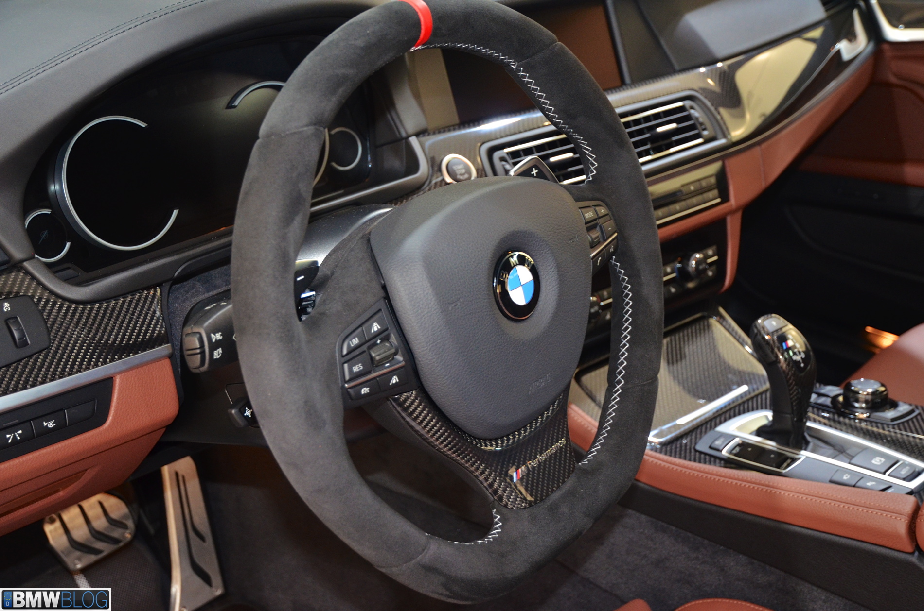 On the 5 Series, the non-electronic M Performance Steering Wheel is vailable, featuring a flat-bottom rim and covered in Alcantara. A red quick-index stripe is located at the 12 O’clock location, and the wheel is finished with a carbon fiber insert with chrome BMW M Performance inlay.