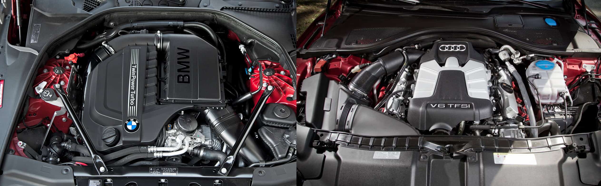 Both cars utilize boosted six cylinder engines with direct fuel injection. The BMW utilizes a twin-scroll turbo, VANOS, Valvetronic and inline cylinders while the Audi uses an Eaton supercharger and variable valve timing on a 90 degree V6.