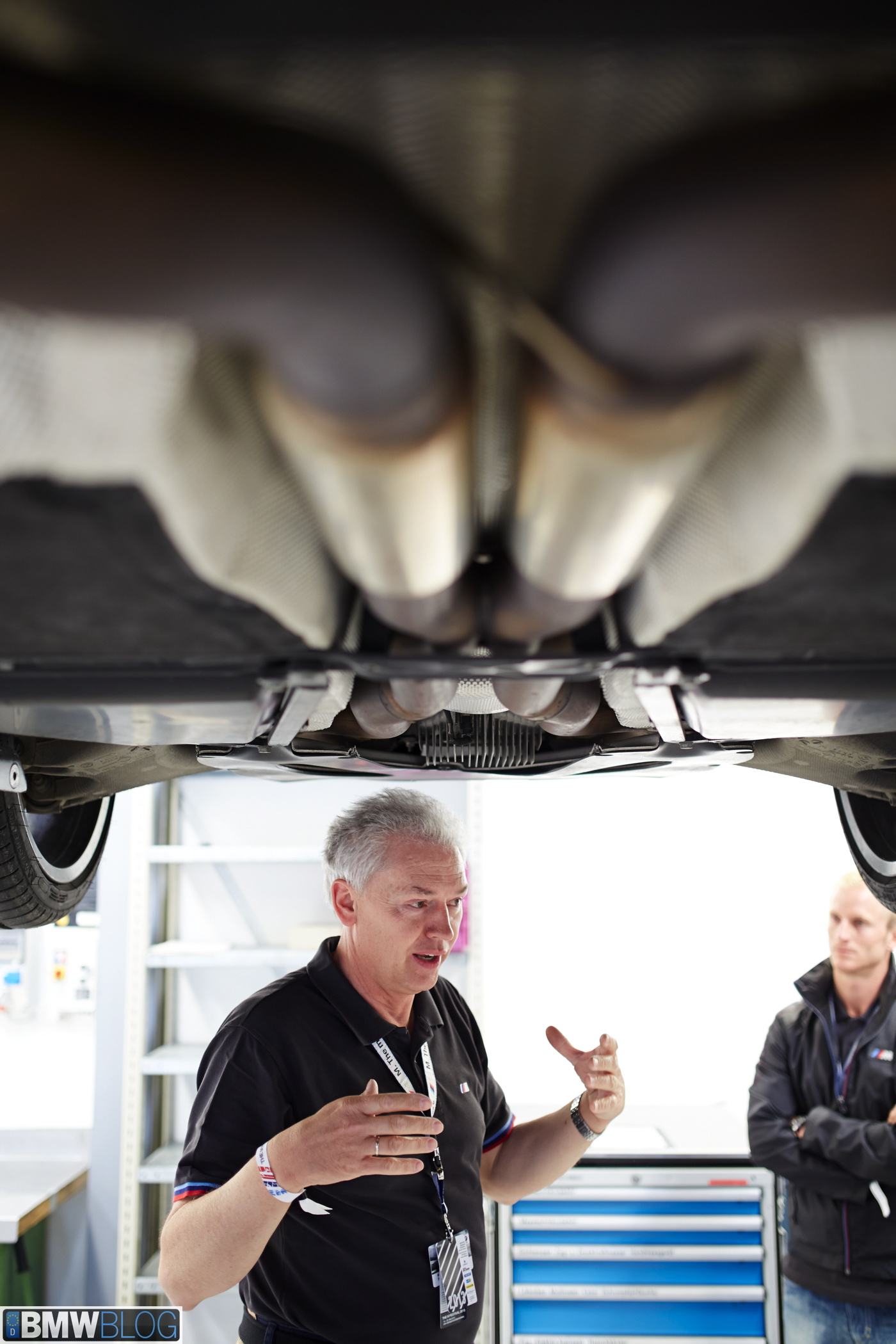 While under the car we took a closer look also at the sport exhaust system featuring customary M twin tailpipes in black chrome. An interesting tidbit that came out of the workshop is the process of replacing the ceramic brakes. Compared to “regular” brakes, the ceramic brakes give no physical indication when they need to be replaced. The brakes need to be weighted and if the difference in weight is above 140 grams compares to its original state, the mechanics will have to replace them. Biermann also said that despite the high price on the ceramic brakes many German customers have been ordering them in order to cope with the 300 km/h speeds on the Autobahn.