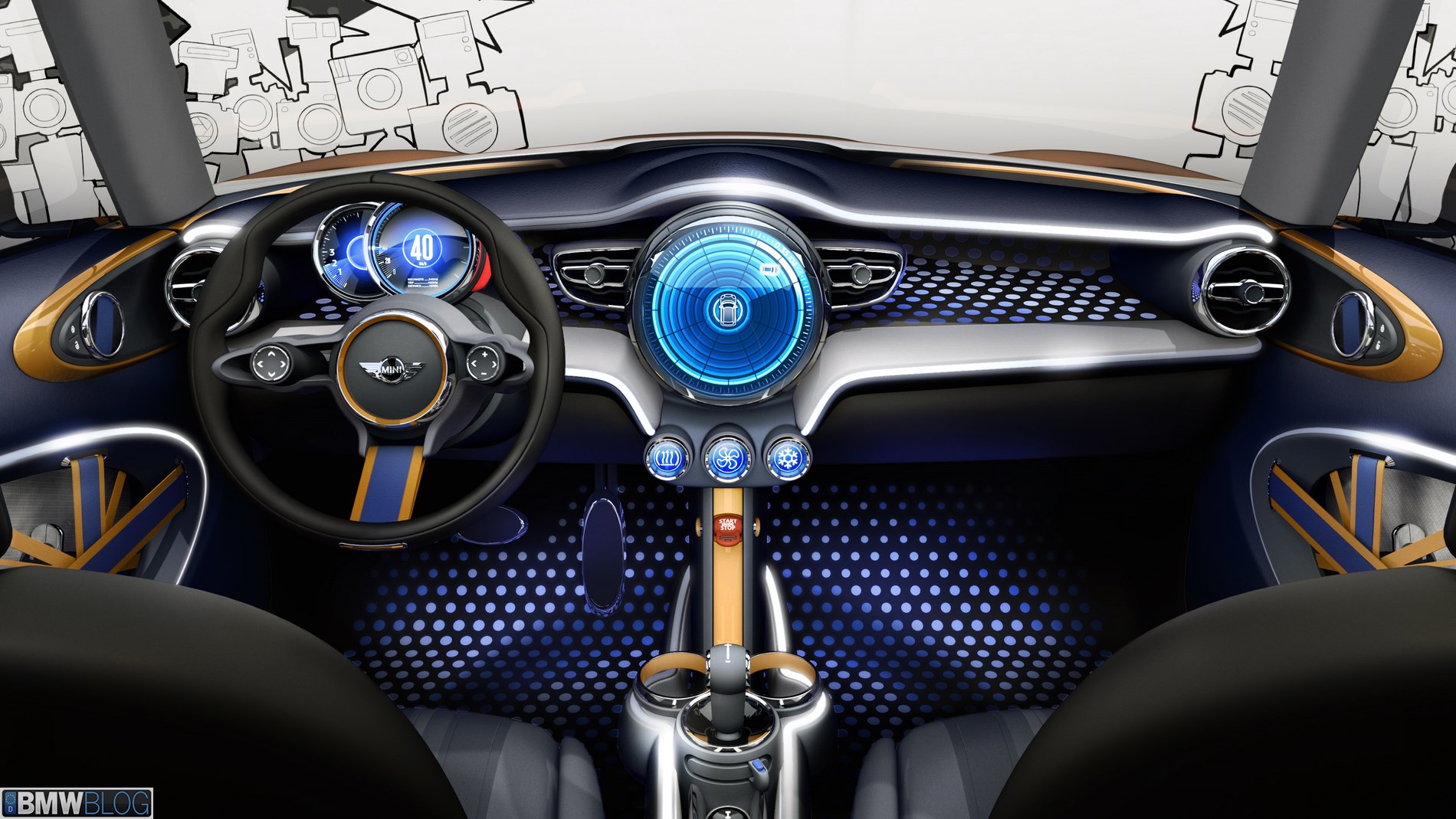 The interior of the MINI Vision as a whole can also be adapted to a variety of interaction requirements with similar flexibility and immediacy. The Driving Experience Control switch allows the driver to choose between a pure and focused or fully-interconnected mode. The two modes are expressed in different colours using calm, clear light and dynamic, energy-charged shades. Another highlight of the fully-interconnected mode is the “MINI Disco” floor. Here, an expressive interplay of colours, light and forms transforms the footwells as the MINI Vision appears to come vibrantly to life. As well as turning the ambient colour scheme of the interior on its head, the Driving Experience Control switch also changes the face of the familiar MINI circular central display. Depending on their selection, drivers will be met by either a classic, analogue-style view or an impressive 3D look, which gives the full suite of display elements an unaccustomed depth.