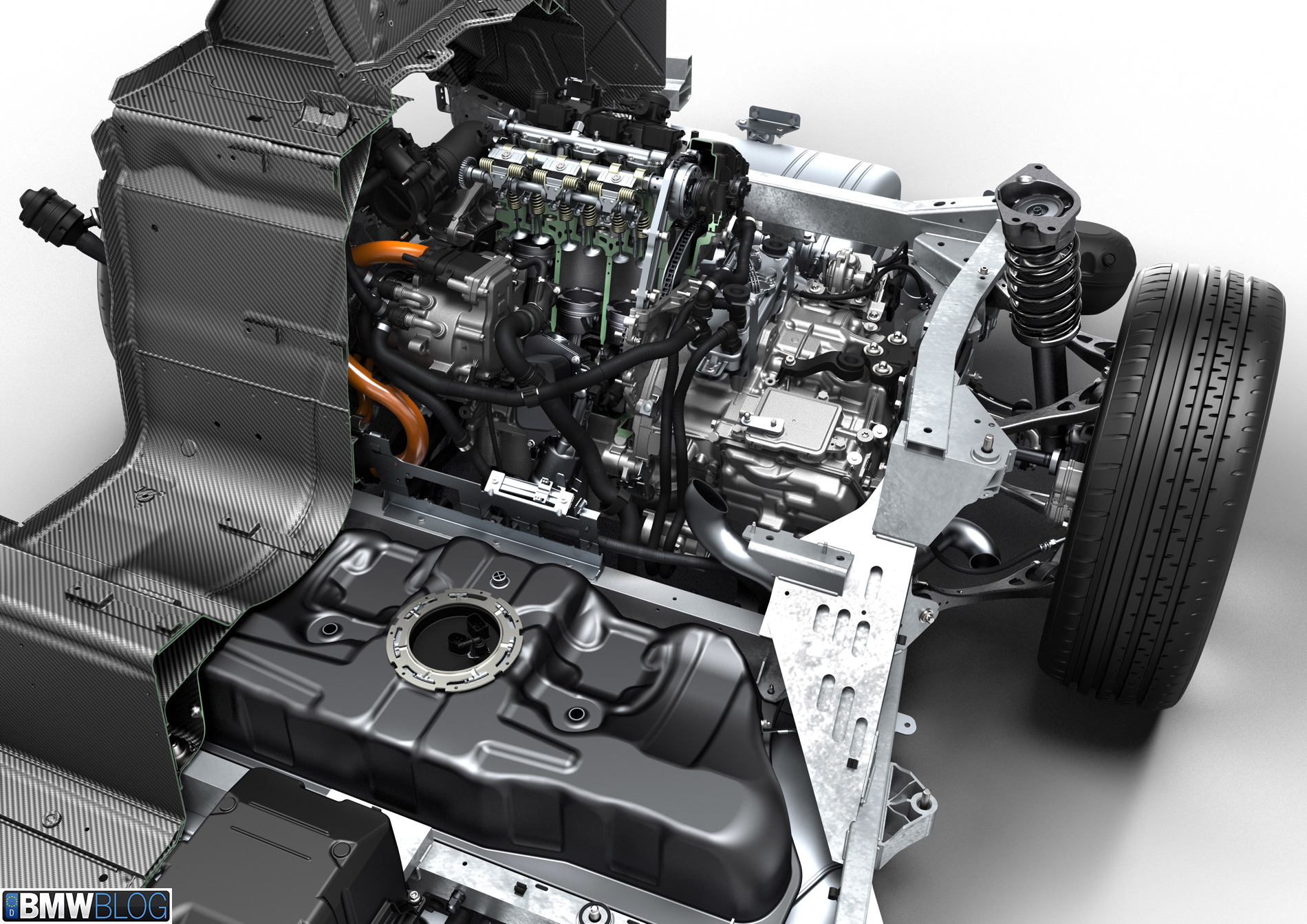 The revolutionary character of the BMW i8 is emphasized by a further innovation: the use of a new internal combustion engine which is making its debut in this model. The BMW i8 is the first BMW production model to be powered by a three-cylinder gasoline engine. This highly turbocharged unit is equipped with latest-generation BMW TwinPower Turbo technology. It is exceptionally compact and develops maximum power of 231 hp (170 kW). The resulting specific output of 154 hp (113 kW) per liter of displacement is on a par with high-performance sports car engines and is the highest of any engine produced by the BMW Group.