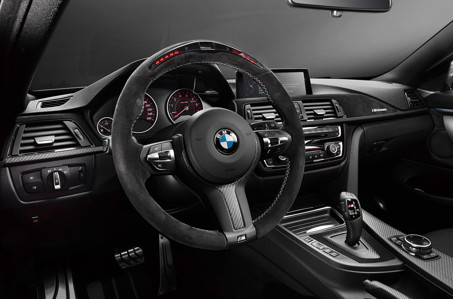 The dynamic charisma of the BMW 4 Series can also be given greater emphasis by means of BMW M Performance components for the exterior. A black radiator grid for the BMW kidney grille, a diffuser insert for the rear apron, side sill foils with M Performance inscription, BMW M Performance side stripes and carbon front splitters, mirror caps and rear spoiler optimize the coupe’s sporty appearance and aerodynamic properties. An interior ambience inspired by racing is ensured by the BMW M Performance sports steering wheel with red central marking or Race Display in 12 o’clock position as well as gear lever and handbrake handle in carbon including Alcantara gaiter. A carbon finish is likewise available for the gear selector switch of the automatic transmission. In addition, interior strips in carbon and Alcantara, high-grade steel pedals, a specially designed driver footrest and BMW M Performance floor mats are also available for the BMW 4 Series.