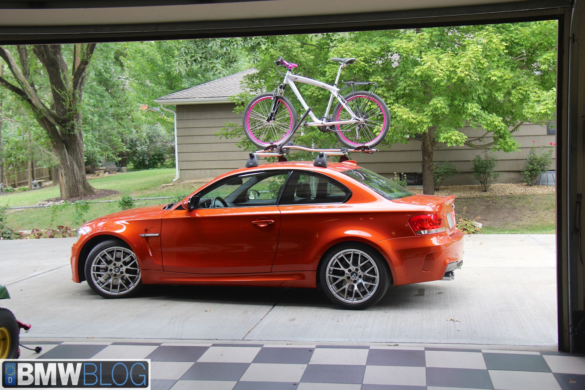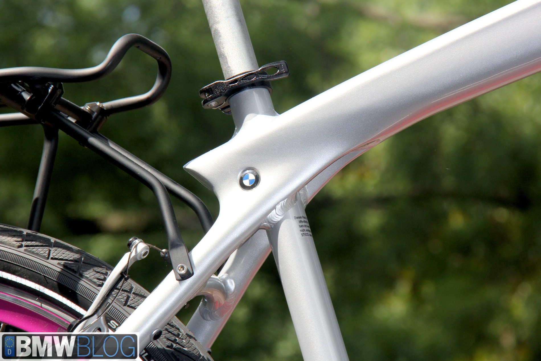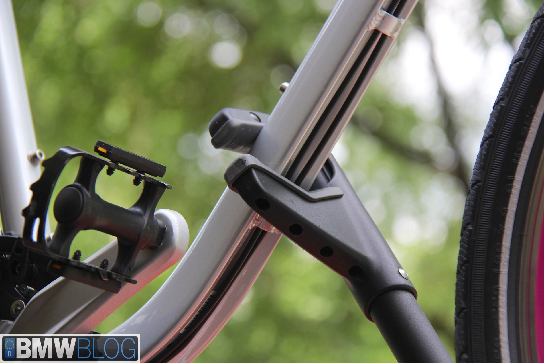BMW sells six different bicycle holders from roof to hitch to trunk. The $152 BMW Racing Cycle Holder is a lockable, quick release type holder that fastens securely on the front fork. The rear wheel stays on and is strapped to the tray. It requires removal of the front wheel of the bicycle which is easy on quick release front hubs. I have one of these and use it to hold my carbon fiber bicycles. It offers secure mounting an minimal shifting during high speeds on the freeway compared to the upright style bike holder.