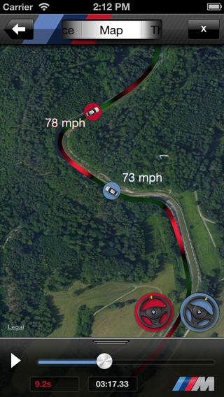 The BMW M Laptimer provides highly visual depictions of throttle, speed, brake input, engine RPM, fuel level, and g-force. Users can easily zoom in and out, and rewind or fast forward through track recordings. BMW M Laptimer will automatically calculate laps and times for the user without the need for pre-installed track map data. The App can be used on virtually any closed circuit.