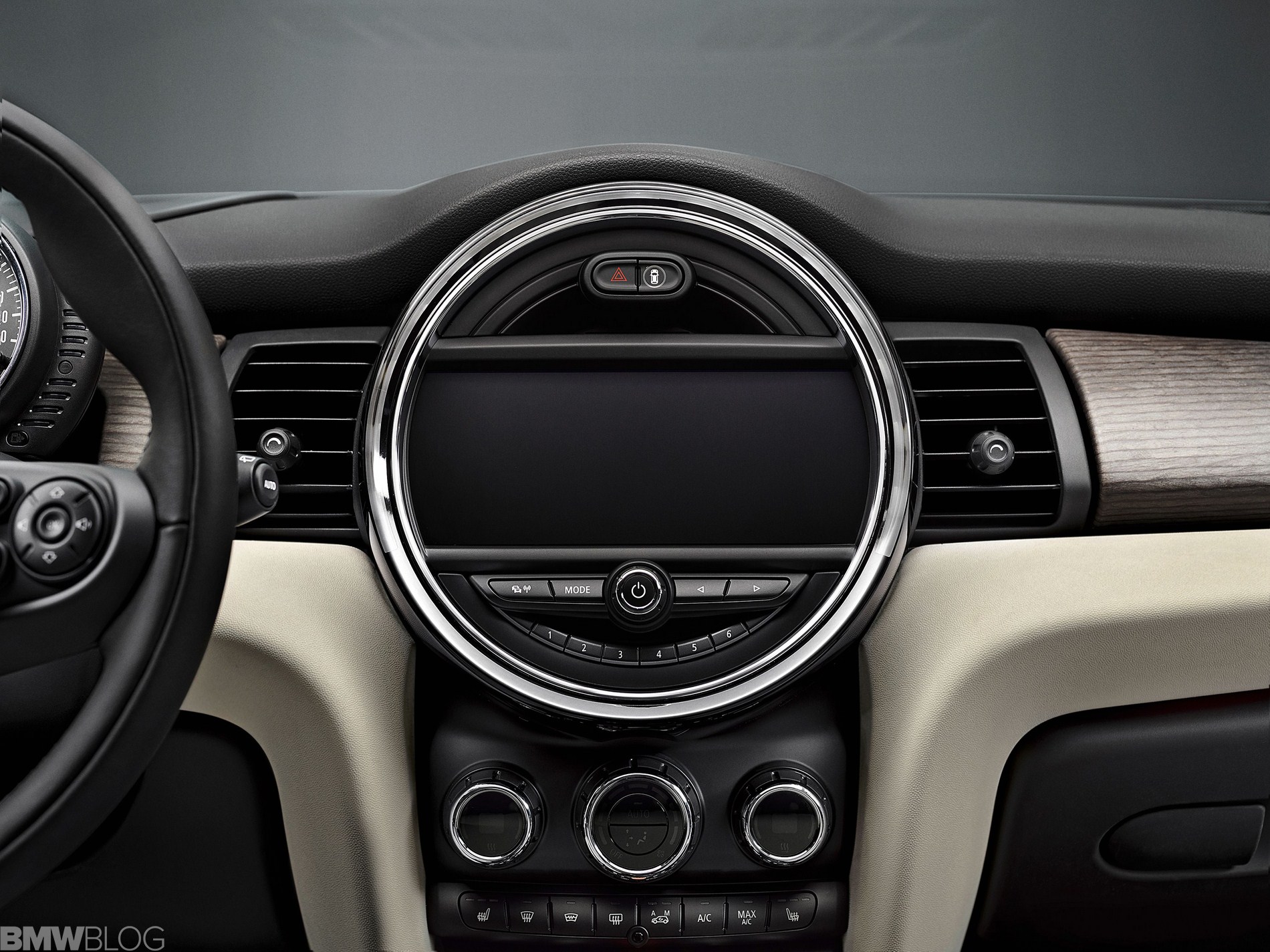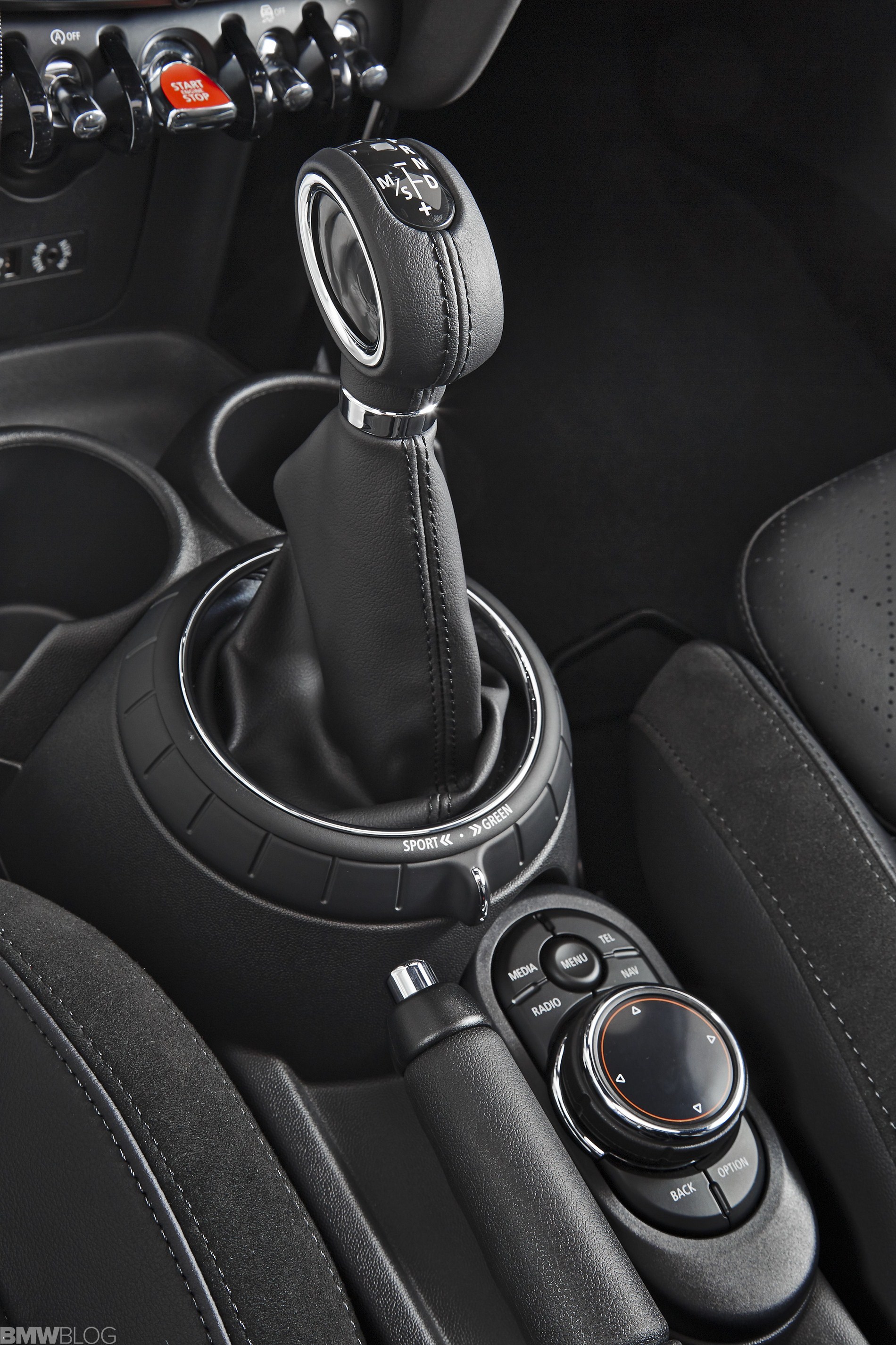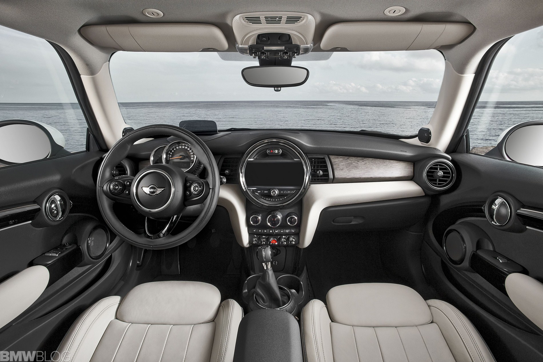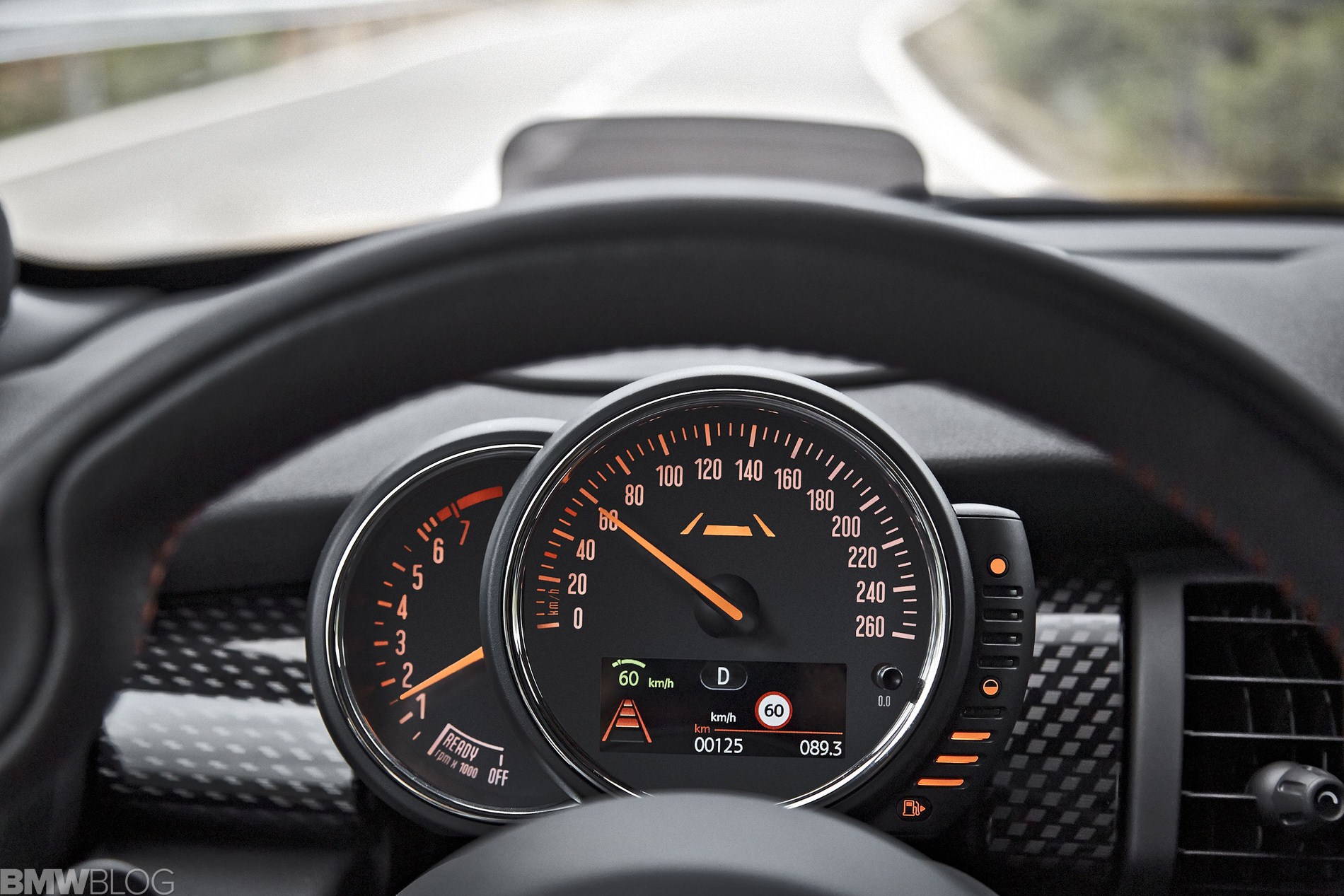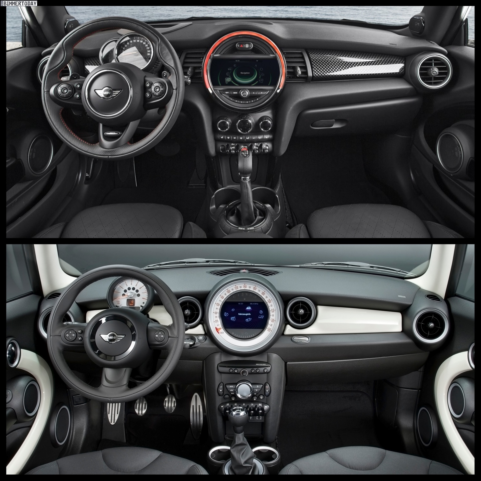 Inside we asee an evolution of the R56 design. The interior is characterized just as before by a central circular instrument panel. However, the former “Center Speedometer” is no longer used to display the speed. The instrument cluster on the steering column shows road speed and engine speed and color display for vehicle status details and fuel level.