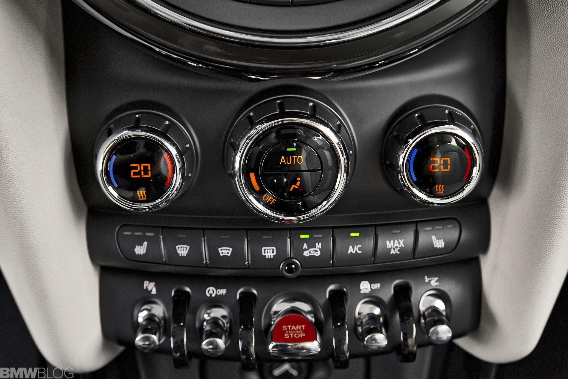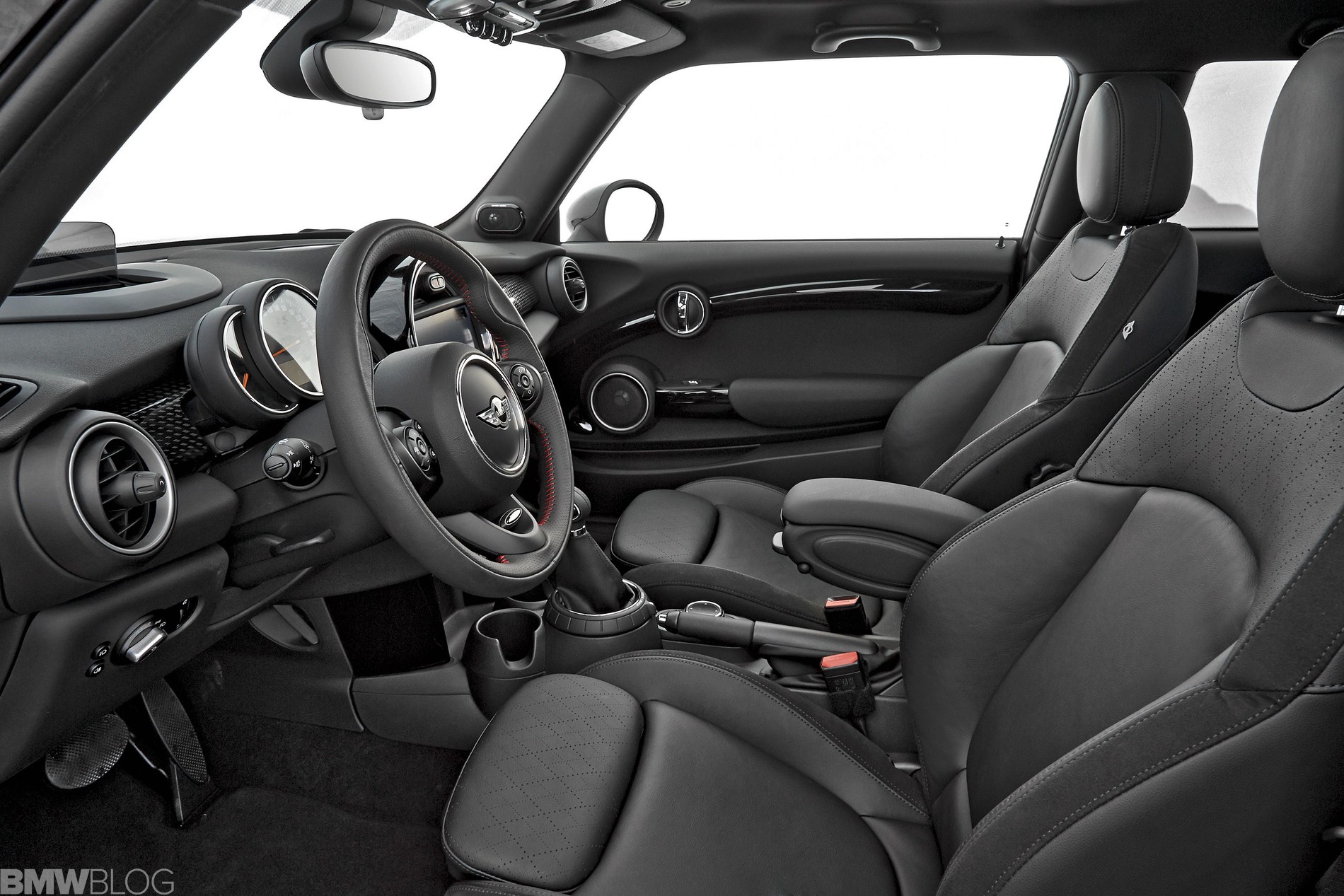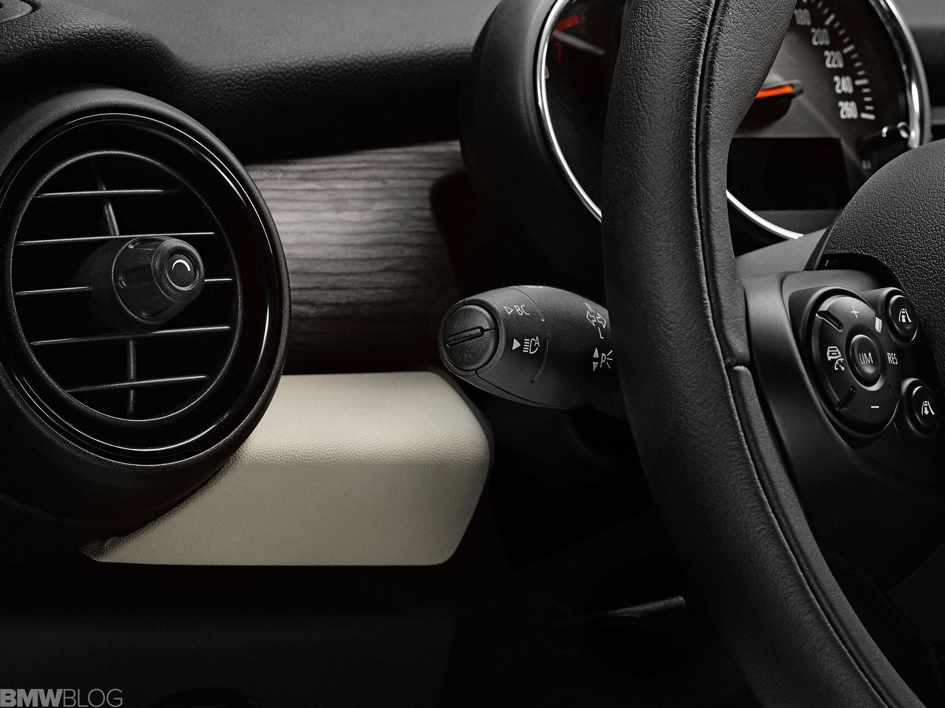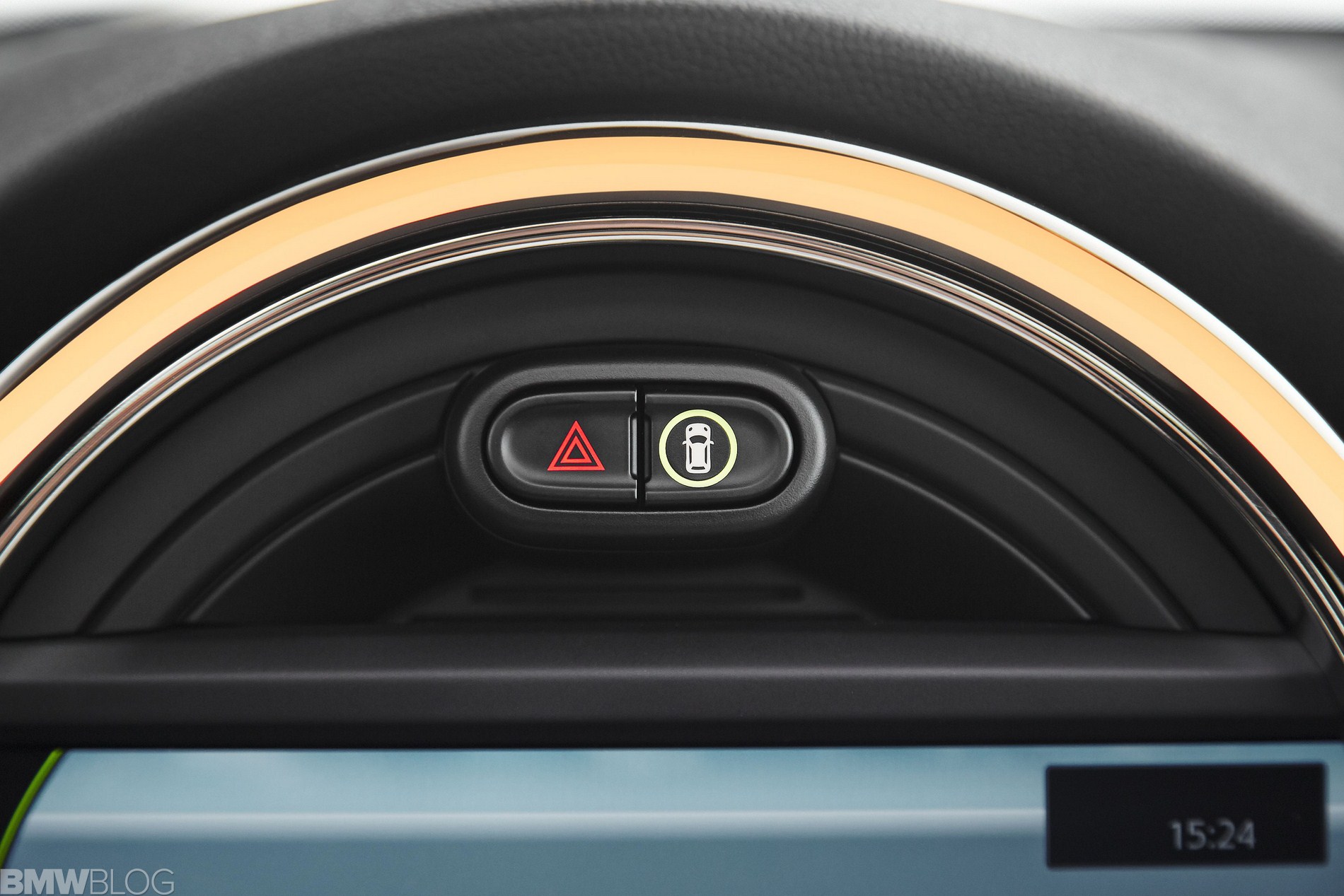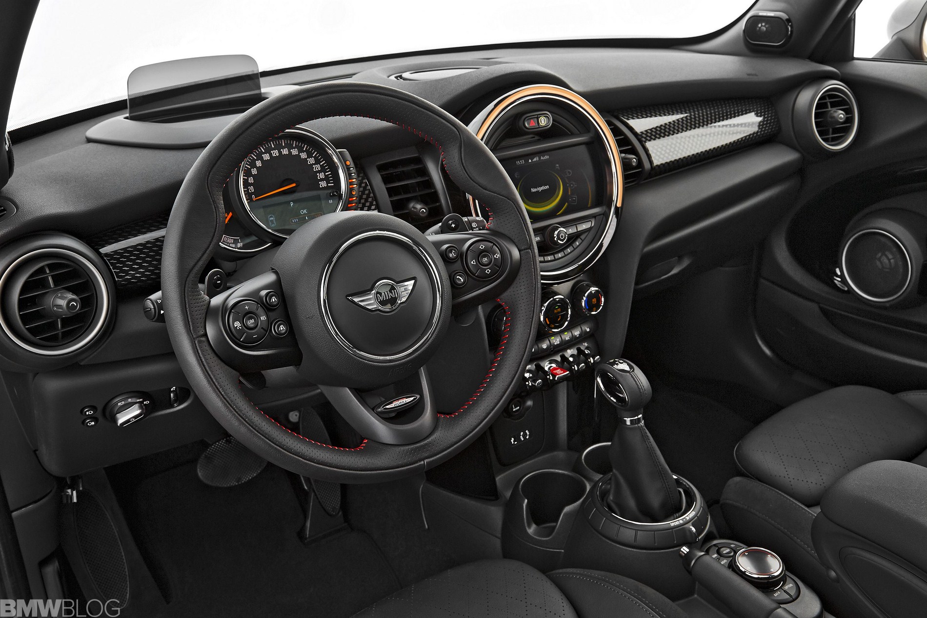 Inside we asee an evolution of the R56 design. The interior is characterized just as before by a central circular instrument panel. However, the former “Center Speedometer” is no longer used to display the speed. The instrument cluster on the steering column shows road speed and engine speed and color display for vehicle status details and fuel level.