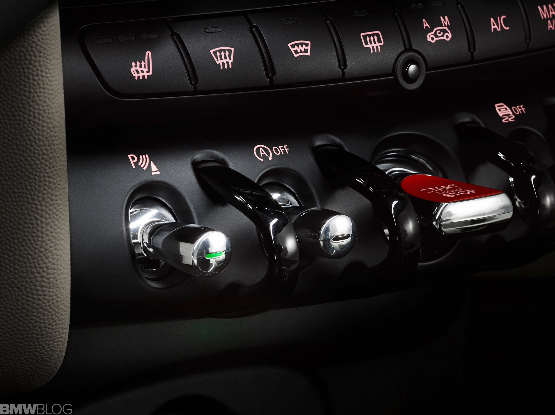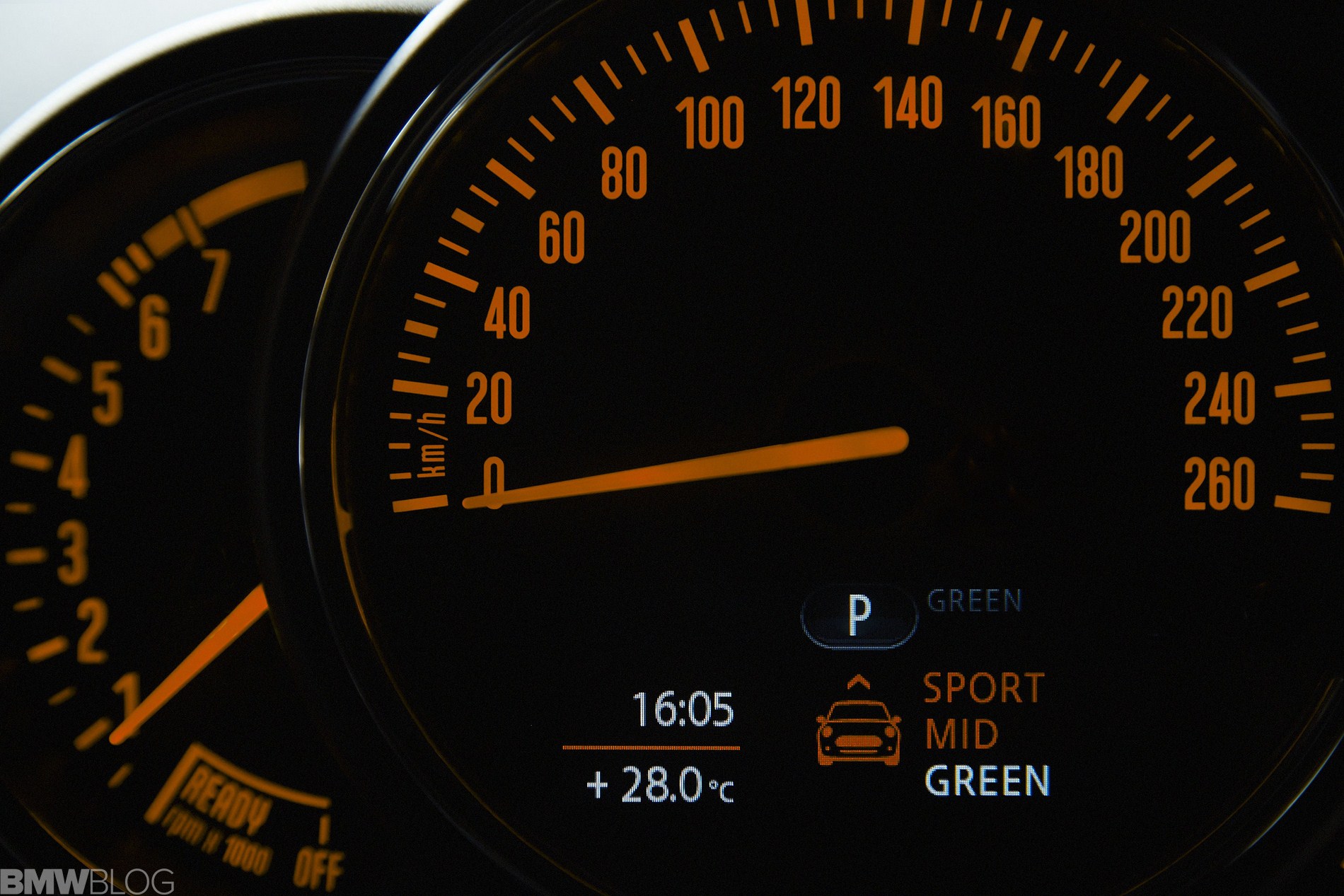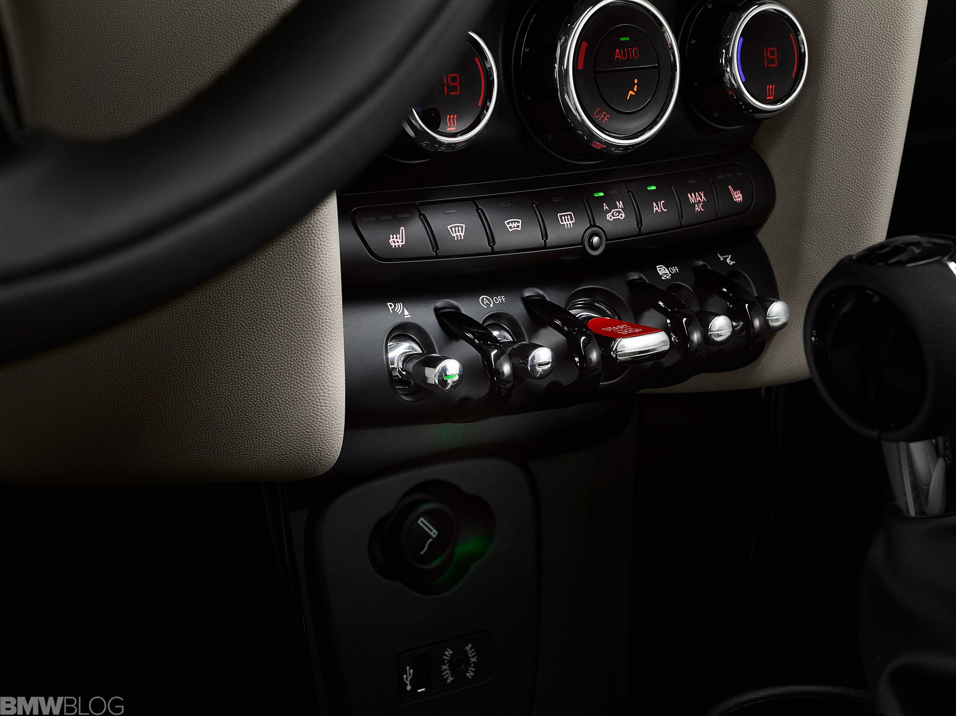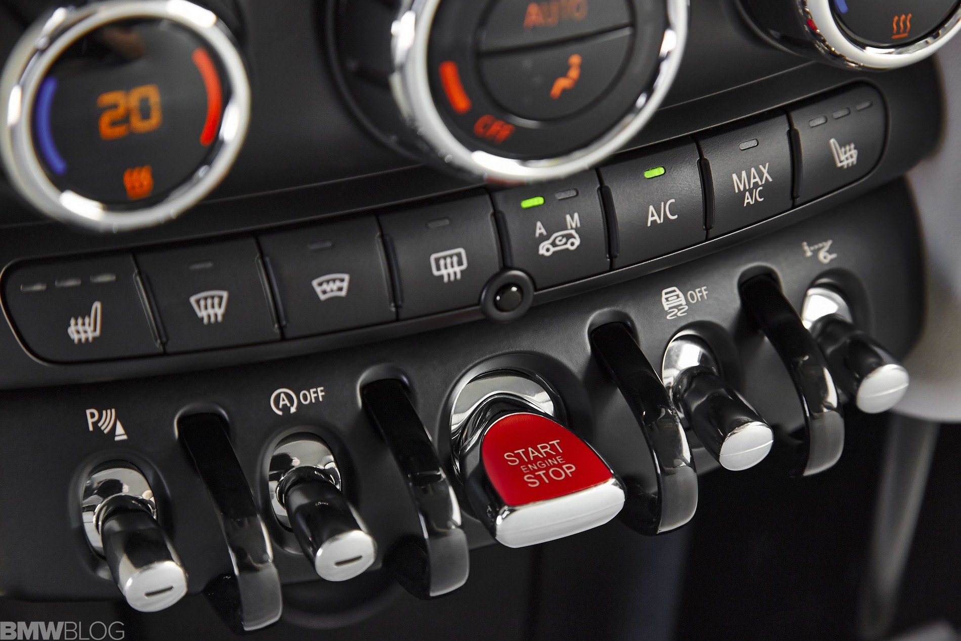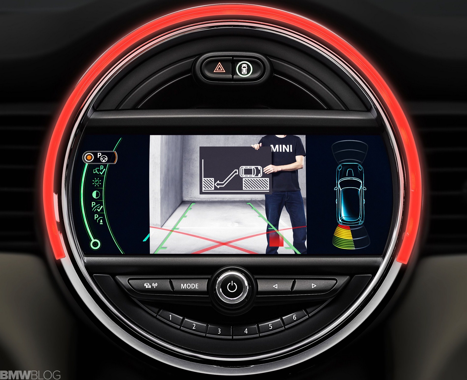 Inside we asee an evolution of the R56 design. The interior is characterized just as before by a central circular instrument panel. However, the former “Center Speedometer” is no longer used to display the speed. The instrument cluster on the steering column shows road speed and engine speed and color display for vehicle status details and fuel level.