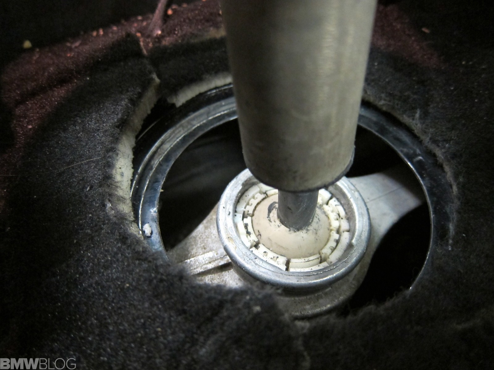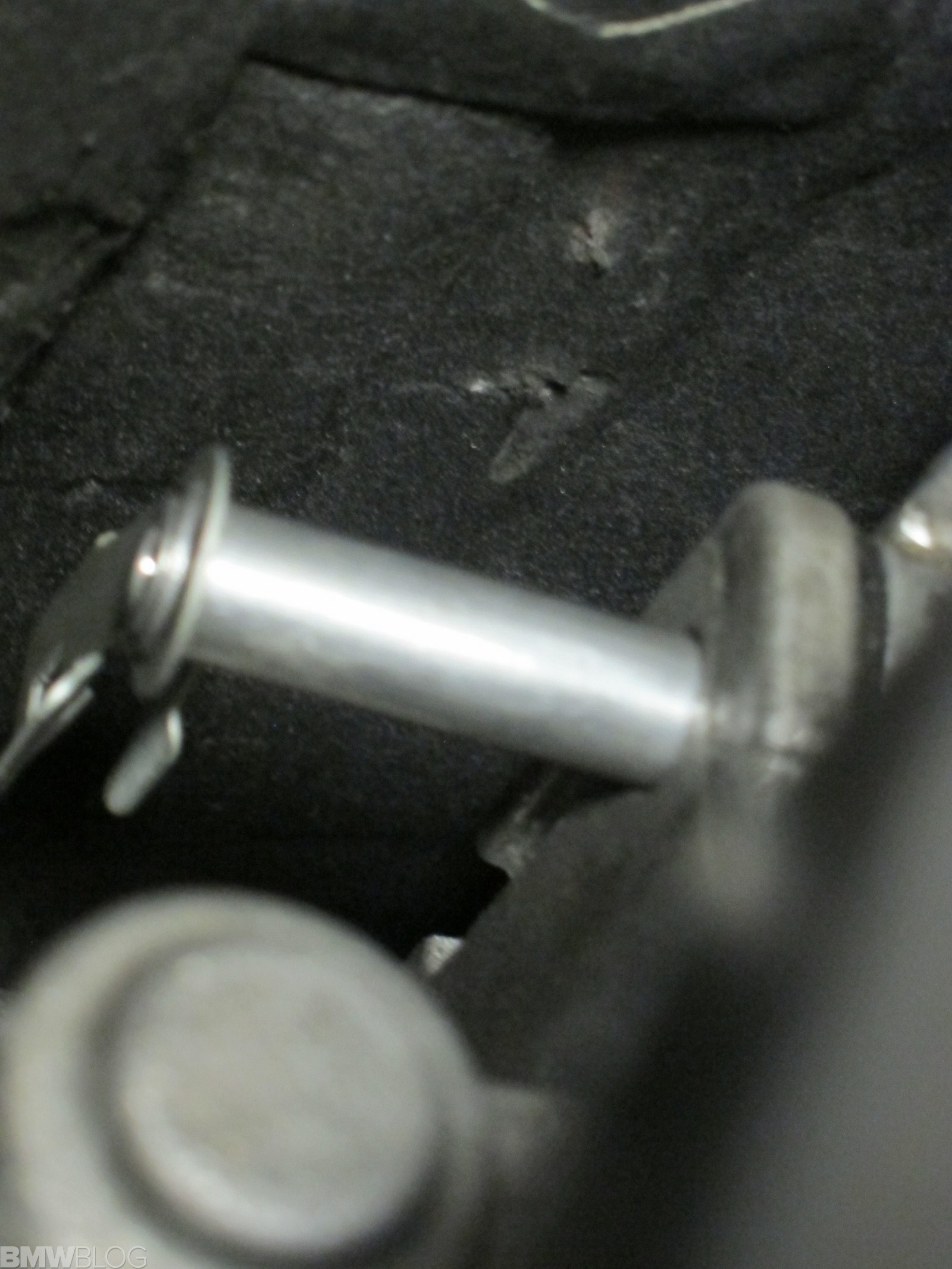 In the E46, the notorious bitch clip pictured here is actually much easier to get out than the E36 bitch clip. The derlin shifter bushings were easy to install in the linkage arm but a bear to line up correctly for reinstall of the arm on the transmission. This took us much longer than anticipated. It took one in the car adjusting the position of the of the linkage arm while the other person tried to push the bitch clip back through the center. Changing these to the derlin bushings helps decrease the side to side motion that worn out bearings can cause, so I thought it is worth the effort.