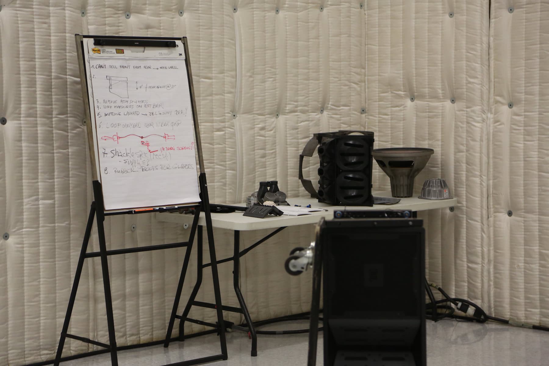 A tour of the Harman laboratory revealed quiet rooms built specifically for sound testing – and at great cost. The walls are coated in foam protrusions designed to absorb and arrest sound waves. Even the floor is coated in this foam labyrinth; I was guided into the room on a wire-mesh gangway elevated floor. So elaborate, so thorough is their testing that Harman’s quiet rooms are built separate from the building complex, essentially floating as an island surrounded by the building complex – thus avoiding even the slightest testing interference from faint vibrations traveling through the adjoining walls and floors.