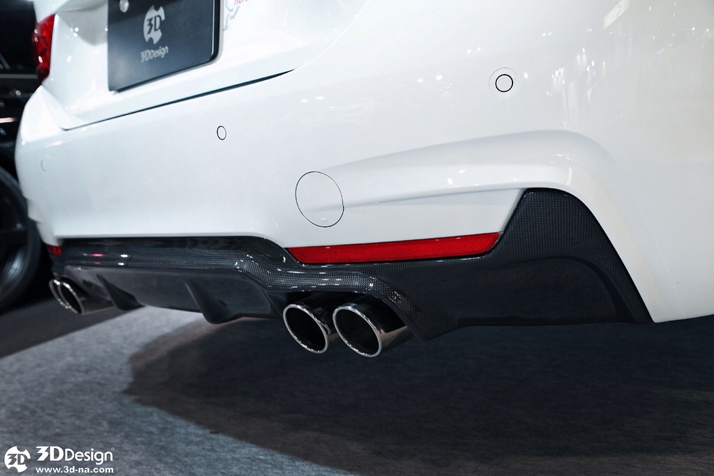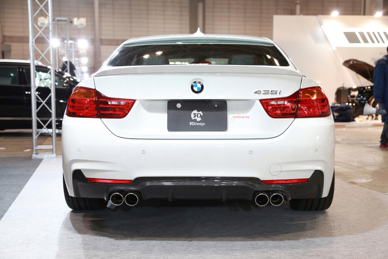 The 3D Design F32 M-sport kit features a urethane or carbon fiber front lip, optional carbon fiber lower splitters, urethane trunk spoiler, and carbon fiber rear diffuser. The program also offers a quad tip exhaust system built by Arqray Japan.