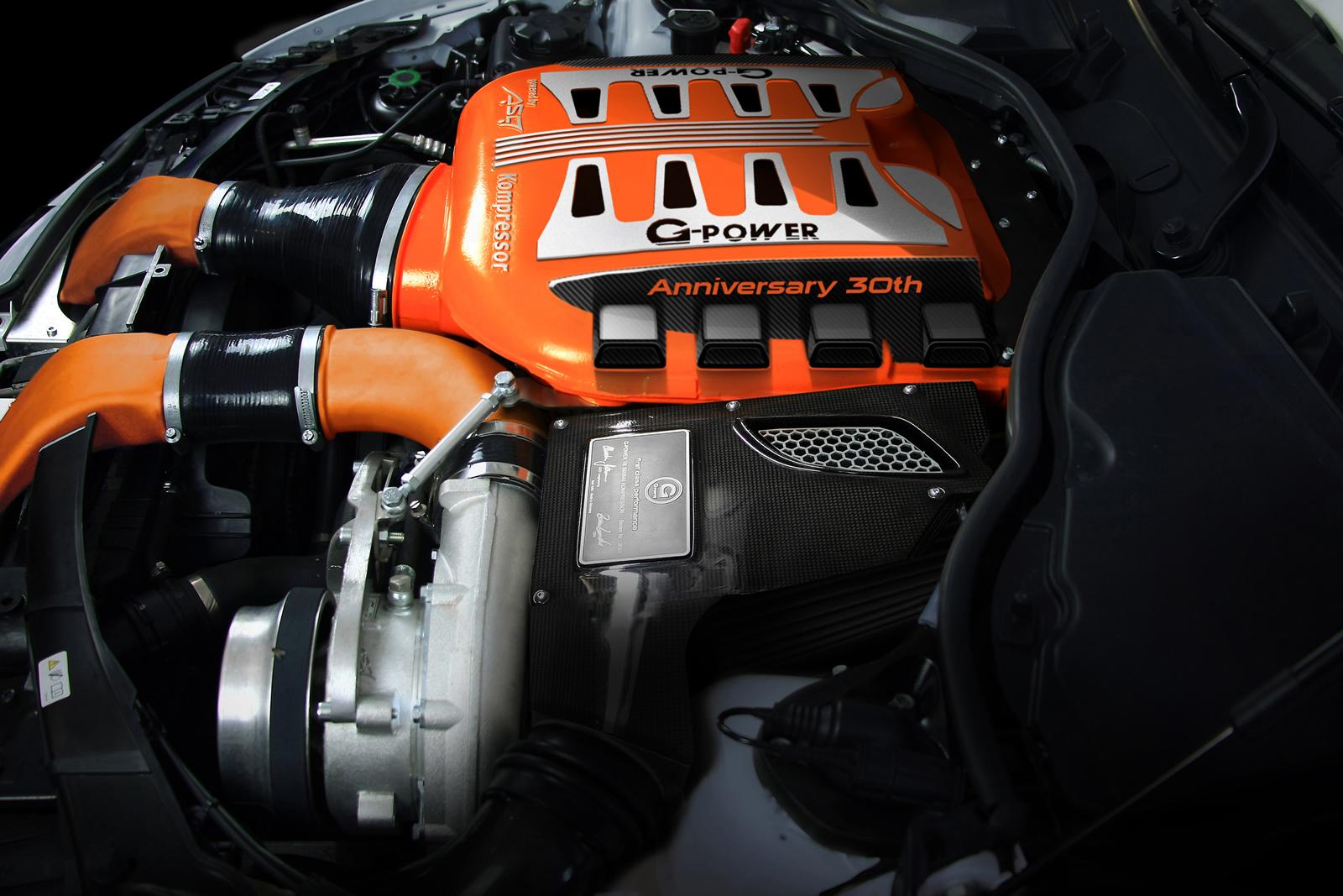 A High-Flow air intake incl. large racing air filter, a large volumetric intercooler system made from cast aluminum and a cast aluminium air box, set the necessary background to enable the max. boost of 0,5 bar relative, of its strongest version the SK II CS, to produce an power output of 615 hp and 595 Nm of torque. In order to keep the output enchantment weight neutral, G-POWER uses a full titanium exhaust system including a set of racing catalytic converters, which saves 26 kg compared to the factory exhaust system.