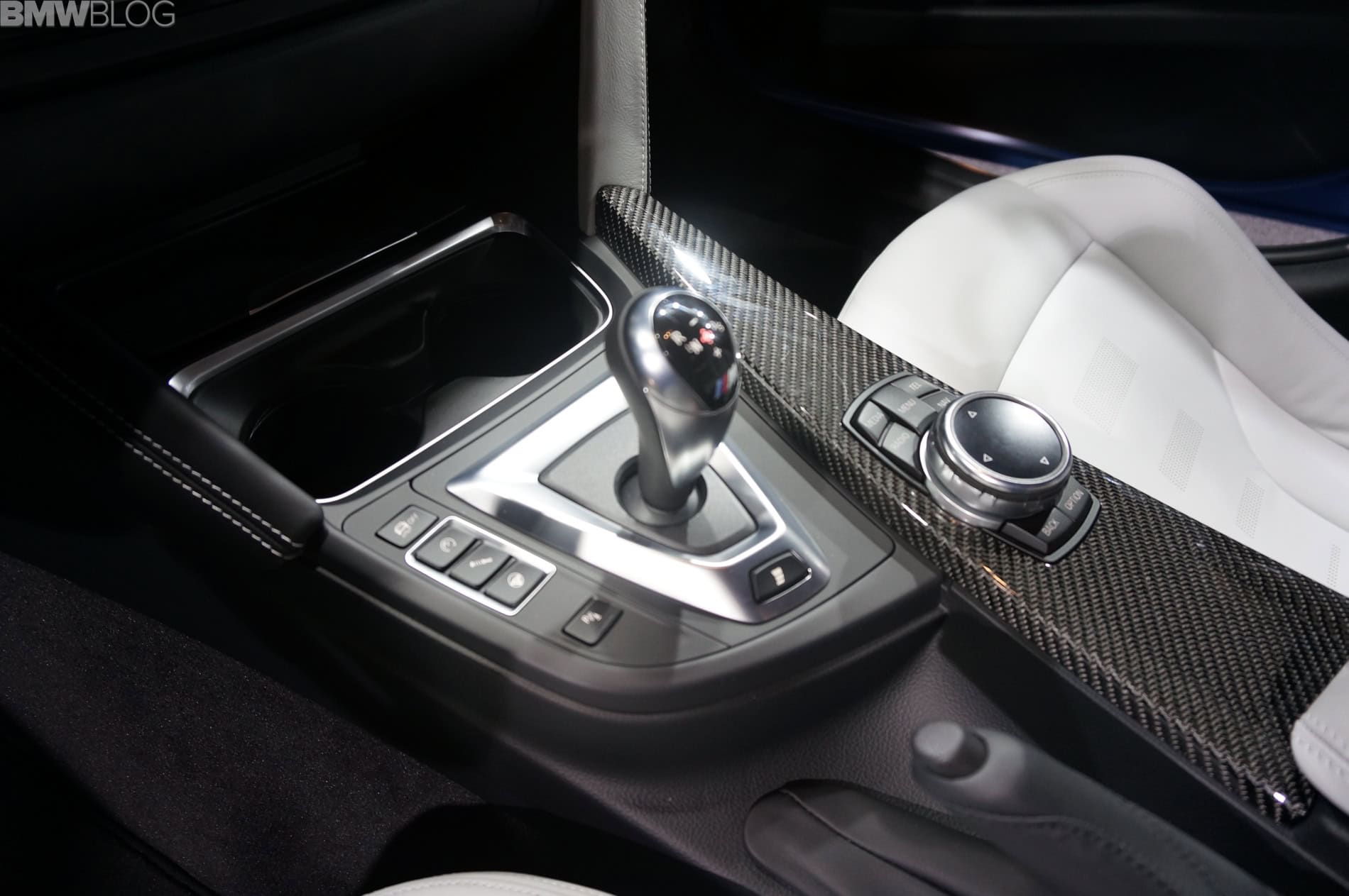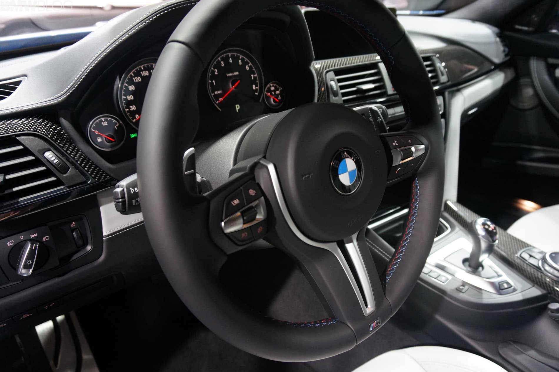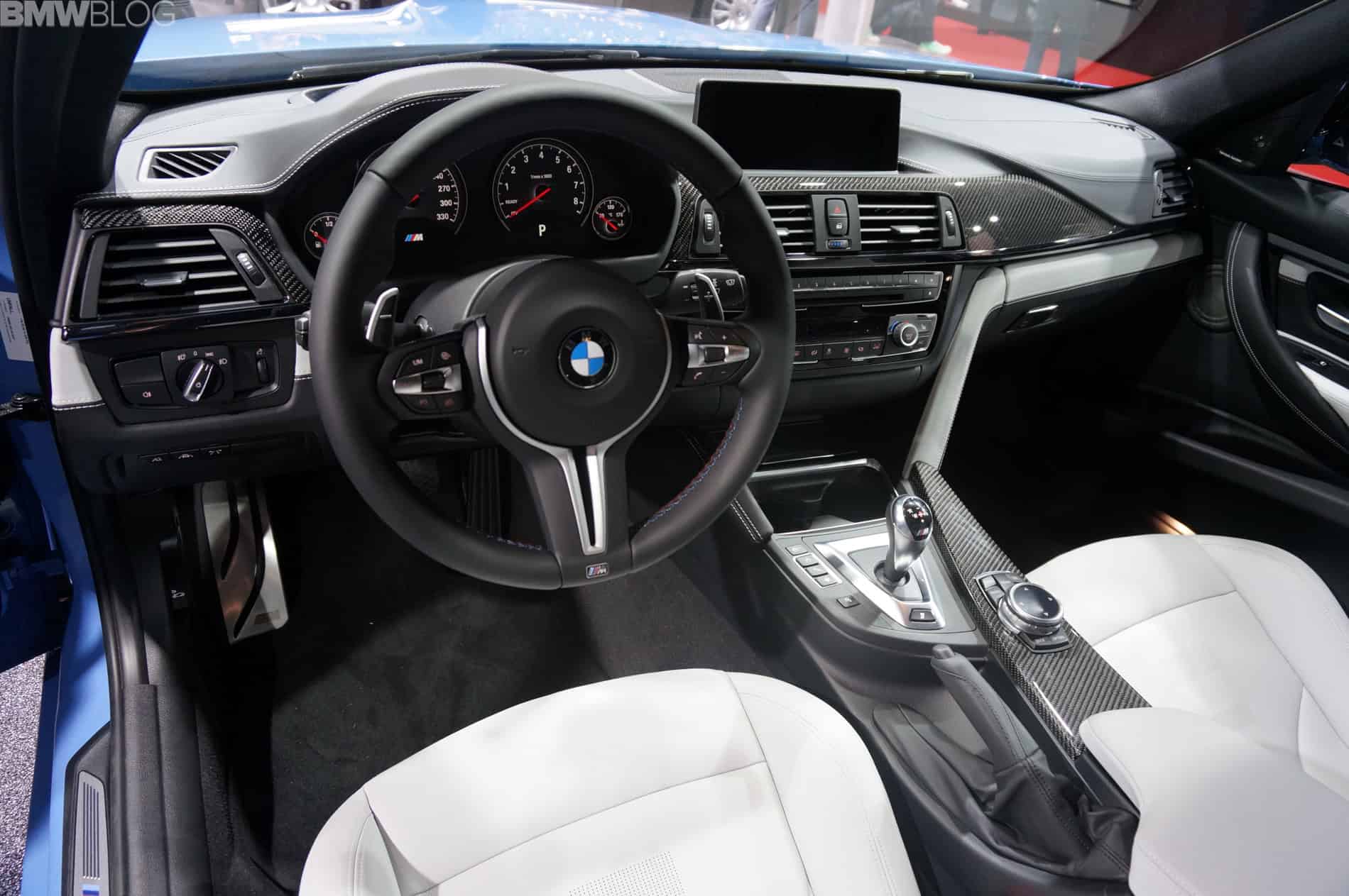 The display model sports the Yas Marina Blue paint job which is also available for the M4 Coupe. The M3 Sedan and M4 Coupe can be ordered in Alpine White, Sakhir Orange, Black Sapphire, Silverstone, Mineral White, Mineral Grey, Austin Yellow and Yas Marina.
