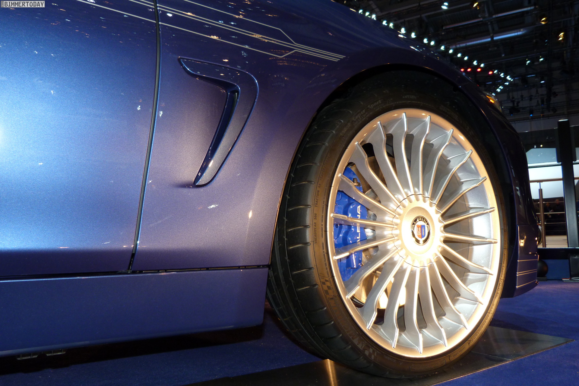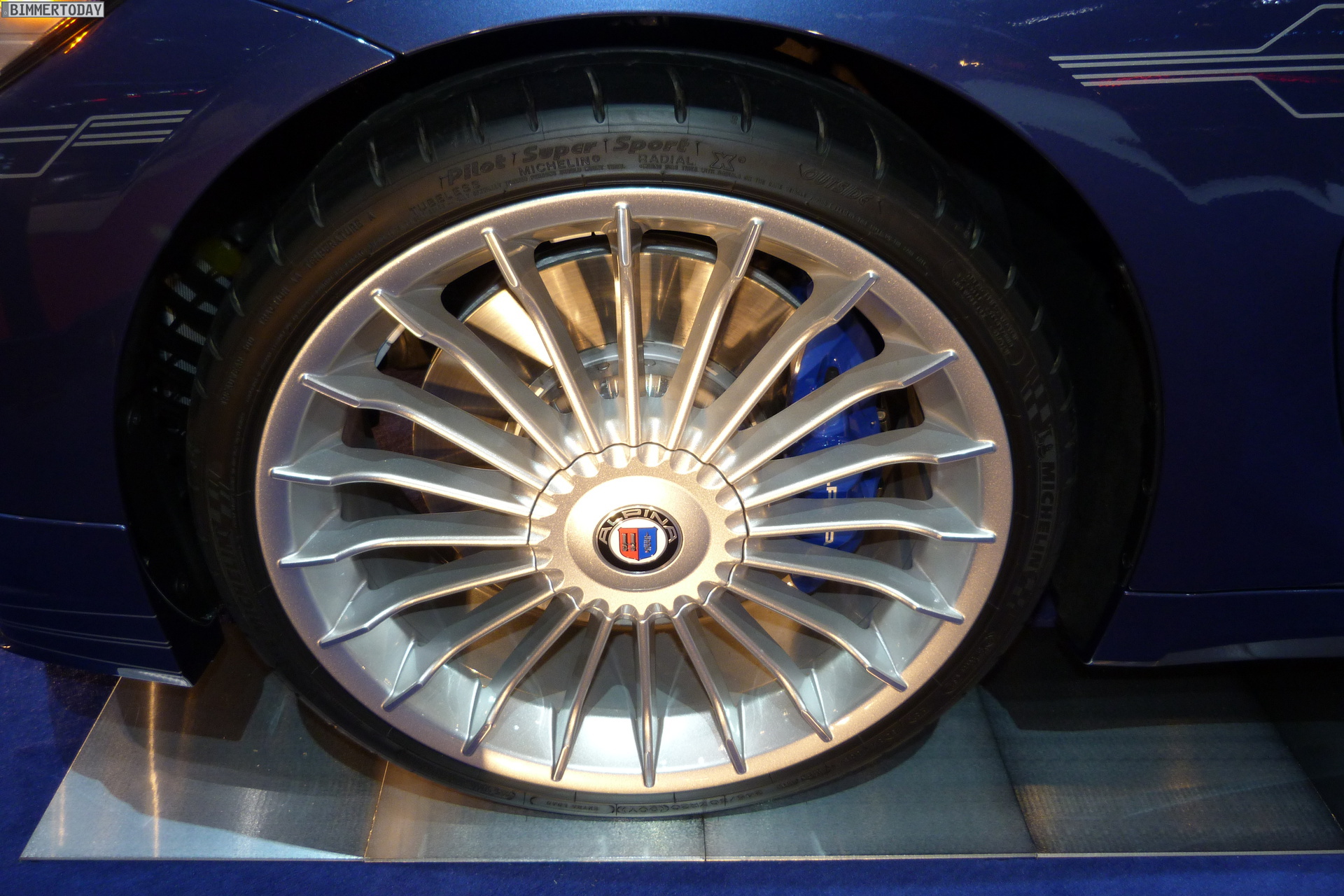 Deceleration is taken care of by an 18“ high-performance brake system with 370 mm discs at the front and 345 mm discs at the rear. Aluminium callipers (4-piston on front axle, 2-piston on rear axle) painted in blue and with ALPINA lettering, in conjunction with high-performance pads, ensure fading stability and optimal pedal feedback.