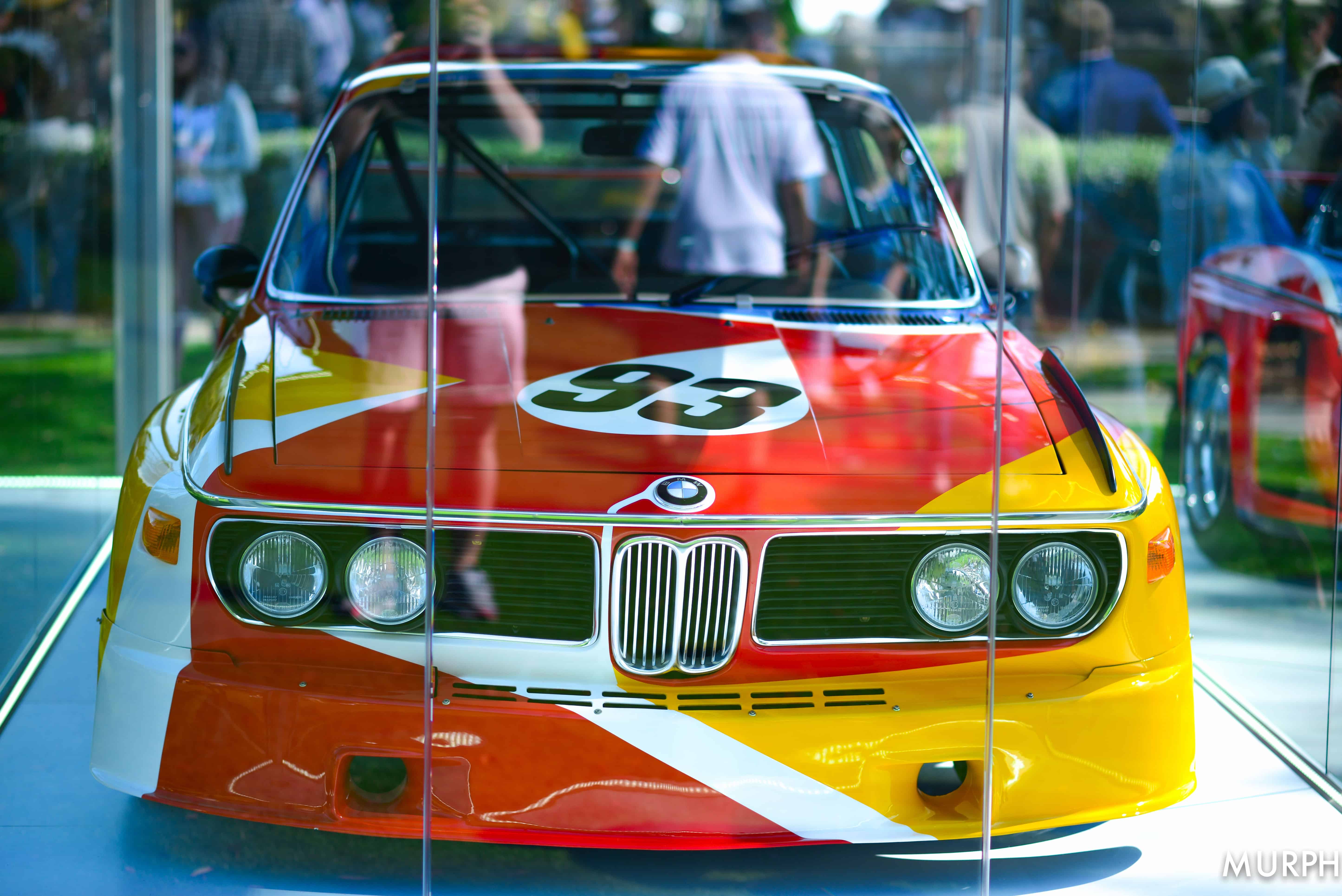 The amalgam of red, blue, yellow and white strafing  the CSL’s body was commissioned just a year or so prior to Calder’s death though the car would go on to compete in the 1975 24 Hours of Le Mans, piloted by two Frenchmen Poulain and Guichet along with the great American racer and writer Sam Posey. Though the car would not finish the race, the flashy CSL would launch a fleet of Art Car projects by BMW that stretched another four decades. Lucky for me, after a 39 year journey, I was able to view the very first. Today, ensconced in a glass cage, it sat on the green of the Amelia Island Ritz Carlton – presenting itself to the world again and looking none worse for the wear. It’s certainly a rarity for car enthusiasts to celebrate both fine art and fine automobiles in a single form.