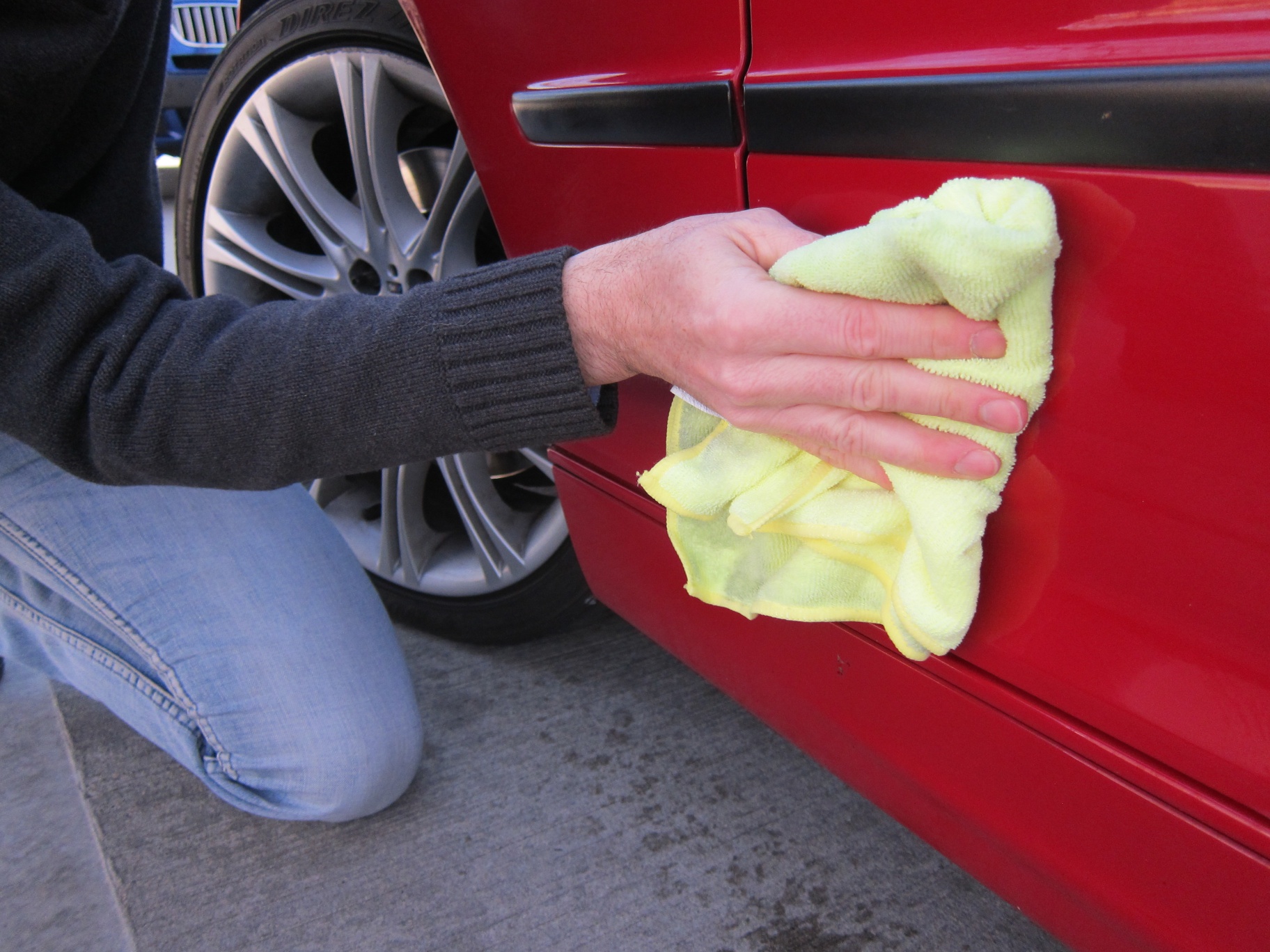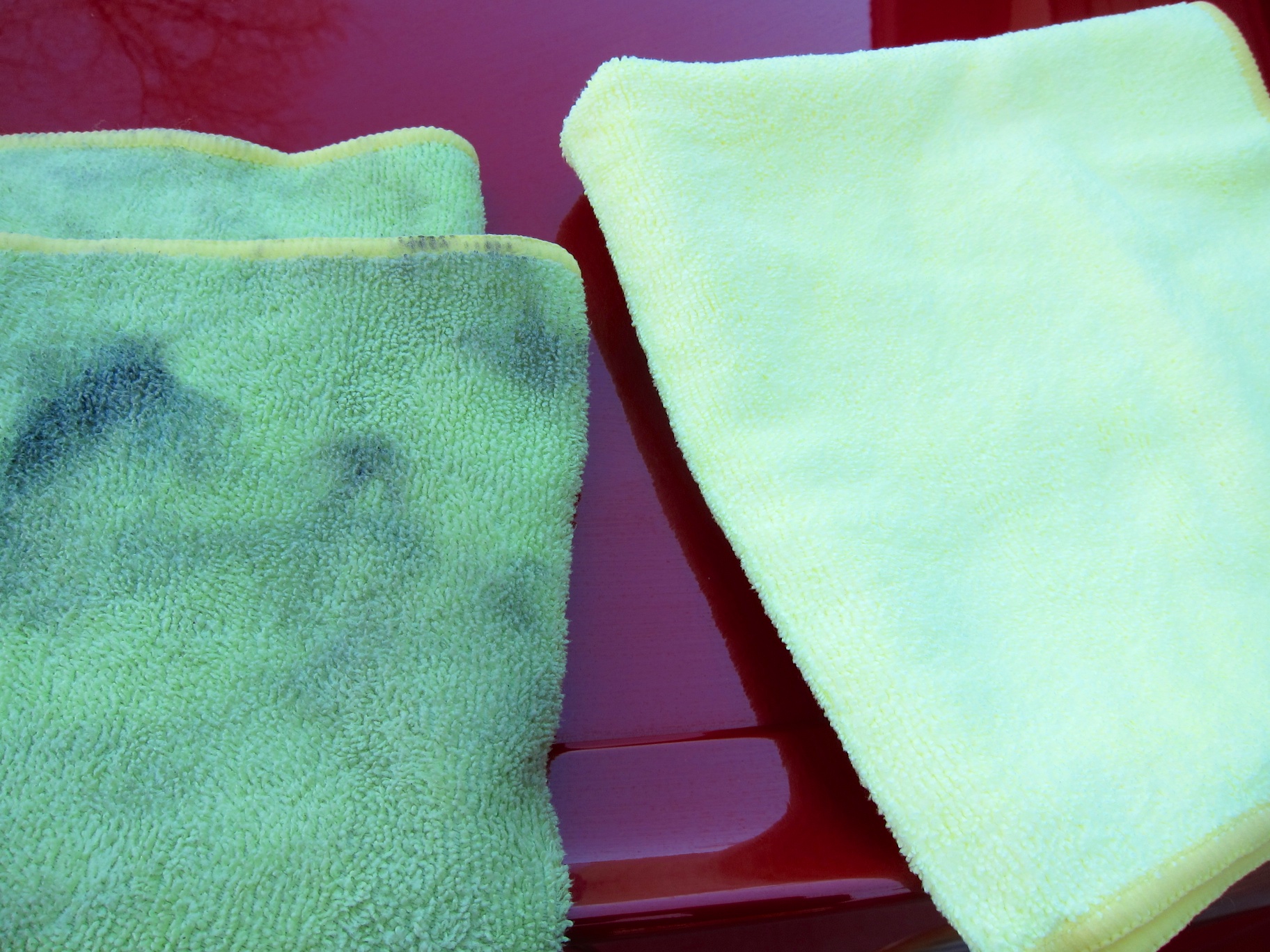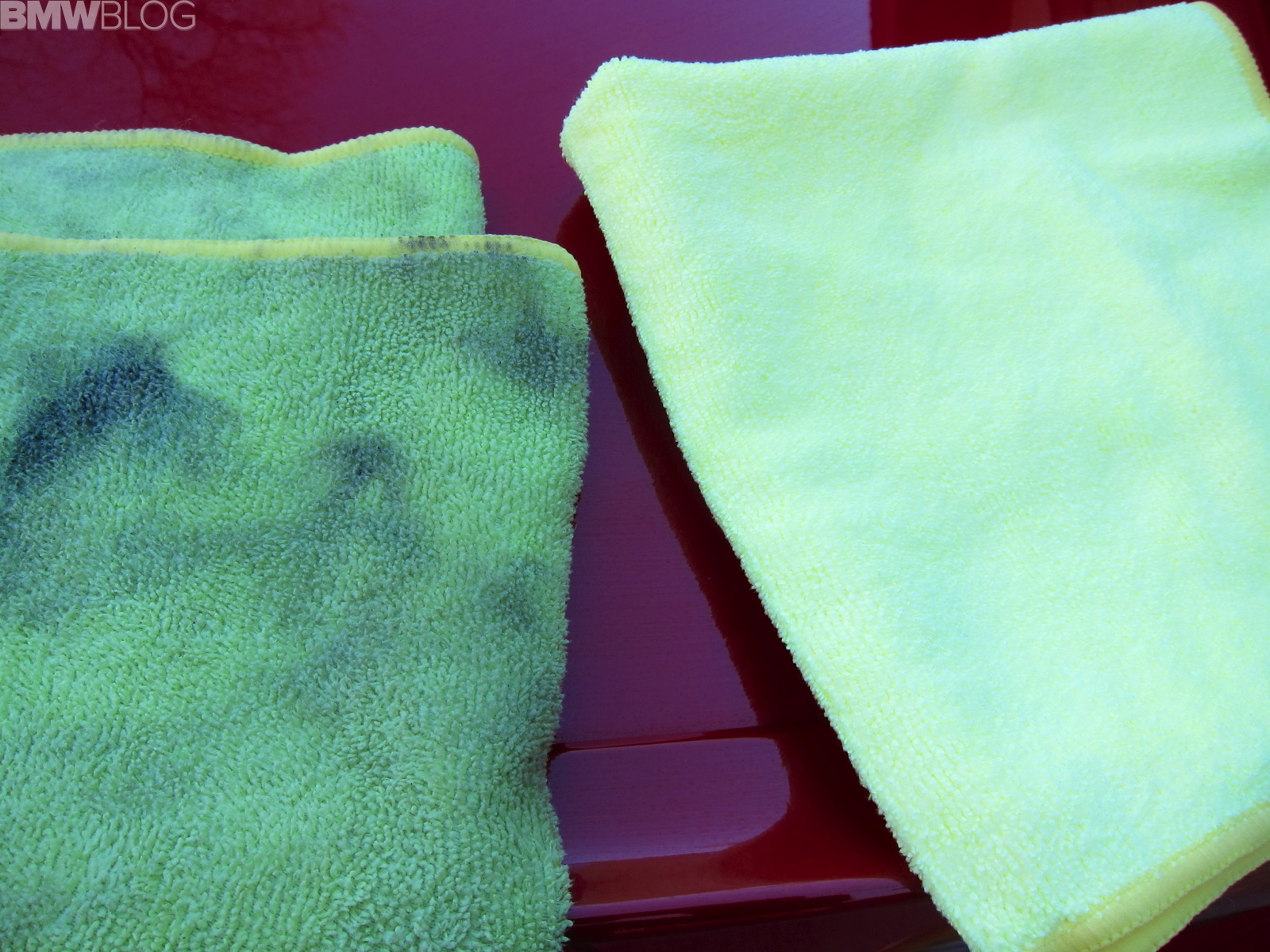 I was really unsure of this whole wash-your-car-without-water thing, but I pressed on in the name of science. Following the directions, I worked from the top-down while keeping my BMW in the shade. Griot’s Garage shows cars being cleaned with this Spray-On Car Wash and with some thicker green “high loft” cloths, but not having these I used three detailing microfiber cloths from Costco. I used a liberal amount of these stuff since I wanted to make sure to lift dirt up off the paint and not scratch it. I worked in small sections, as recommended, so as to not let the product dry. The result after three detailing cloths was a clean car in about 20 minutes of work time.