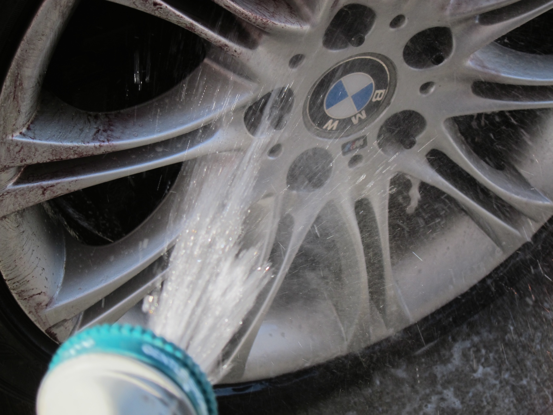 Griot’s Garage Heavy-Duty Wheel Cleaner is definitely up to the challenge since I quickly managed to clean two set of wheels. One set on my ZHP and my wife’s X3 18” wheels that needed to be mounted back on. Griot’s Garage recommends hosing off your wheels first with water. I liberally sprayed Griot’s Heavy-Duty Wheel Cleaner on them and attempted to wait the recommended 3-4 minutes.