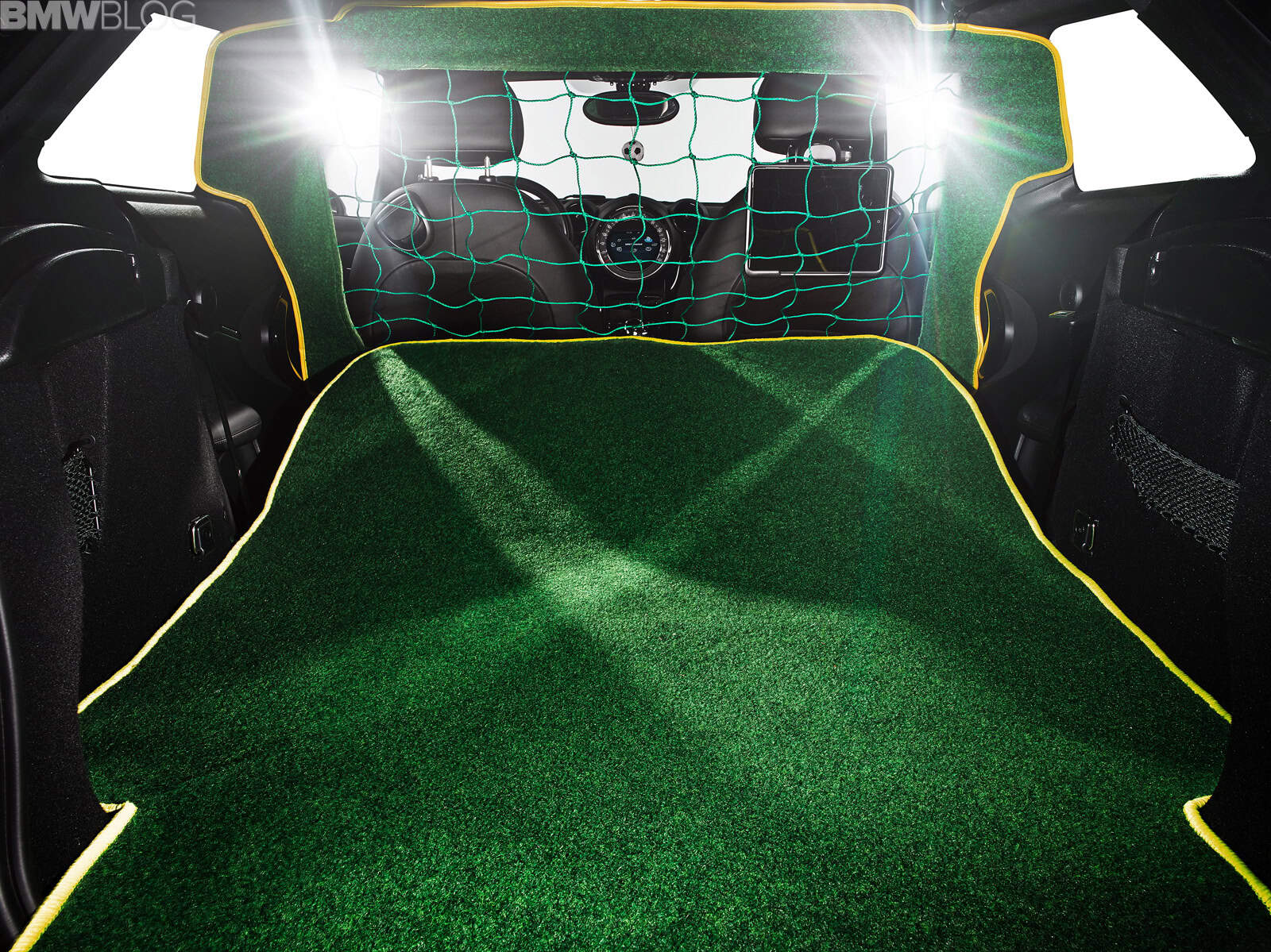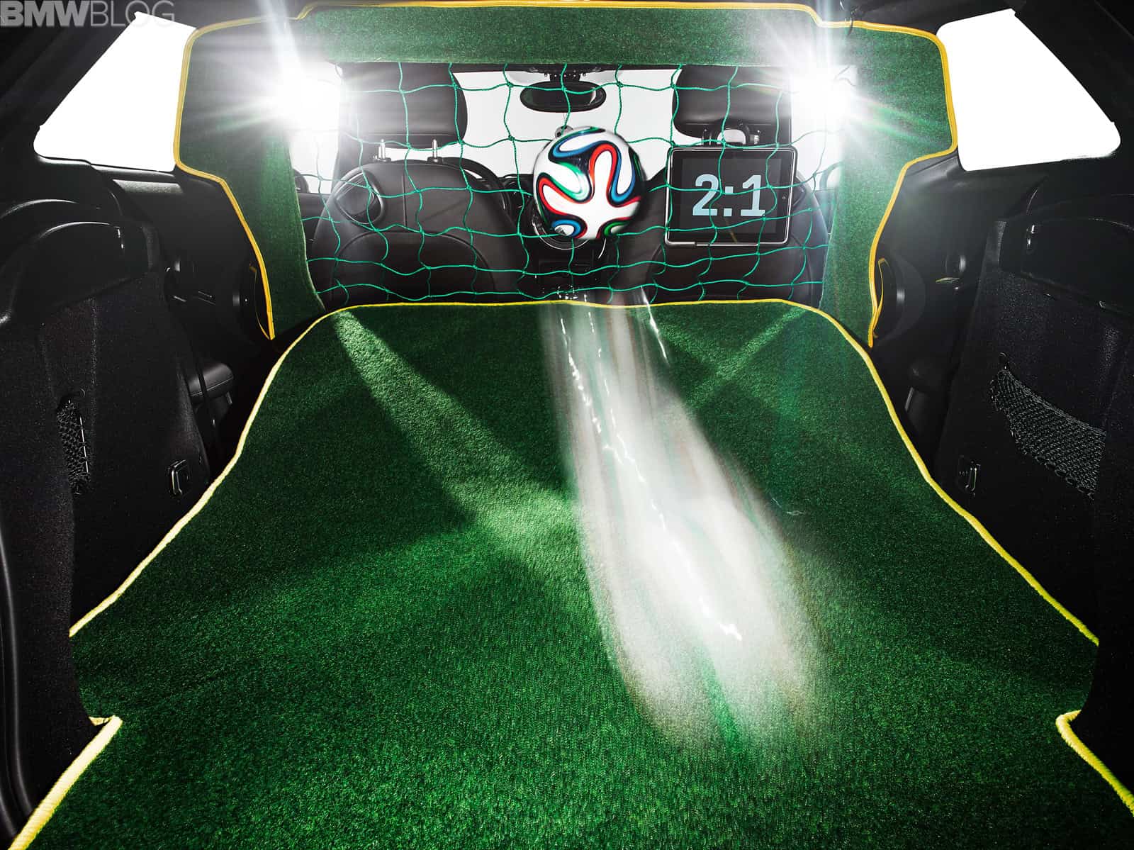 The MINI Paceman GoalCooper is fully equipped for training between matches. The rear seatbacks can be folded over to turn the boot, which is fully clad in AstroTurf, into a football goal. The net is attached behind the front seats. The MINI Paceman GoalCooper has a top defence line-up making it very difficult for any striker to score. As soon as the Park Distance Control (PDC) sensors, in conjunction with the interior monitoring sensors of the alarm system, register a shot on goal, the electric tailgate is operated, instantly closing the tailgate, reflecting the ball and keeping the box clean.