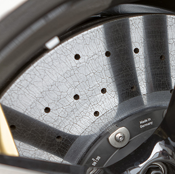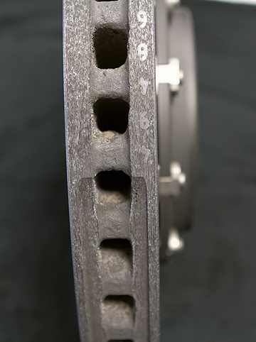 Cracks form in particular wherever relatively cold discs are suddenly subjected to a large load. The cracks that occur are limited to the surface areas. For instance, if you have been driving your car fully laden on the motorway for an extended period without braking and then you are suddenly called upon to perform an emergency braking manoeuvre, the brake disc will become very hot in a very short space of time – in such a case, the temperature can increase from around 20 degrees to 450 degrees. If the brake disc is required to perform in this manner several times in rapid succession, it is quite possible for surface cracks to form in the cast material of the friction ring – especially in the area around the perforation holes. In sports cars, cracks like these are, more than anything, a sign that they are being subjected to the use for which they were designed, and they have no negative effect on the service life of the brake disc or its braking performance. When it is time to change the brake pad, it is also necessary for the car dealer to inspect the brake disc.