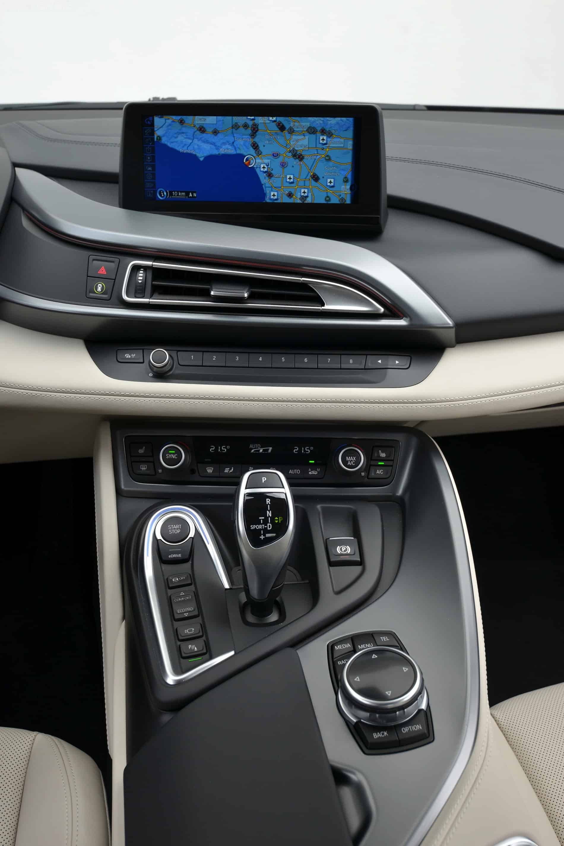 The placement of the main e-motor as balanced against the rear B38 is ideal for the 47:53 weight split, and the lithium-ion energy bank running the length of the car’s center section by my right thigh is another great inducer of dynamic neutrality. I played idly in eDrive and with Eco Pro selected sans paddle shifts, as well as to the sporting extreme of Sport (via chunking the six-speed auto tranny’s center lever to the left) and using the shift paddles with DTC/DSC as deactivated as the i8 allows.
