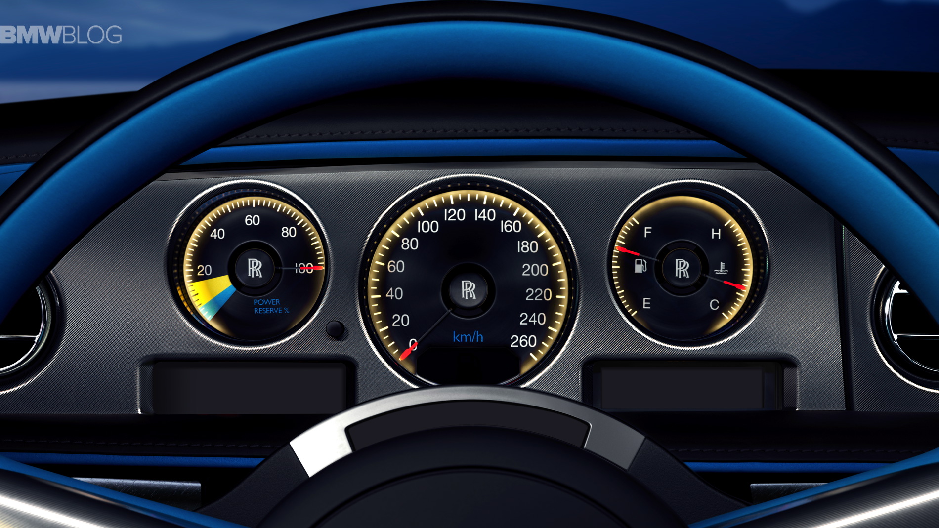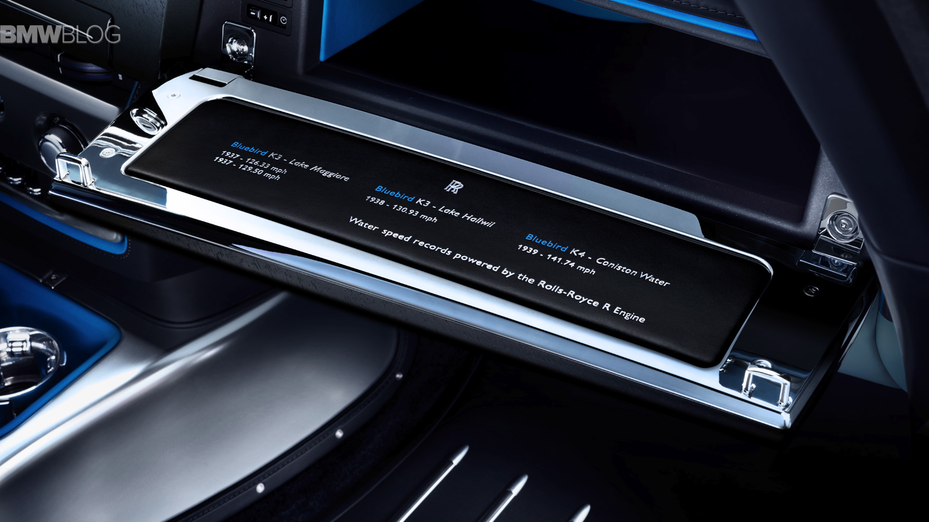 Further reference to Campbell’s craft is made via a new interpretation of the famous ‘power reserve’ dial. As the driver presses on, the dial moves backwards towards a yellow and blue zone, echoing Campbell’s original K3 boat’s ‘going into the blue’ at maximum engine revolutions. A Bespoke front-lit clock adorned with Bluebird’s infinity symbol and dials hewn from a billet of aluminium evokes K3 further. Direct tribute to the records is paid in the glovebox, with a hand-embroidered panel expressing the records Campbell achieved at Lake Maggiore and Coniston Water. Finally, the steering wheel is presented in two-tone for the very first time, with Magiorre Blue accents balancing perfectly with traditional black leather to complete a beautifully conceived interior design scheme.