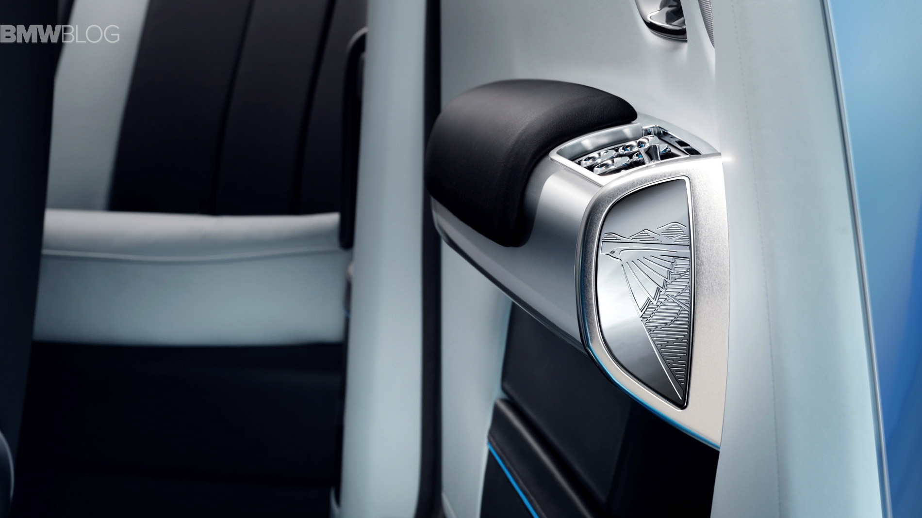 The car’s Maggiore Blue exterior finish is subtly echoed on the interior via accents on the dash-board that perfectly complement the Windchill Grey interior leather scheme. The marque’s hallmark attention to detail extends to the application of hand-engraved door armrest tunnel caps featuring a new interpretation of Campbell’s famous Bluebird motif. The armrests alone take eight hours to complete. Abachi wood also makes its Rolls-Royce debut in Waterspeed. By nature the material is cool to the touch with a satin-like tactility, and is bookmatched at an angle to echo the wake left by a boat moving at speed.