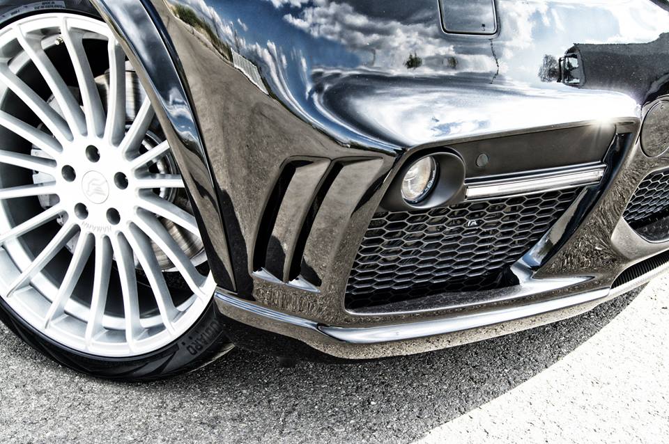 The F15 X5 gets several upgrades, both in style and power. The package begins with a wider body kit and a restyled front bumper which now incorporates LED daytime running lights. A fiberglass front lip with a clear-coated black finish is also available.