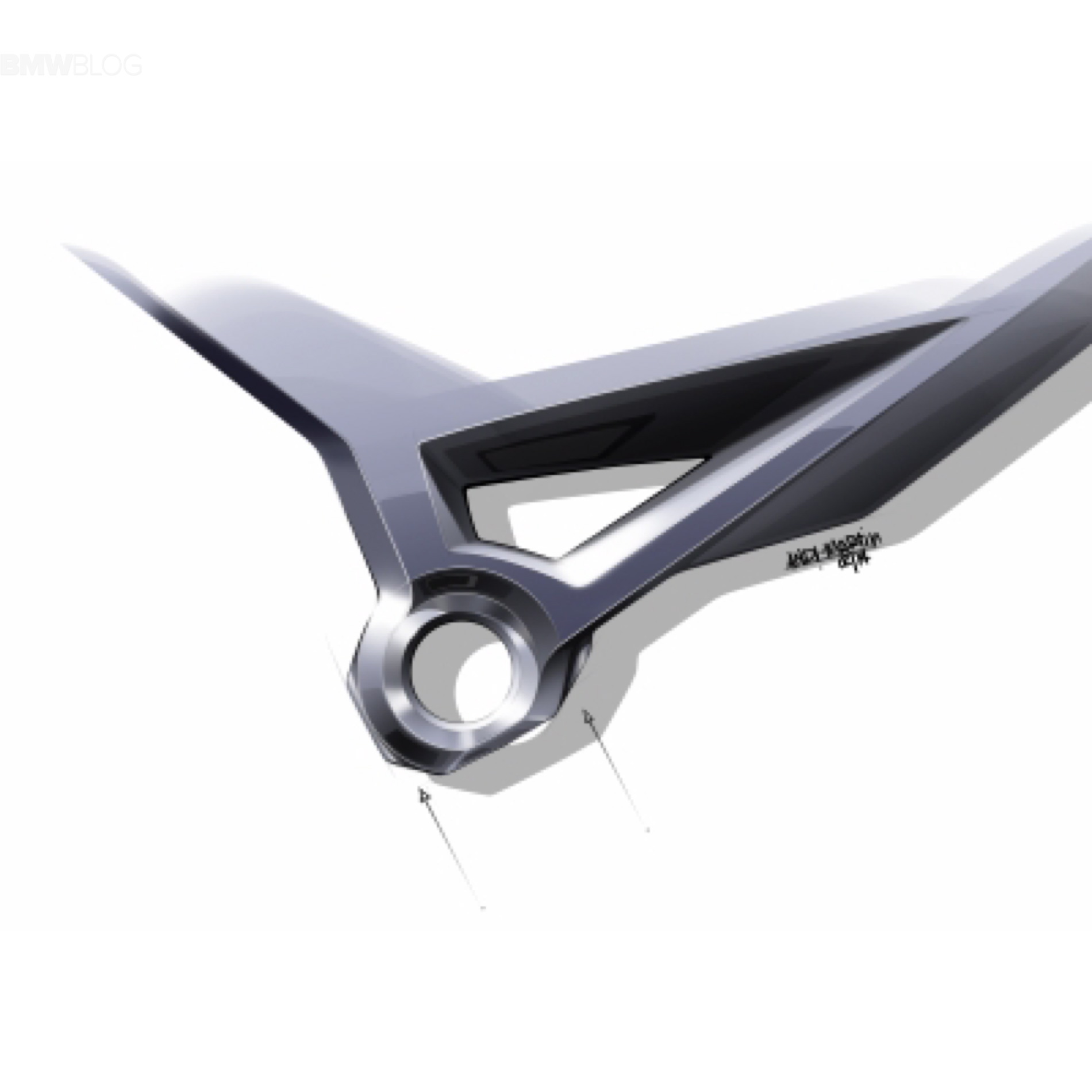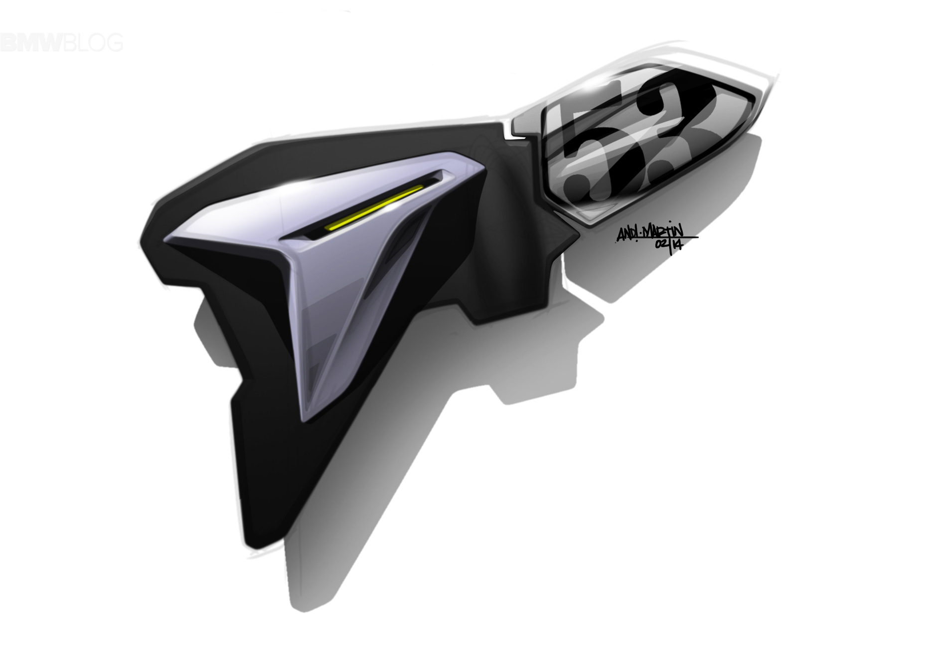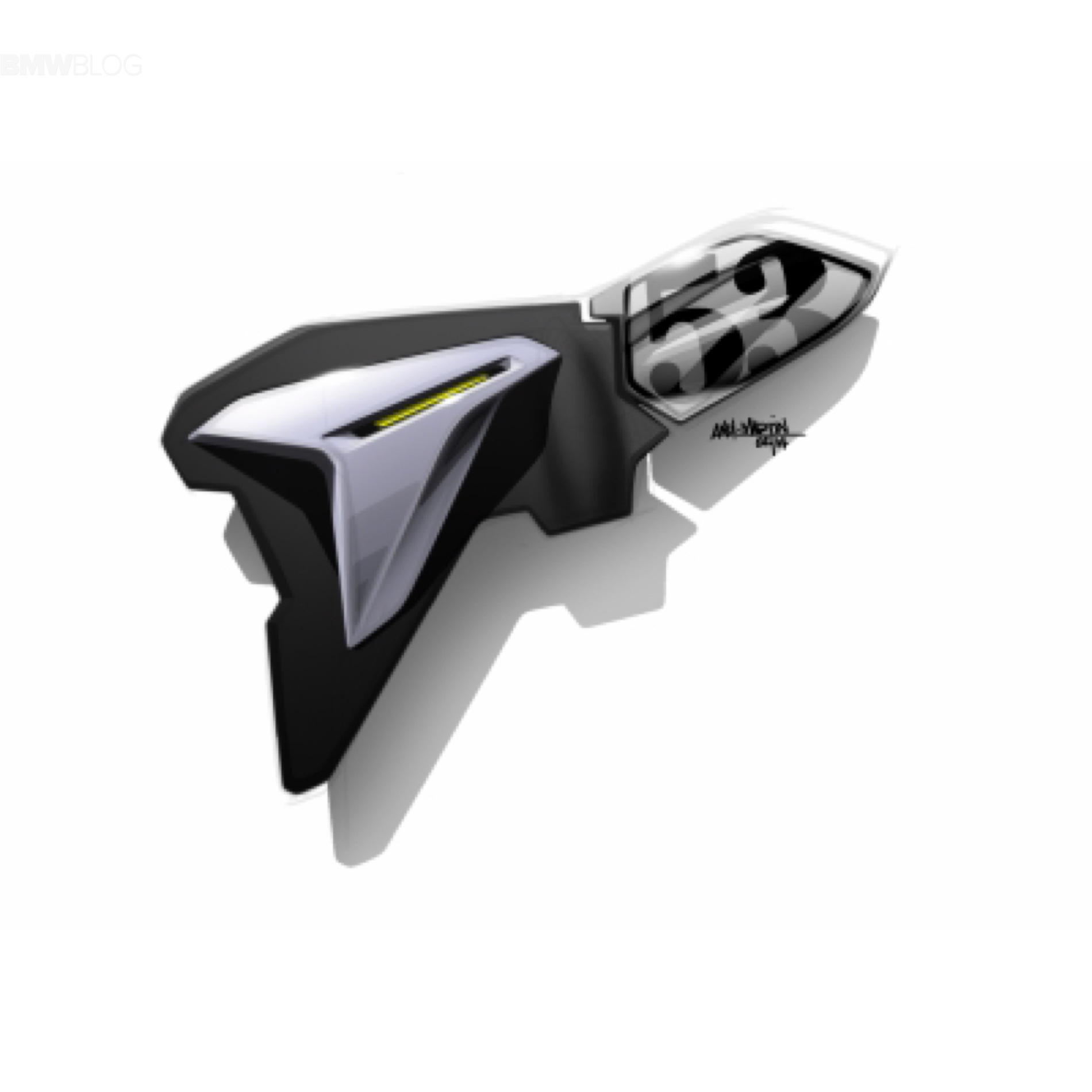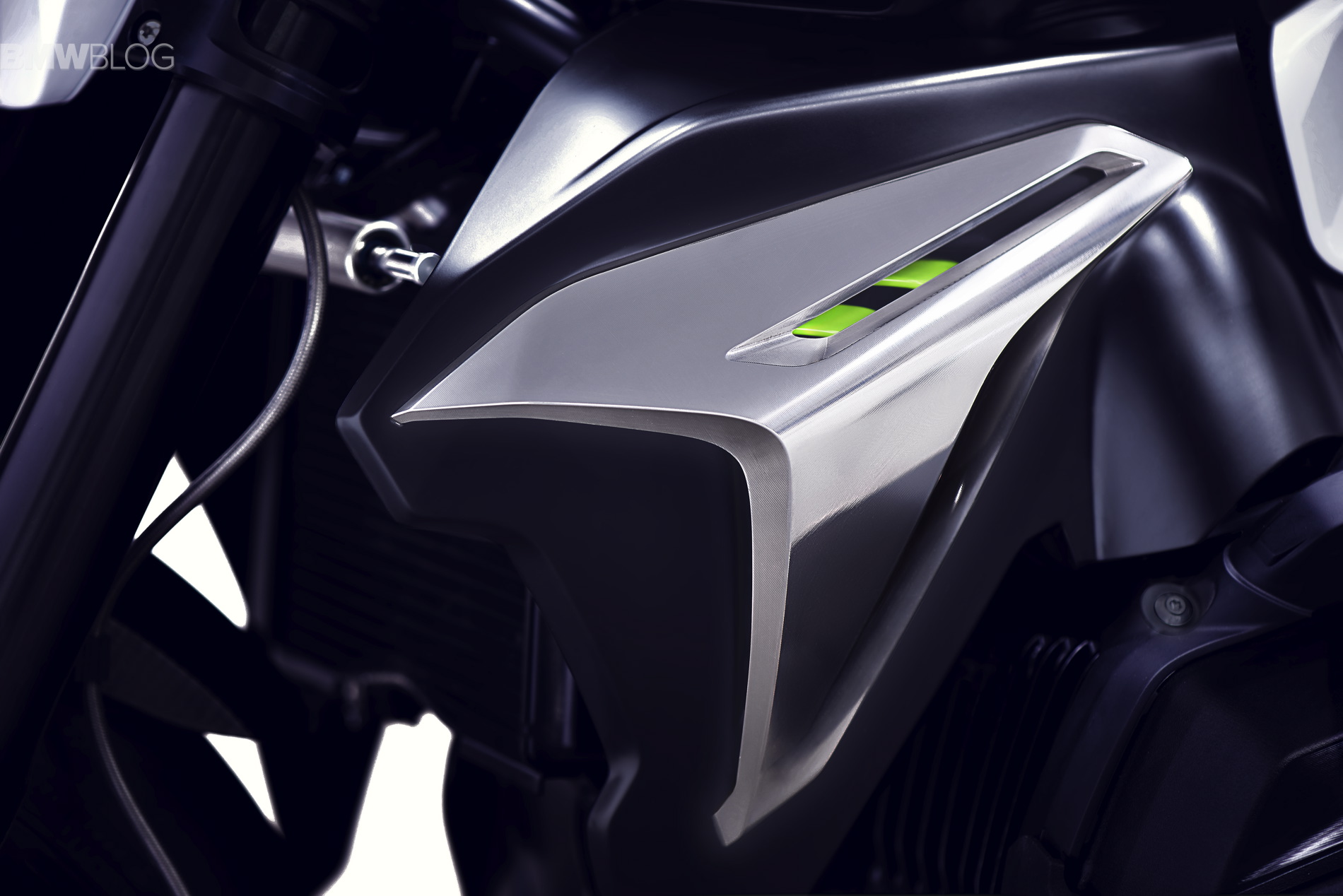 In addition to the rear structure, there are other milled aluminium parts which underscore the technically sculptured look from the side perspective. The most prominent features here are the lateral air intakes. They are also made of gloss aluminium with milling marks and are shown to excellent effect against the black surfaces of the radiator. They trace a triangle open to the front which is formally based on the “gill” elements of the BMW supersports motorcycles. Performing the function of channelling air to the radiator, they also emphasise the dynamic gesture of the side. The cooling ribs in Neon Yellow inside them are only seen on closer inspection.