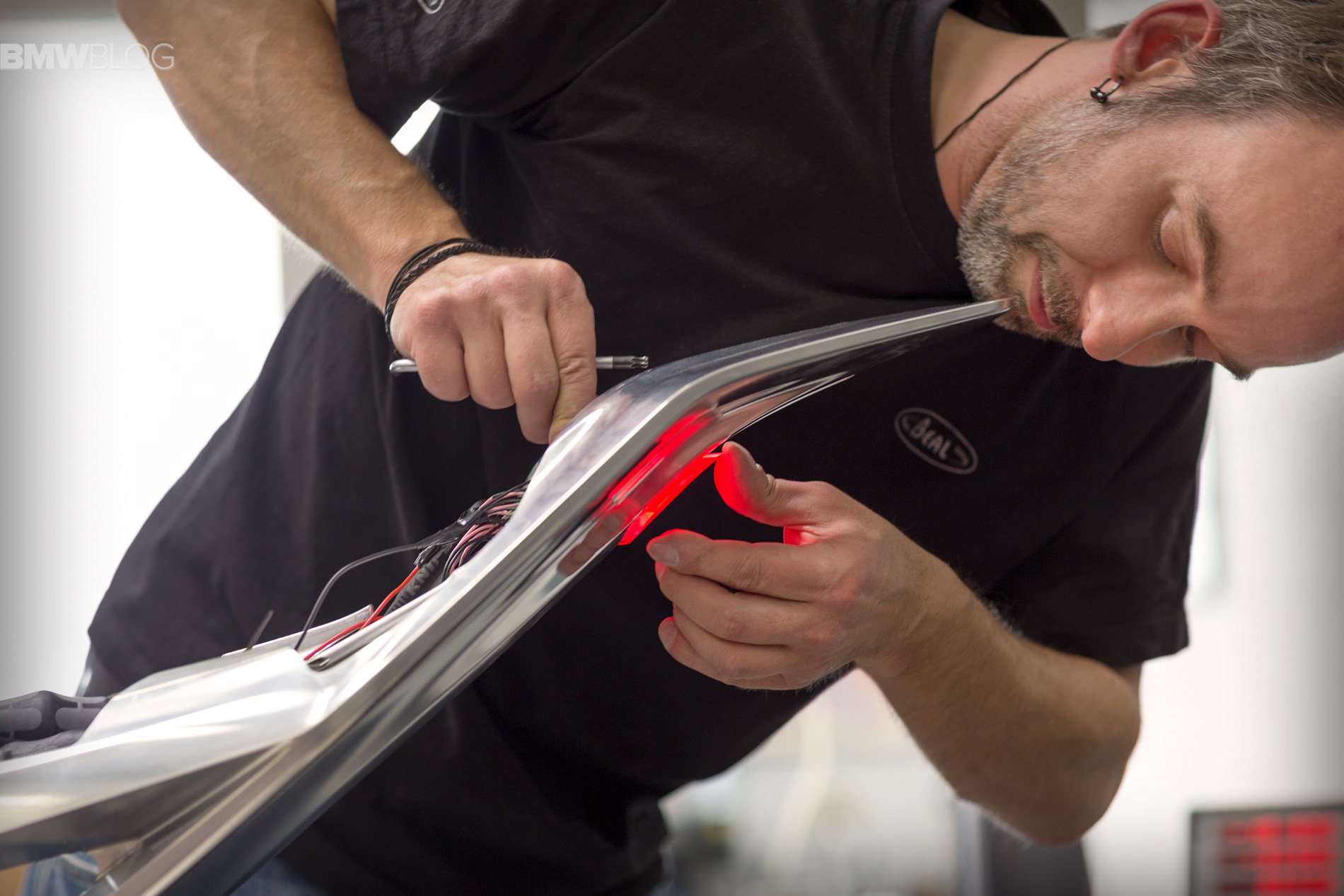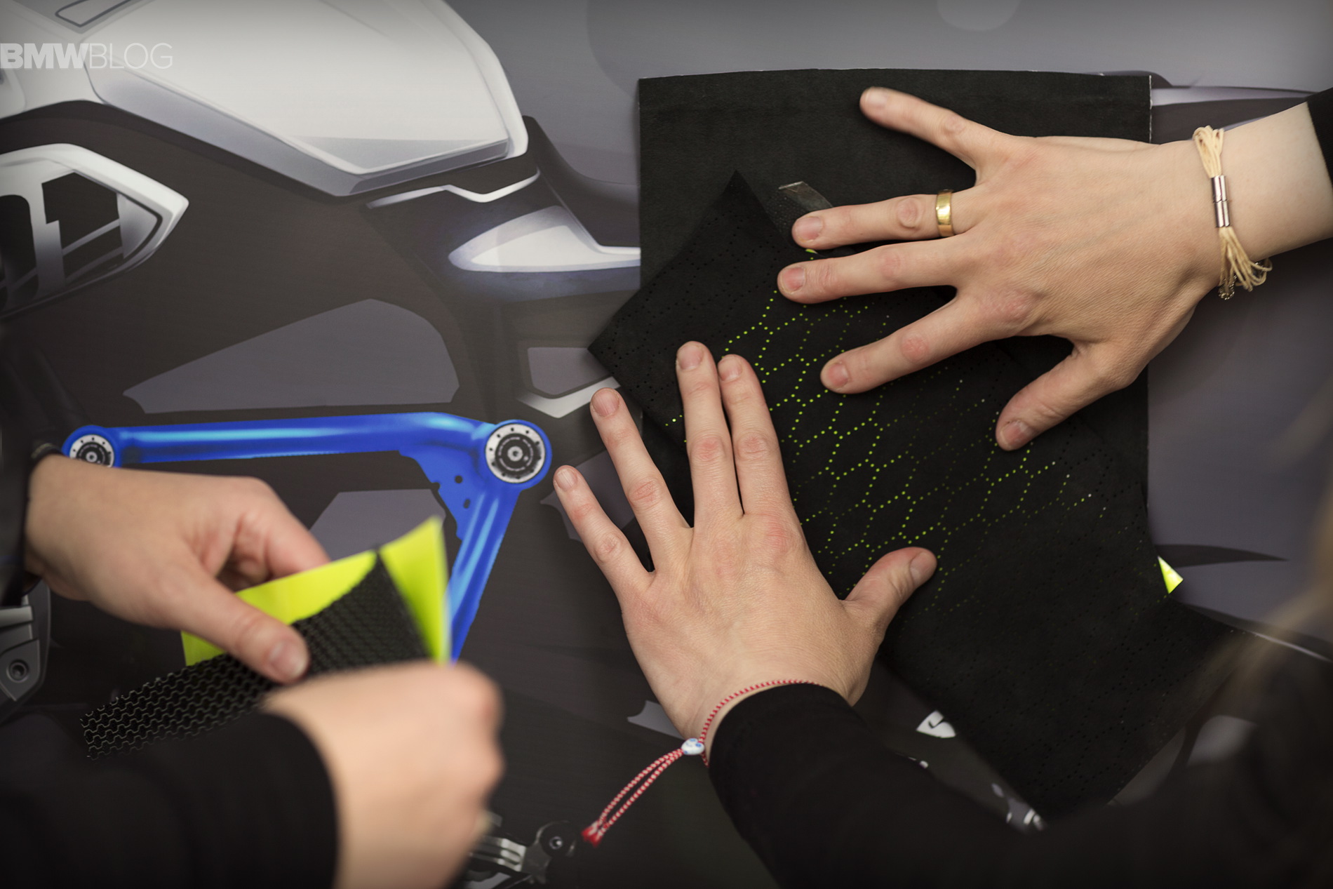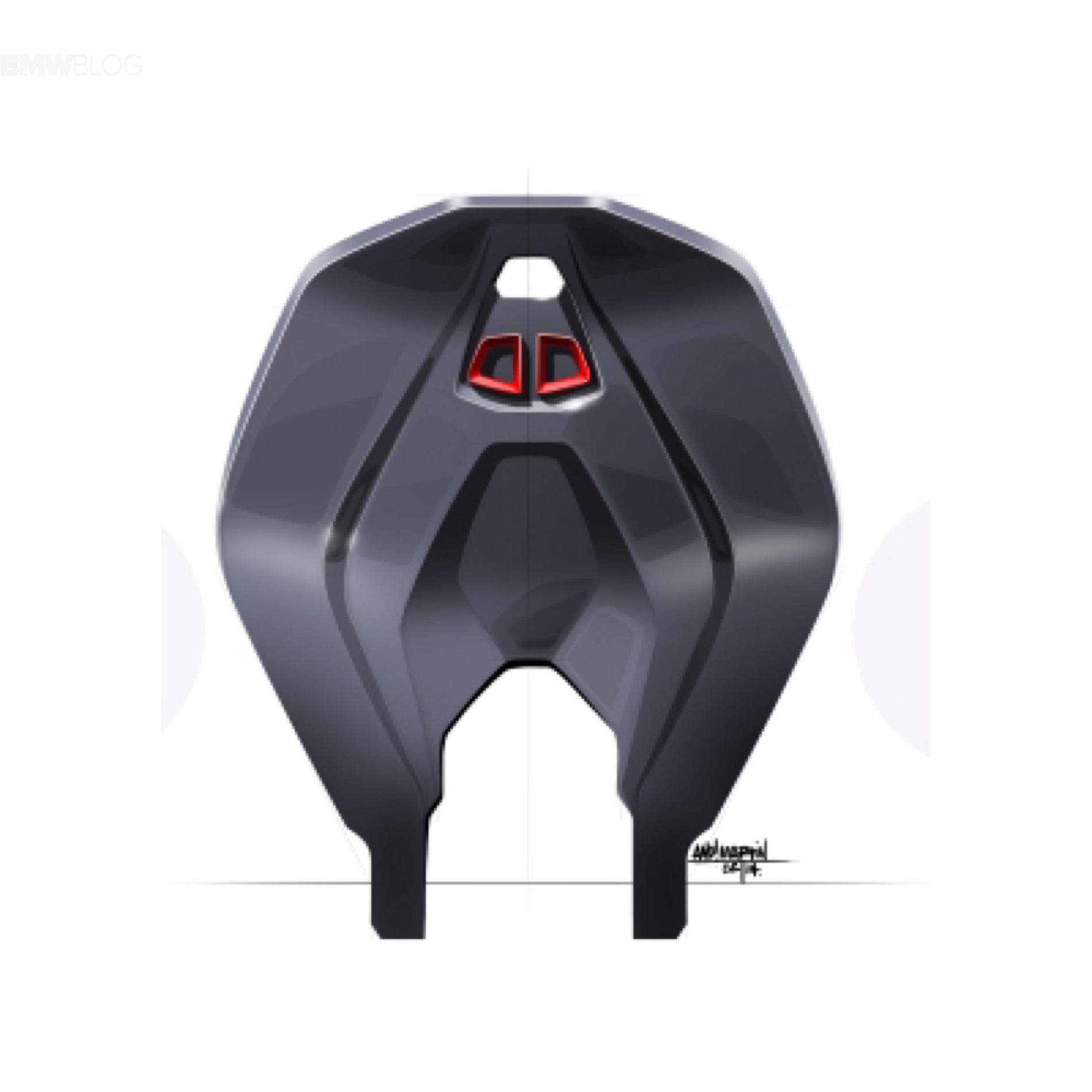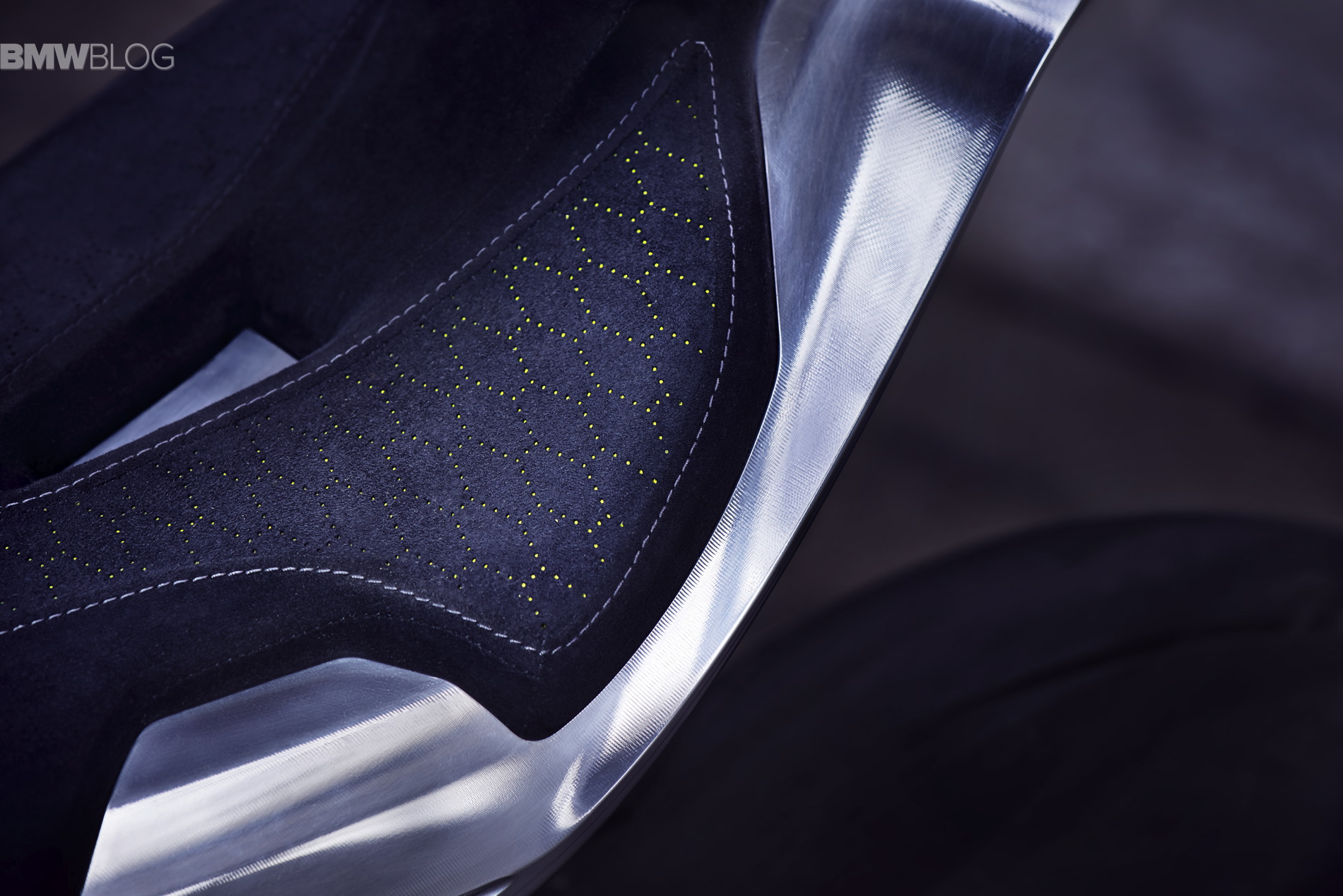 In addition to the rear structure, there are other milled aluminium parts which underscore the technically sculptured look from the side perspective. The most prominent features here are the lateral air intakes. They are also made of gloss aluminium with milling marks and are shown to excellent effect against the black surfaces of the radiator. They trace a triangle open to the front which is formally based on the “gill” elements of the BMW supersports motorcycles. Performing the function of channelling air to the radiator, they also emphasise the dynamic gesture of the side. The cooling ribs in Neon Yellow inside them are only seen on closer inspection.