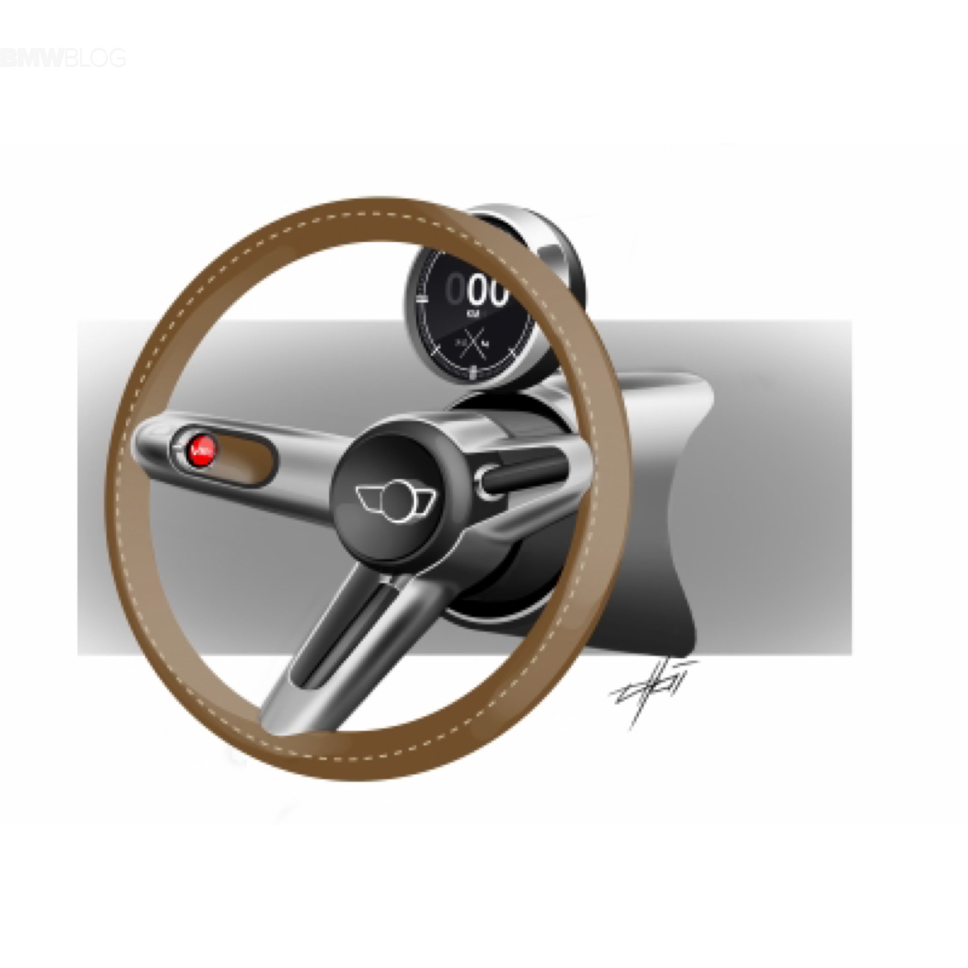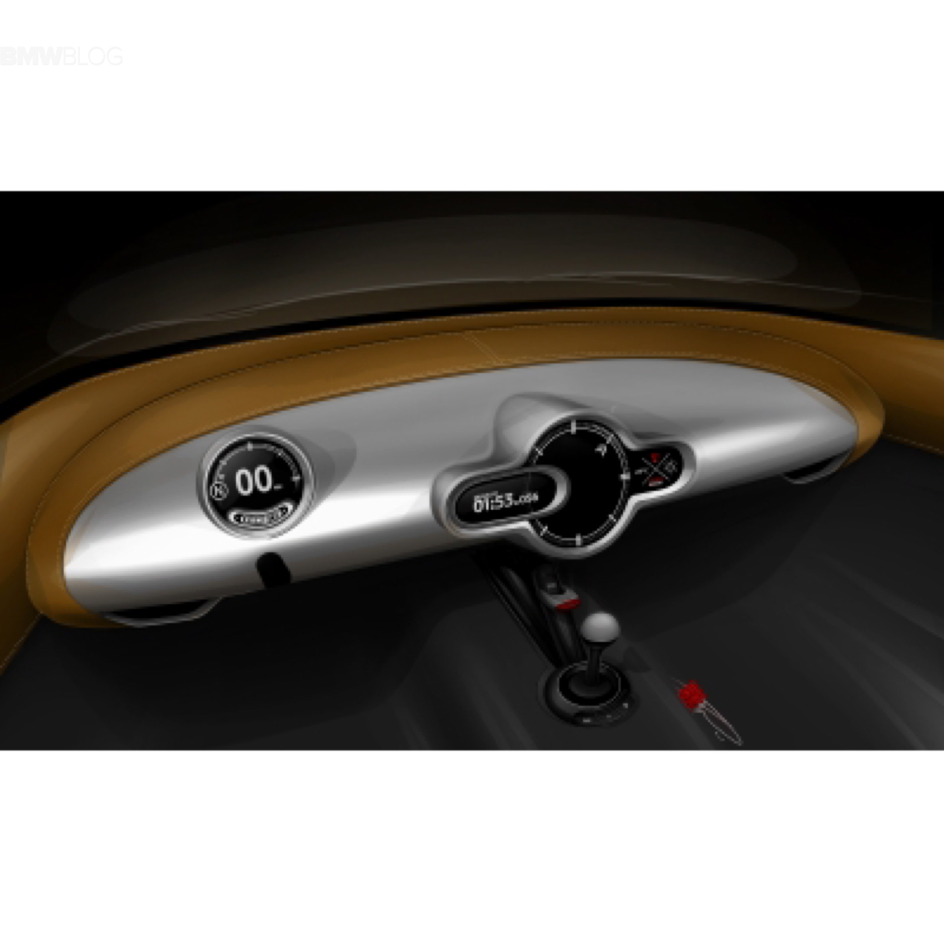 The Center Instrument in the middle of the instrument panel draws on MINI design styling and has been extended for the MINI Superleggera™ Vision to include a touch-sensitive control element and two circular instruments with metal surrounds on the right. In addition to the analog clock on the far right, the second framed instrument activates the camera which is integrated between the driver and front passenger seat. It has the function of capturing those particularly worthwhile moments on the road.