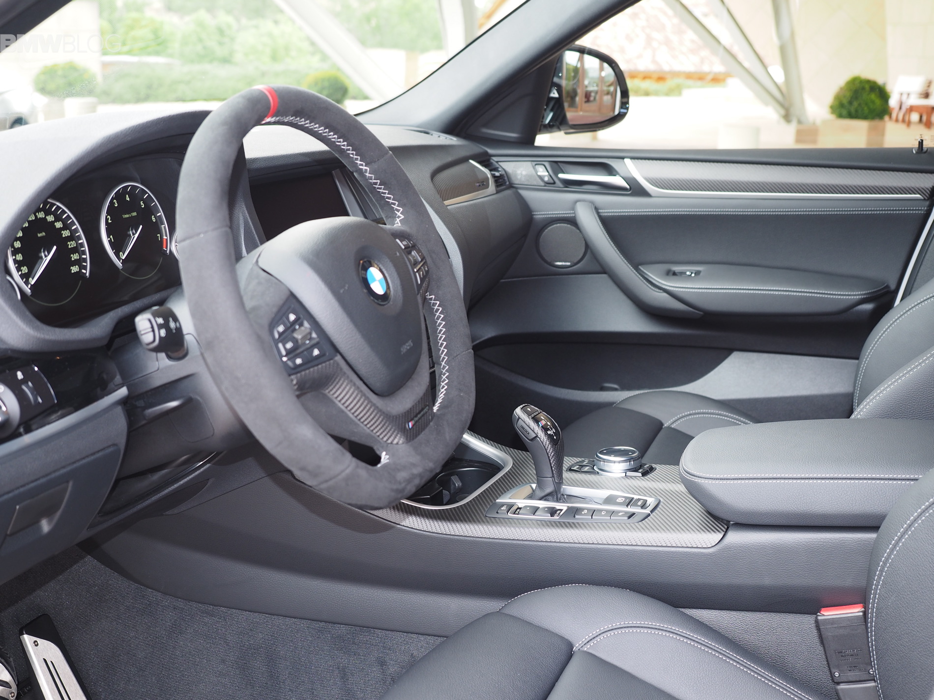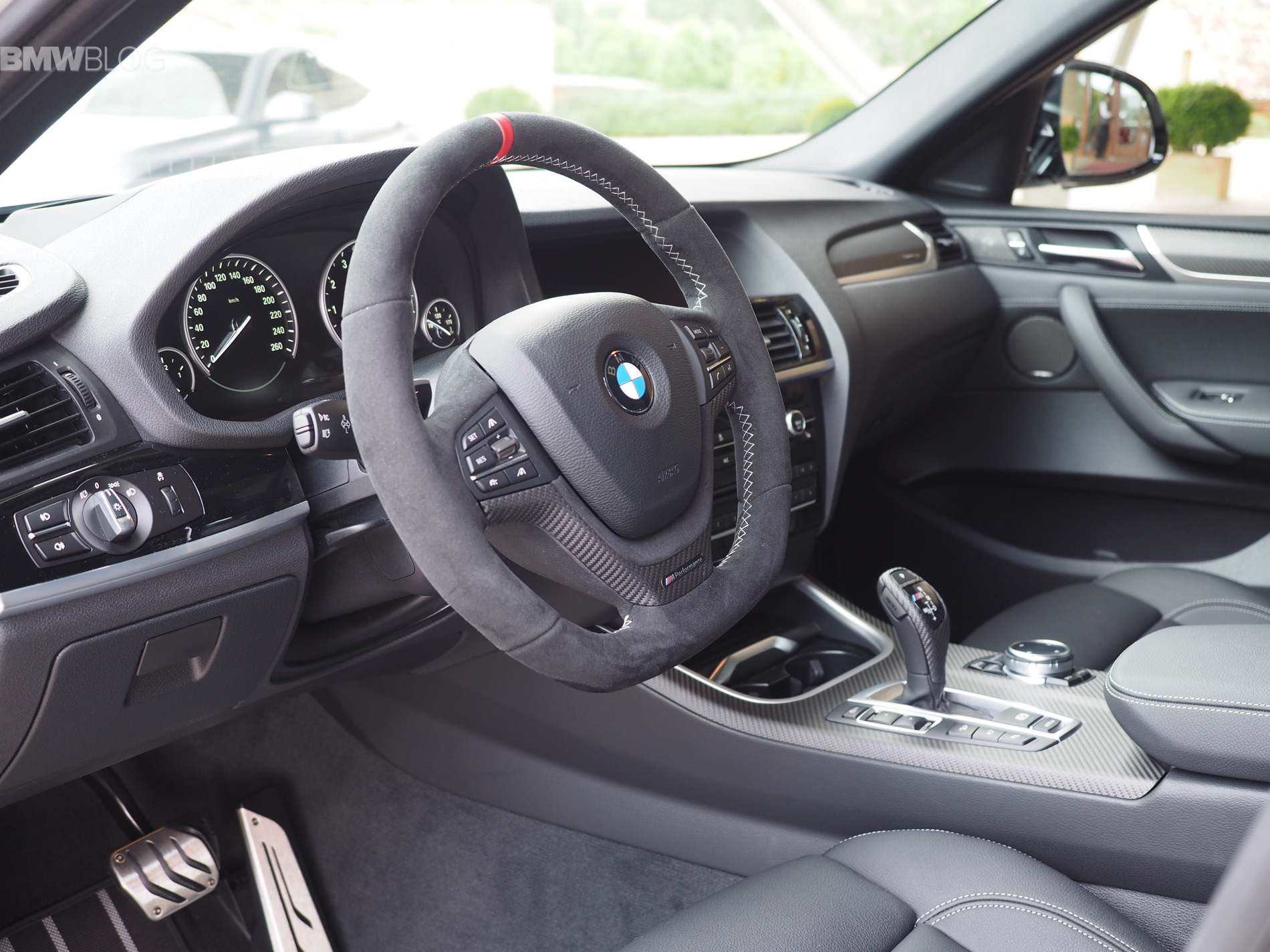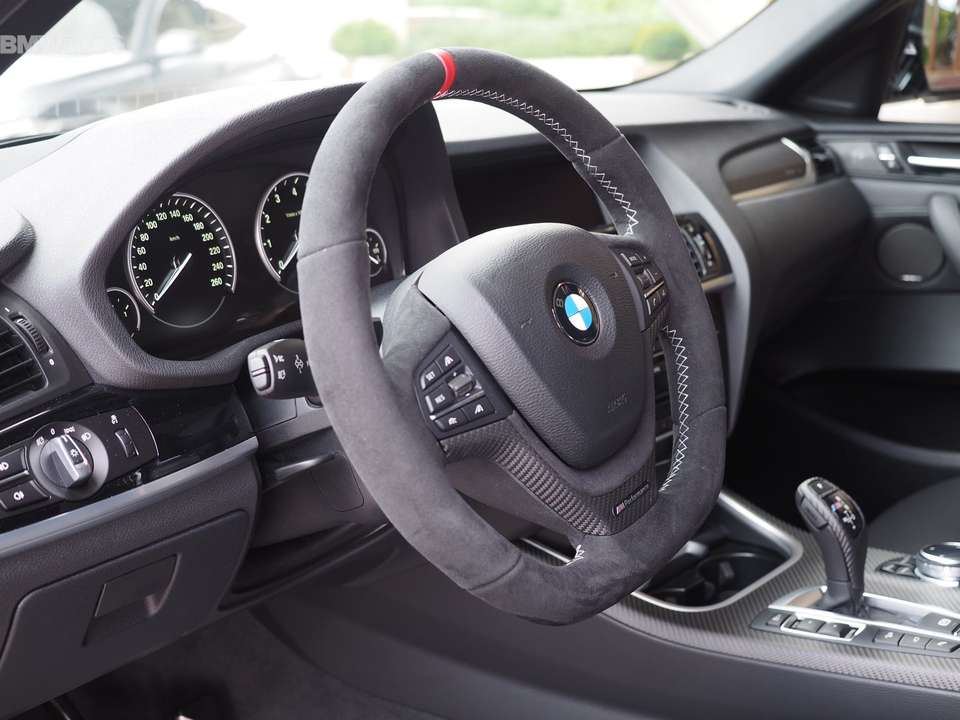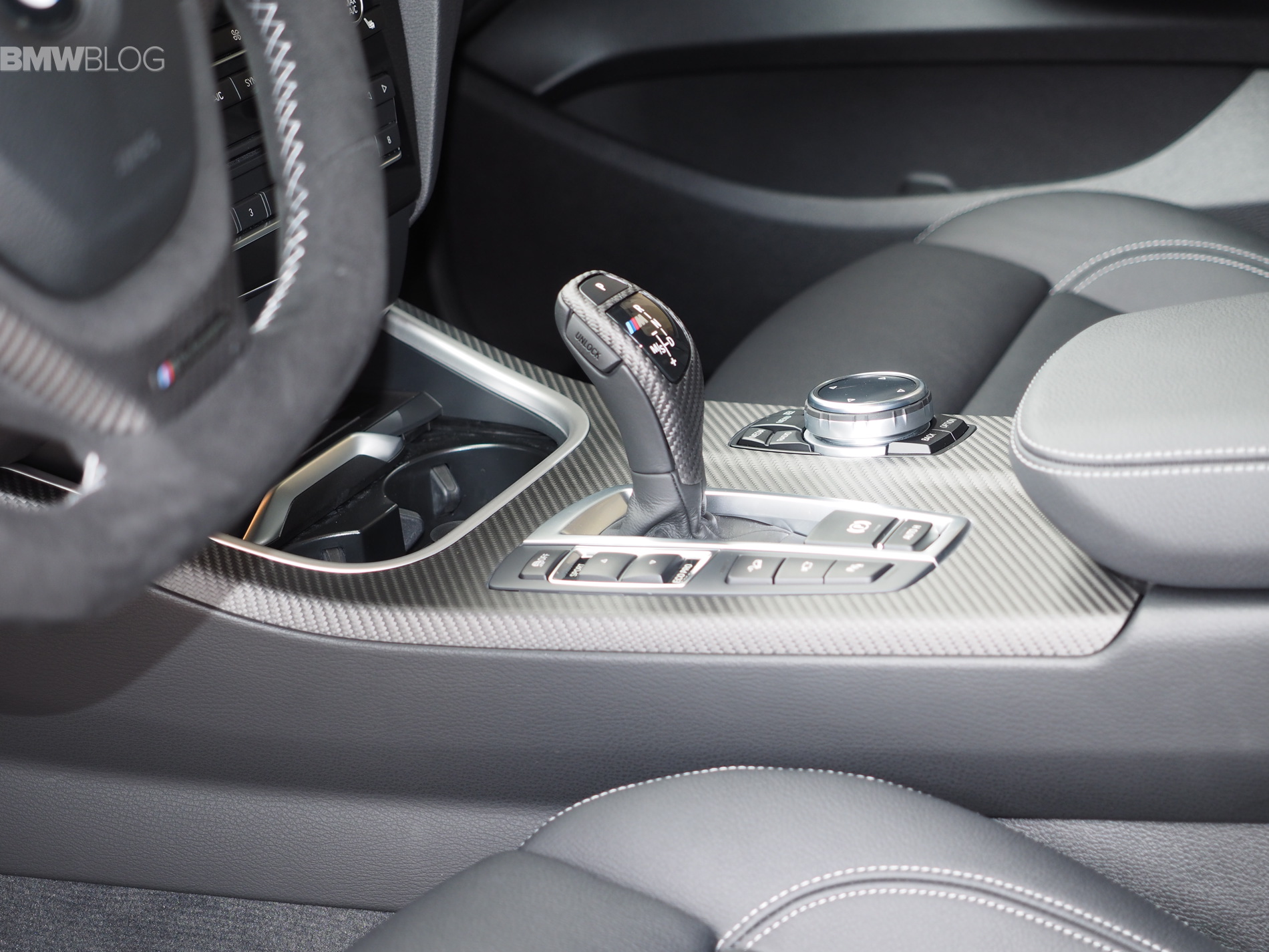 Inside the cabin, the M experience kicks off with the M Performance Steering wheel in Alcantara. The carbon fiber trim replaces the wood or aluminum found in the “standard” models. Even the gear shifter gets a carbon fiber wrap.
