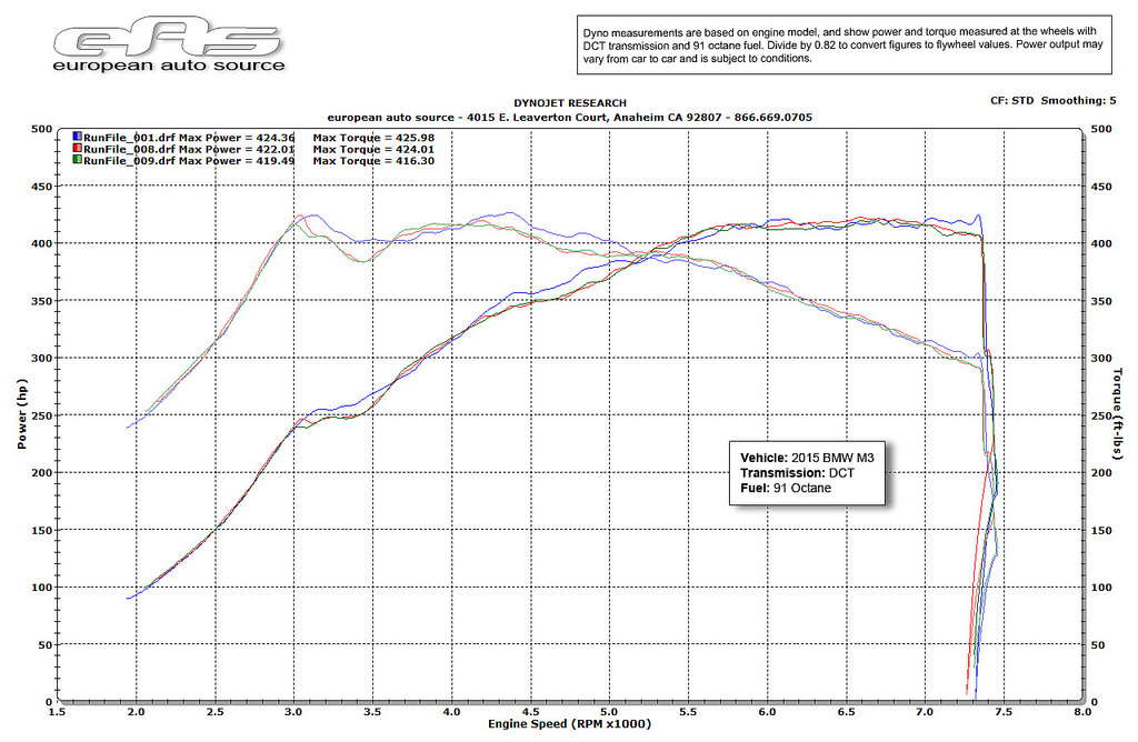The dyno numbers are what really impressed us, though. BMW claims this motor makes 425hp and 406lb-ft tq at the crank; on the EAS Dynojet this M3 recorded 424hp and 425lb-ft tq at the wheels!