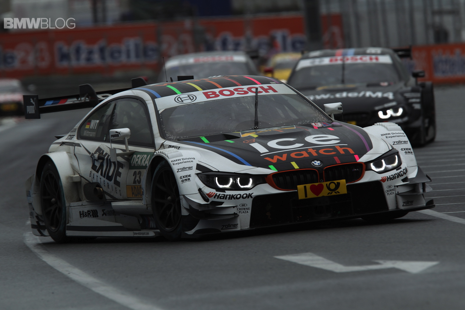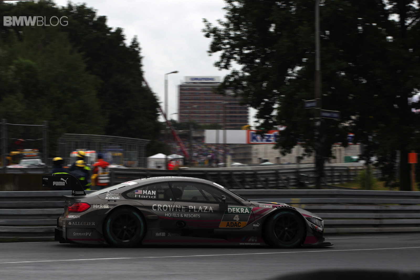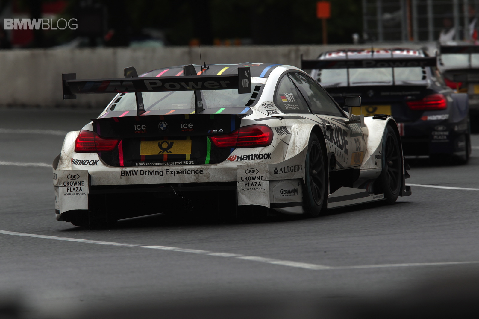 Joey Hand (US), at the wheel of the Crowne Plaza Hotels BMW M4 DTM, also produced an impressive display to finish seventh behind Wittmann on a track that was wet at first but dried out as the race progressed. Victory went to Mercedes driver Robert Wickens (CA).