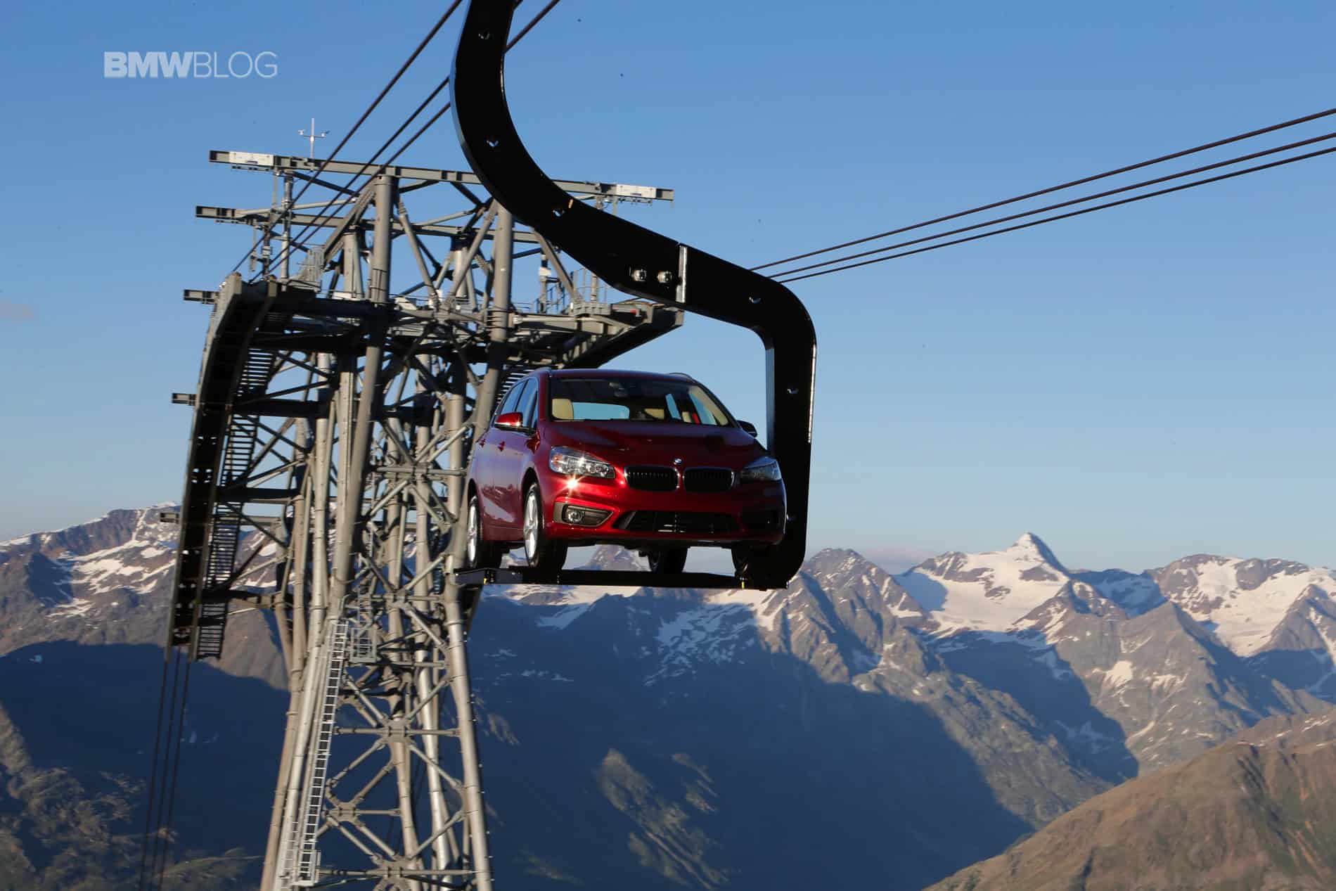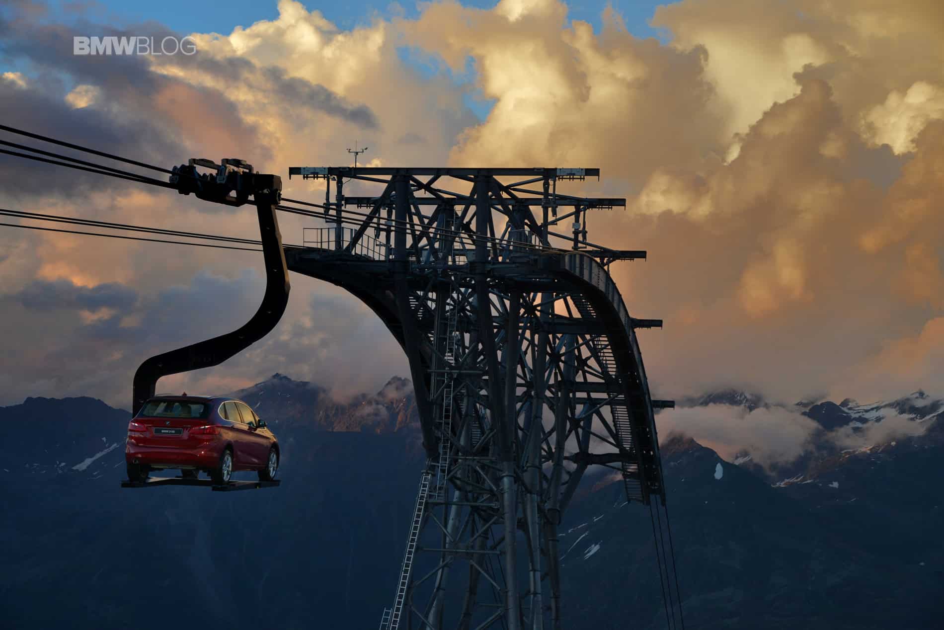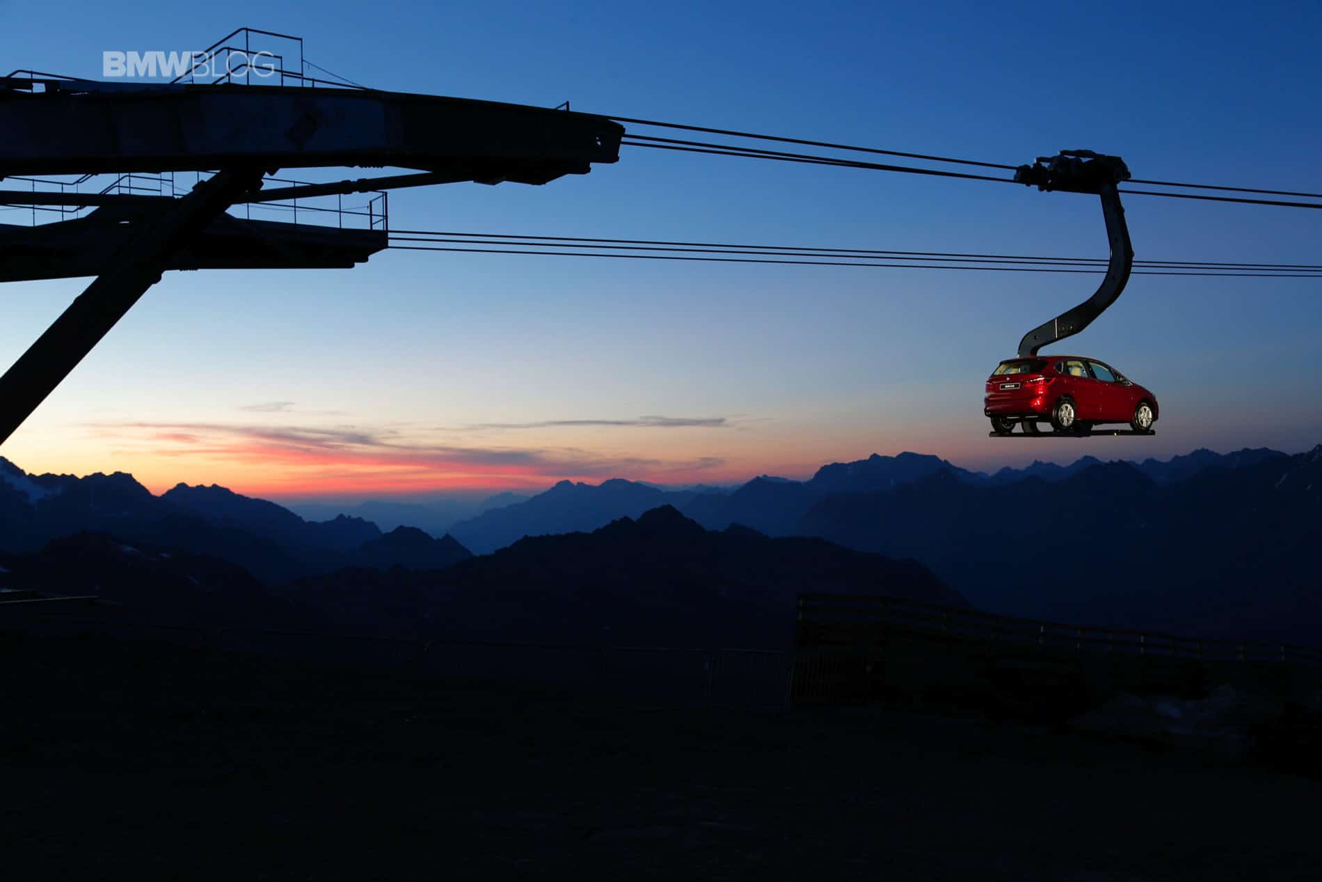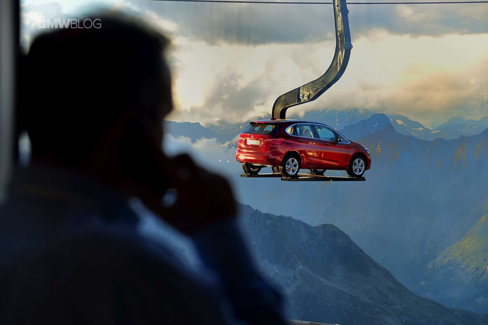 To make things even more interesting for journalists, BMW decided to hold the press conference at 2100 meters above the ground. Transport to the event and then to the Ice-Q restaurant at 3048 meters was arranged with mountains gondola. But to everyone’s surprise, journalists weren’t the only ones being taken to the top of the mountain. A 2 Series Active Tourer was suspended on a platform and was set in motion up and down the mountain, a sight that you rarely see.