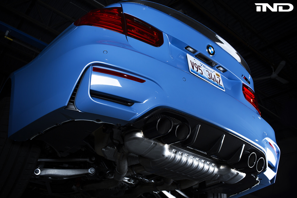 The aero options from the performance division provide a sportier and more aggressive look while maintaining the stock design lines. The Yas Marina Blue M3 just got a small, but equally important in both performance and design part that further accentuates the rear of the vehicle nicely. This rear diffuser is part of a bigger lineup of BMW Performance Parts for the M3/M4 and consists of: carbon fiber front splitters, trunk spoiler, rear diffuser and mirror covers.