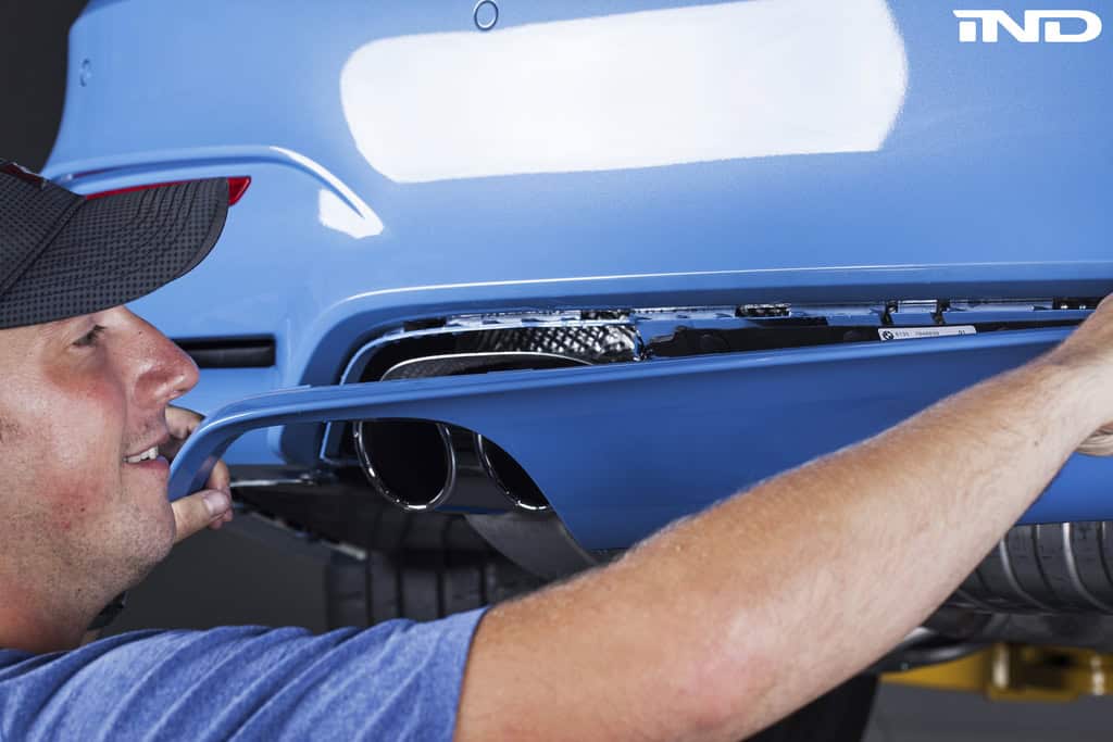 With the diffuser removed it is now time for install of the M Performance carbon fiber diffuser. This piece utilizes all 4 8mm screws and the existing body clips. Step 1 of the installation is to lineup the clips and carefully press into place.
