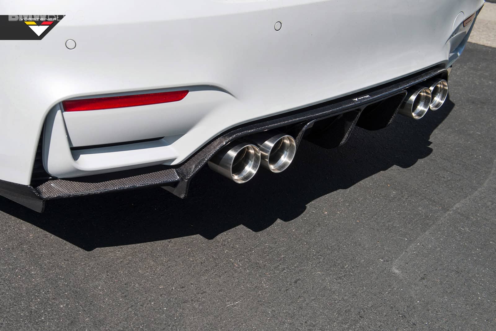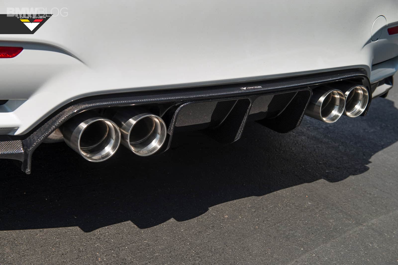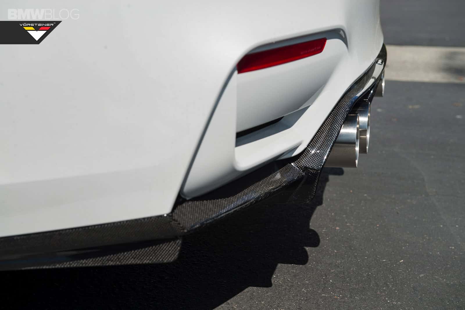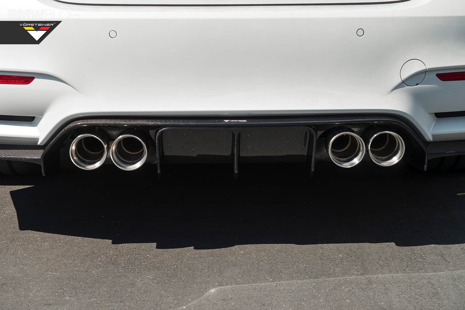 The full Vorsteiner package for the F8x M3 and M4 chassis includes Forged or Flow Forged wheels, carbon add-on front spoiler, carbon rear diffuser element, custom livery foil kit, embroidered velour floor mats, and not pictured are the exclusive stainless dual walled exhaust tips in brushed or diamond black finish.