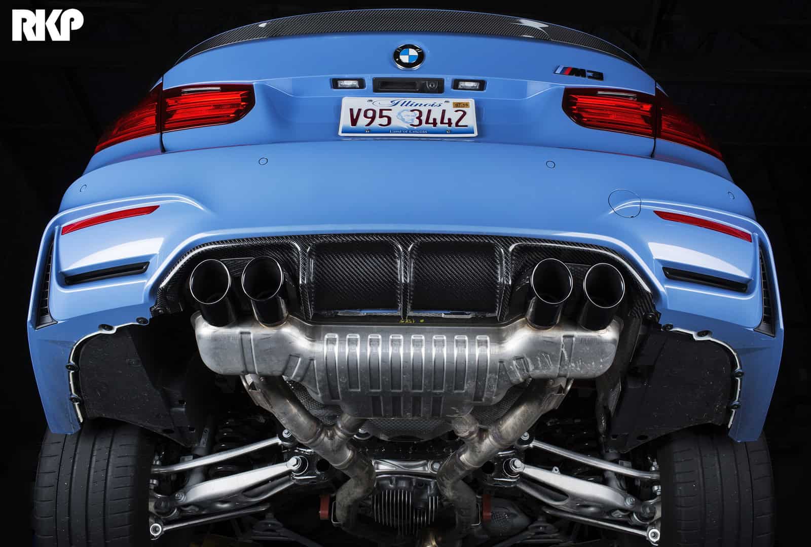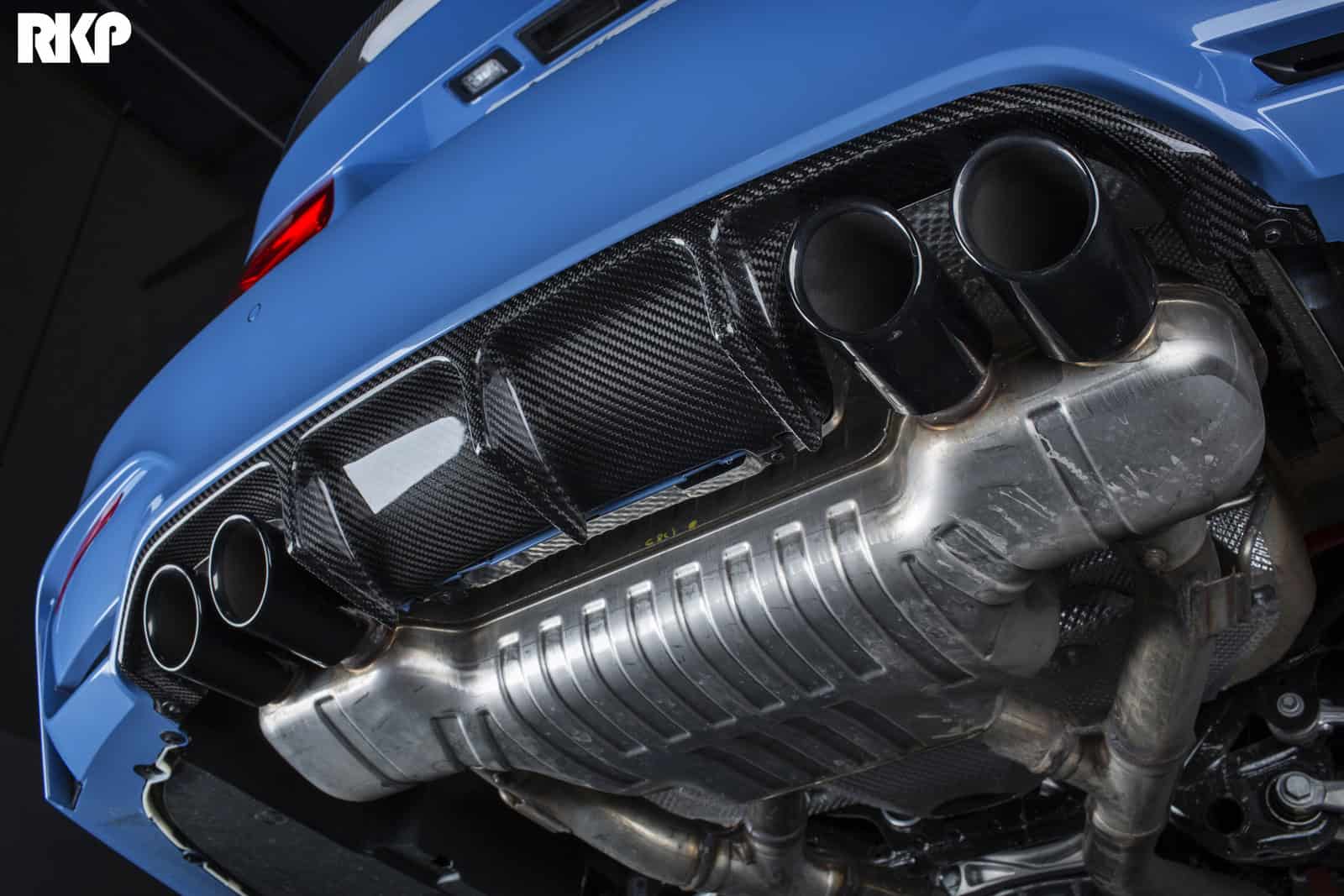 Tuning-shop RKP created a carbon fiber rear diffuser which perfectly matches, not only the rear-end design of the new M3/M4 but also the beautiful Yas Marina Blue color.