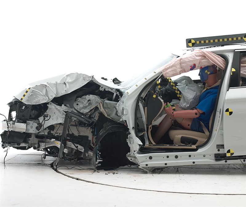 IIHS’ testing shows that the the structure of the BMW jutted into the driver’s space by as much as 12 inches, with intrusion being worst at the lower end of the compartment. However, airbags performed as intended. The impact would have likely caused substantial injuries to the driver’s left leg.