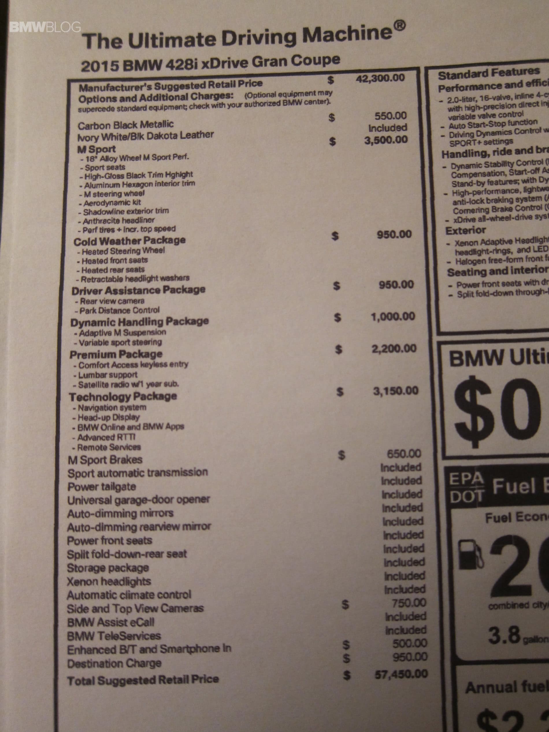 MSRP $41,250 428i Gran Coupe  – Milage 23 city/ 37 hwy