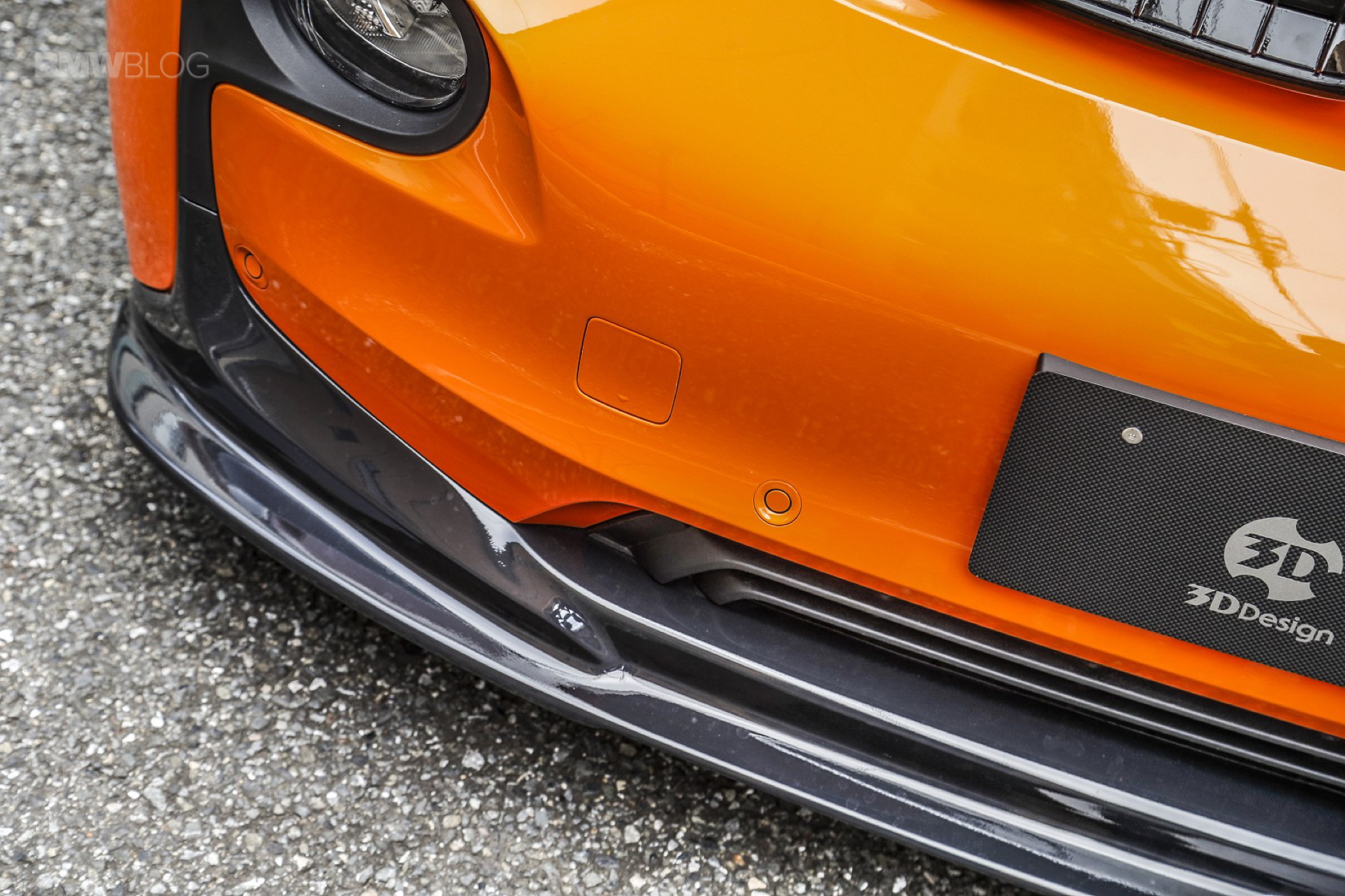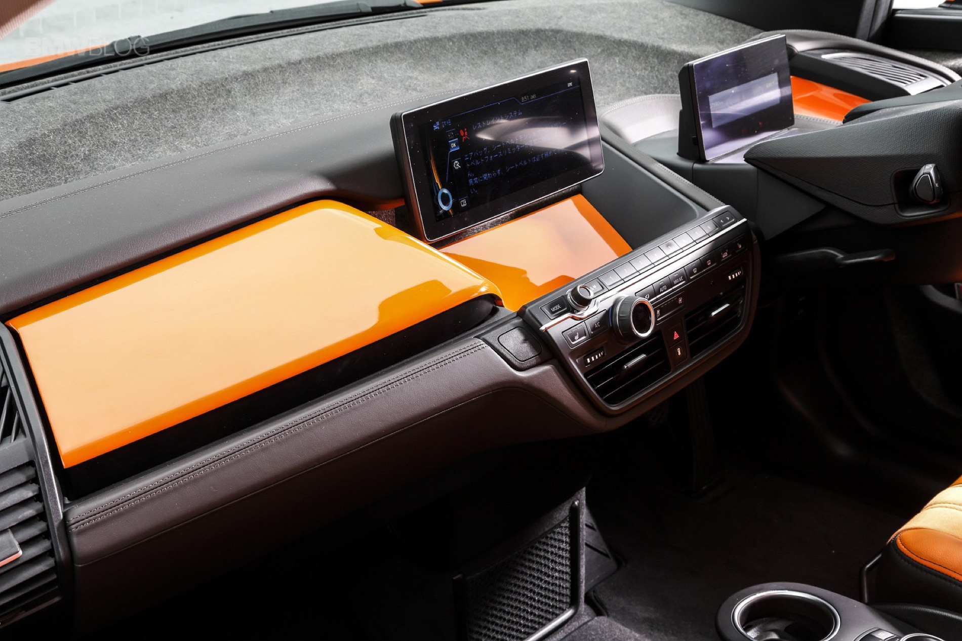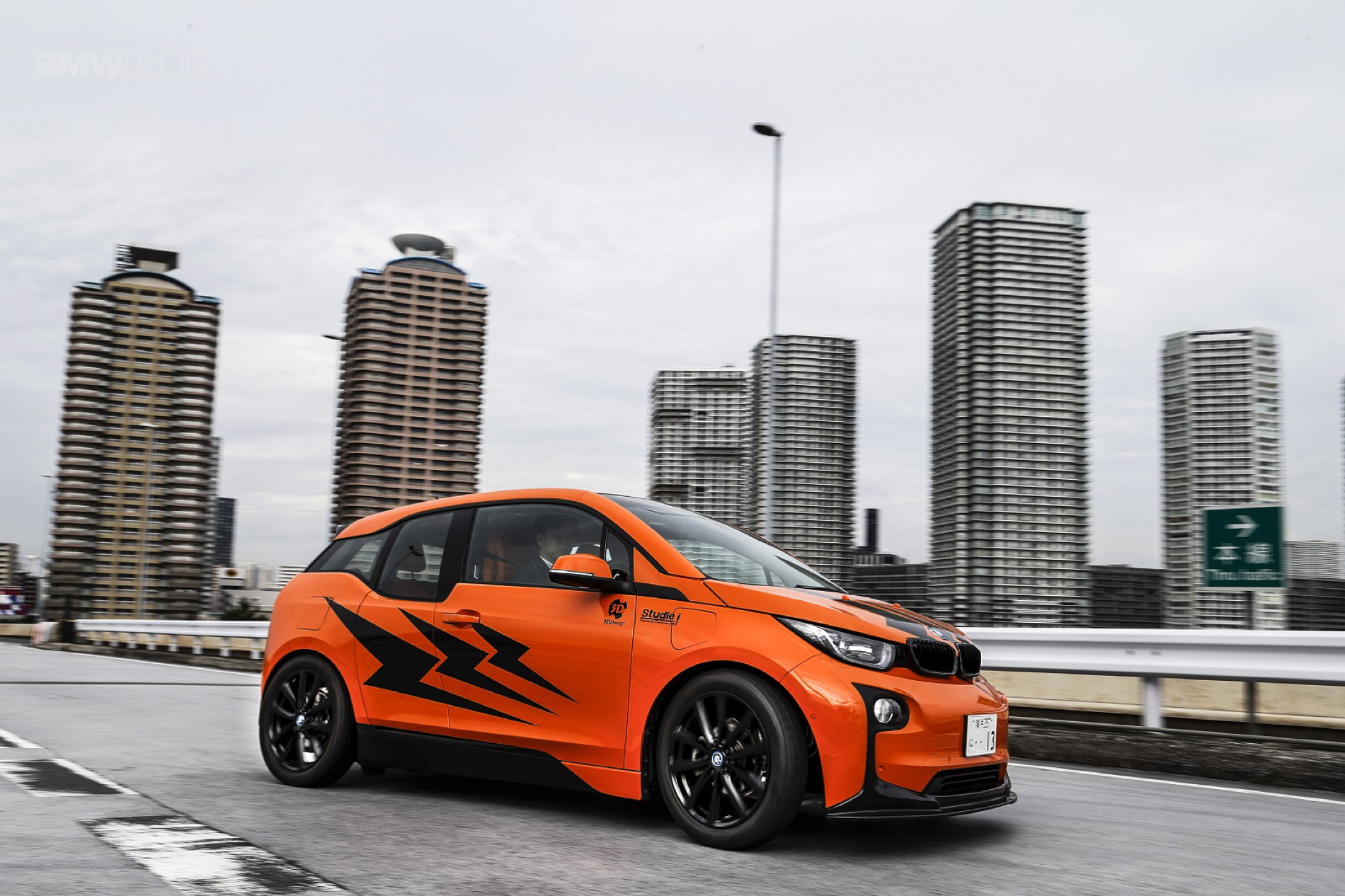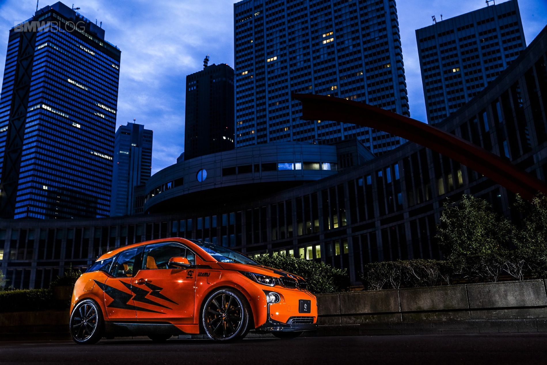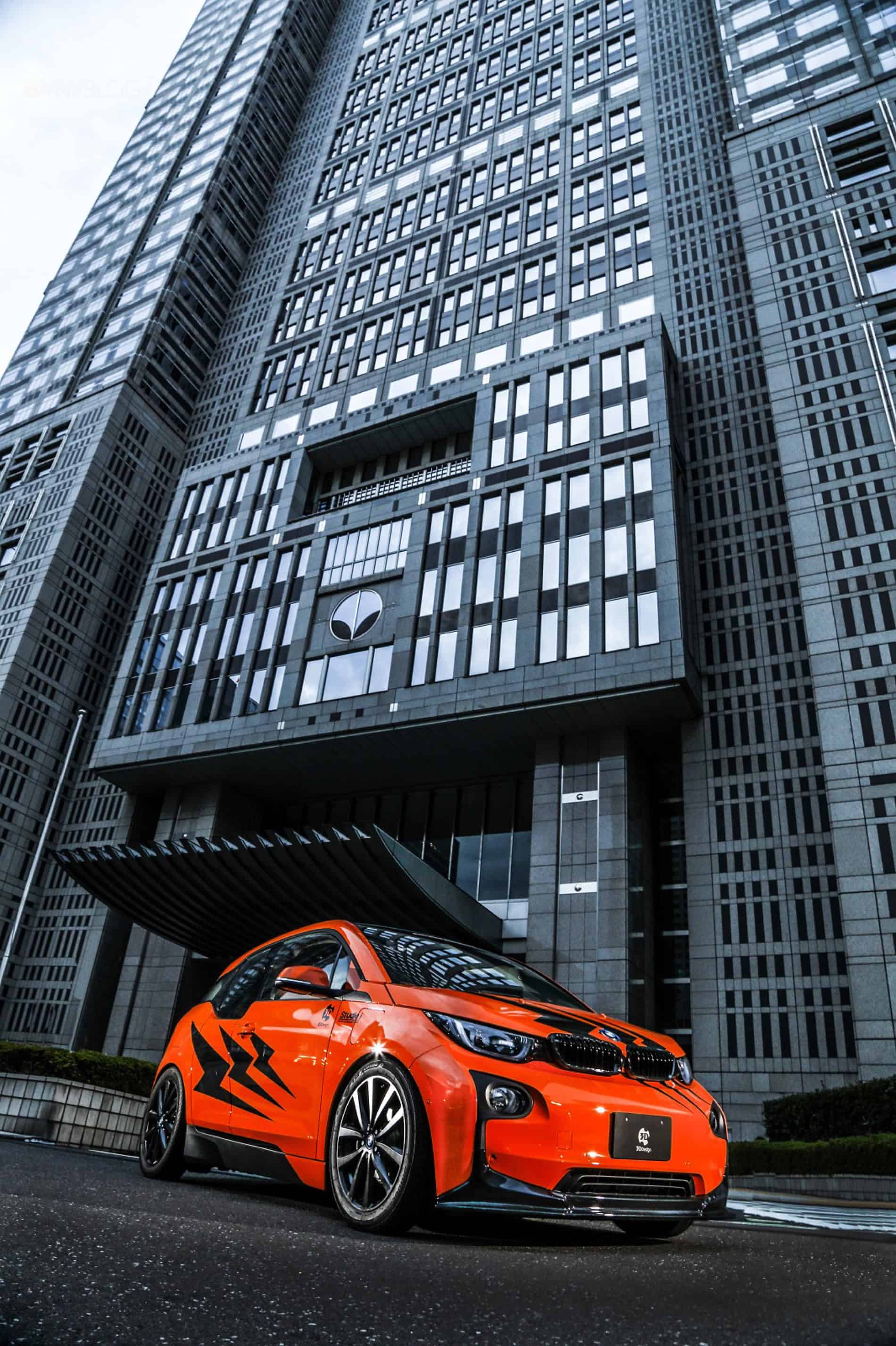 With the i3’s newly found sporty color transformation, the next area that needed attention was the ride height. The Japanese version of the i3 is already 20mm lower than worldwide i3’s, but for the aggressive color change an even lower vehicle stance must be achieved. As a solution, Studie is developing a suspension setup that brought the car down an additional 30mm. 3D Design built upon the flowing lines of the i3 with a more pronounced front lip spoiler and roof spoiler. The two components provide some much needed balance to the boisterous fire orange paint. Taking inspiration from the F chassis ///M cars, Studie built a custom front grill set with integrated blue LED’s.
