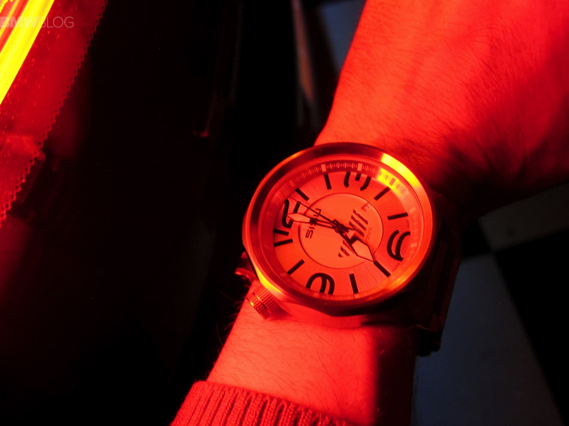 When I hit the face of the watch with the intense LED lights from our long term i3, the Superluminova coated luminescent hands really lit up.