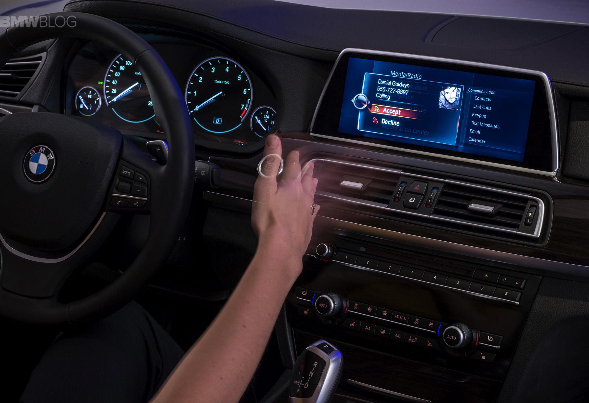 The true innovation comes through from the non-contact gesture recognition. The driver or front passenger simply performs a directed gesture in the area between the gear lever, steering wheel and Control Display. A 3D sensor in the roof detects whether one or two fingers are being pointed, or whether the thumb and index finger are being moved towards each other. The system decodes different movements – such as tapping, finger rotations or a swiping movement to the right – and performs the desired input. A rotating movement can be used, say, to alter the volume of the radio, a finger raised to accept a phone call or a swiping movement to decline a call.