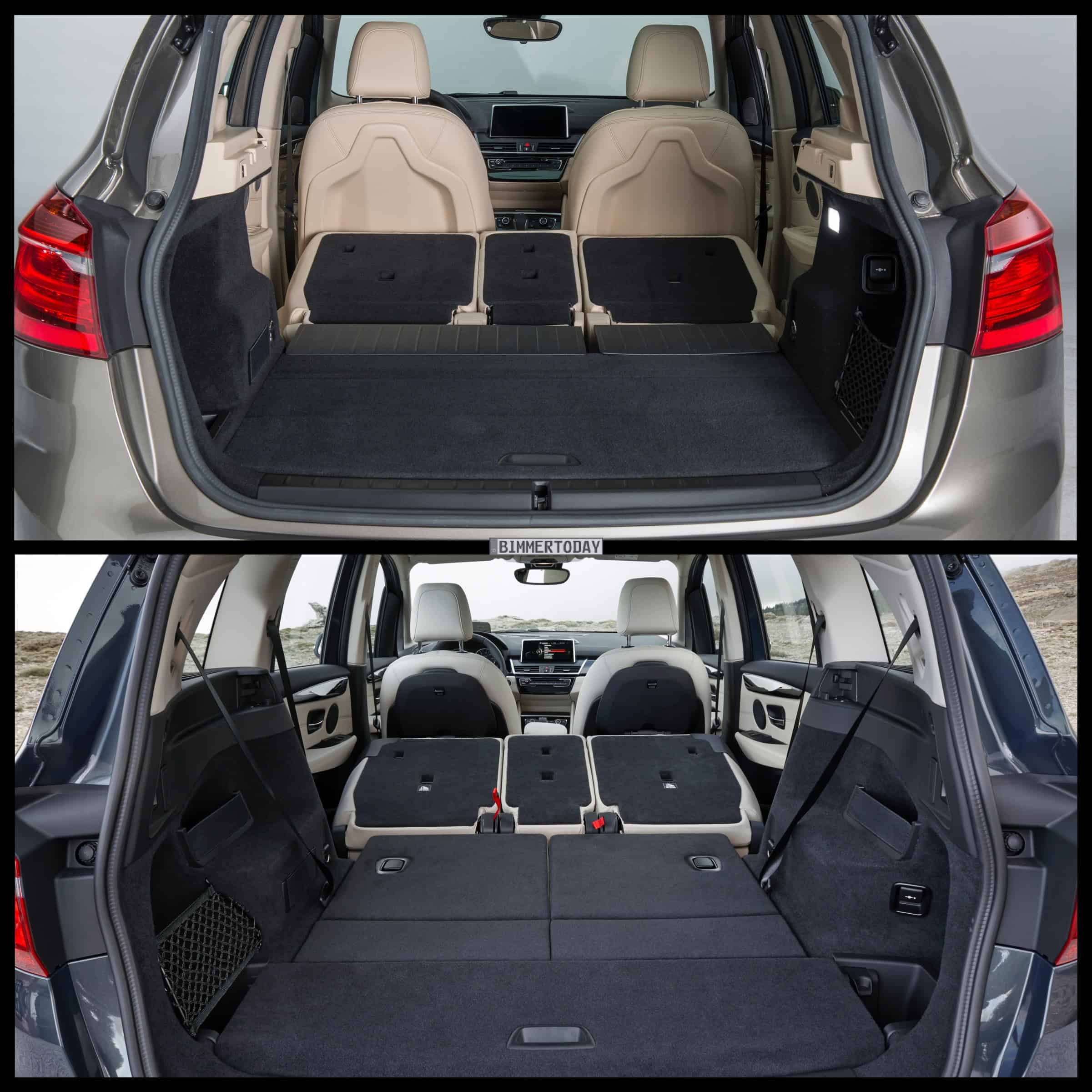 The BMW 2 Series Gran Tourer dominates his little brother by 21 cm while being also 5 cm higher. Our image comparison also shows the steeper rear window which creates a higher roofline for additional space, and the larger rear doors which facilitate entry into the second and third row.